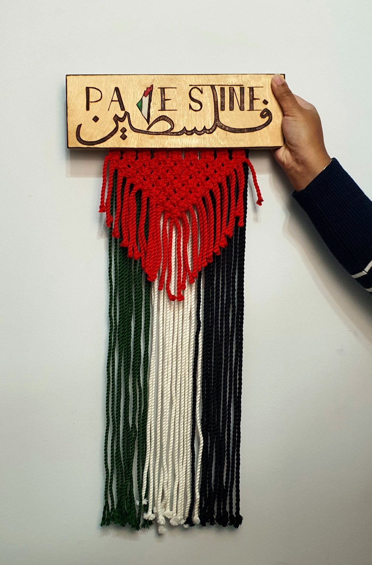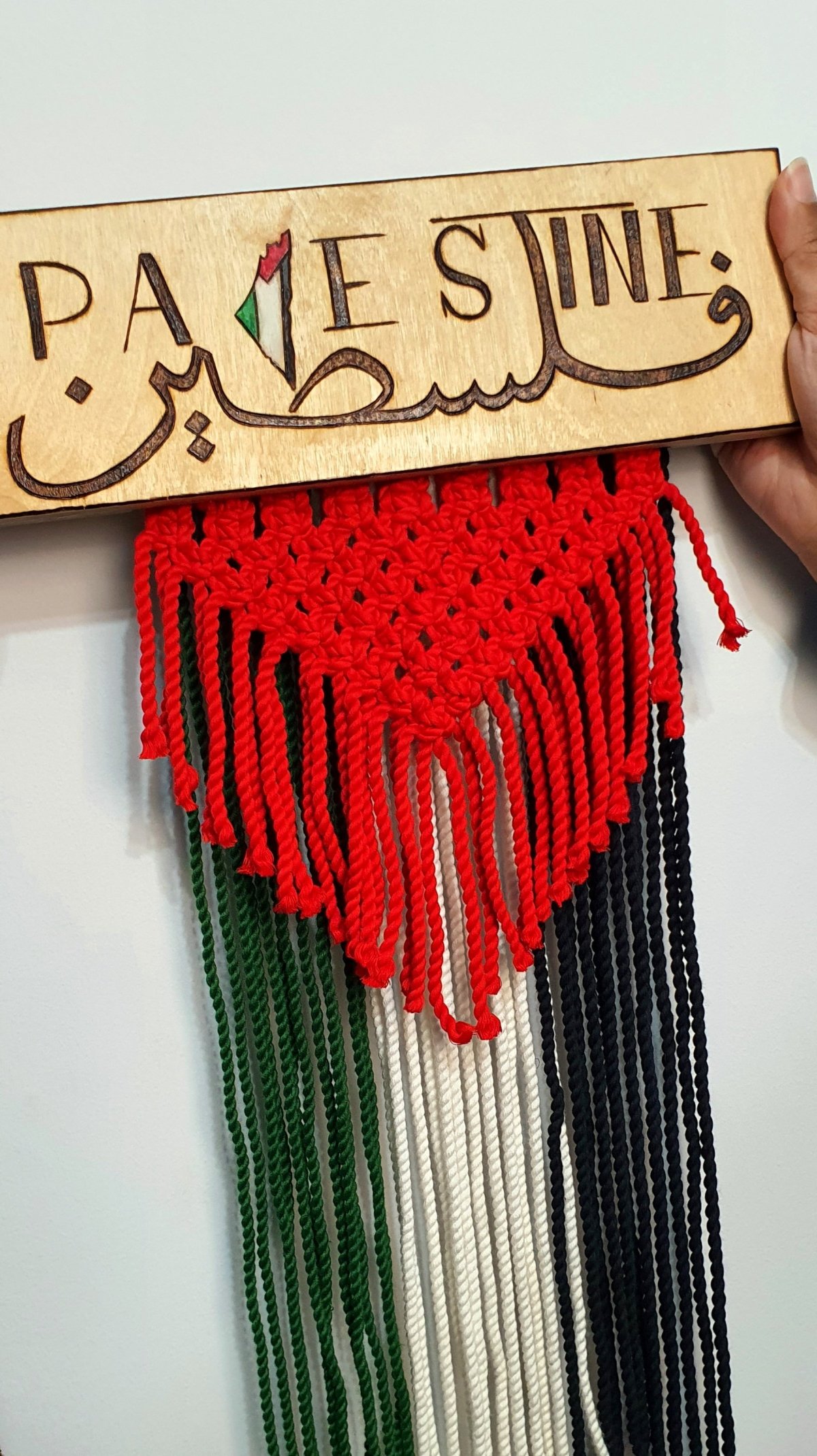 لوحة جدارية رأسية مكونة من قطعة خشب مستطيلة بتصميم فريد من نوعه، نفَّذناه بفن الحرق اليدوي على الخشب، وخيوط مكرمية منسدلة تشكل علم فلسطين. يمكن تعليقها على الحائط لإضافة لمسة فنية دافئة إلى غرفتك أو منزلك.
