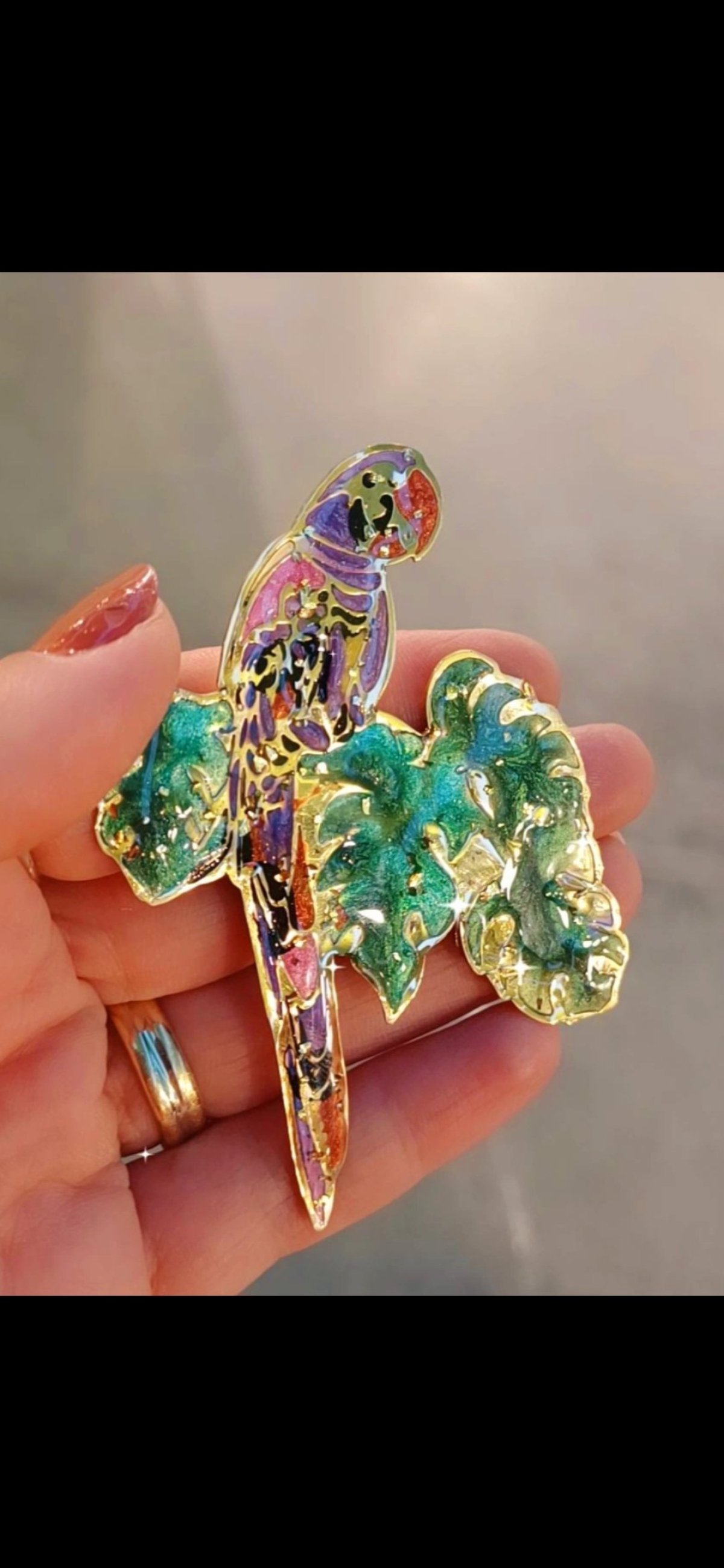 قطعة فنية على شكل دبوس مستوحاة من حياة الببغاء في الغابة وأوراق الأشجار الاستوائية بألوانها الجميلة. مصنوعة يدويًا بالكامل من النحاس المطلي بالذهب ومرصعة بألوان راتنجية لامعة. 🍂🦜