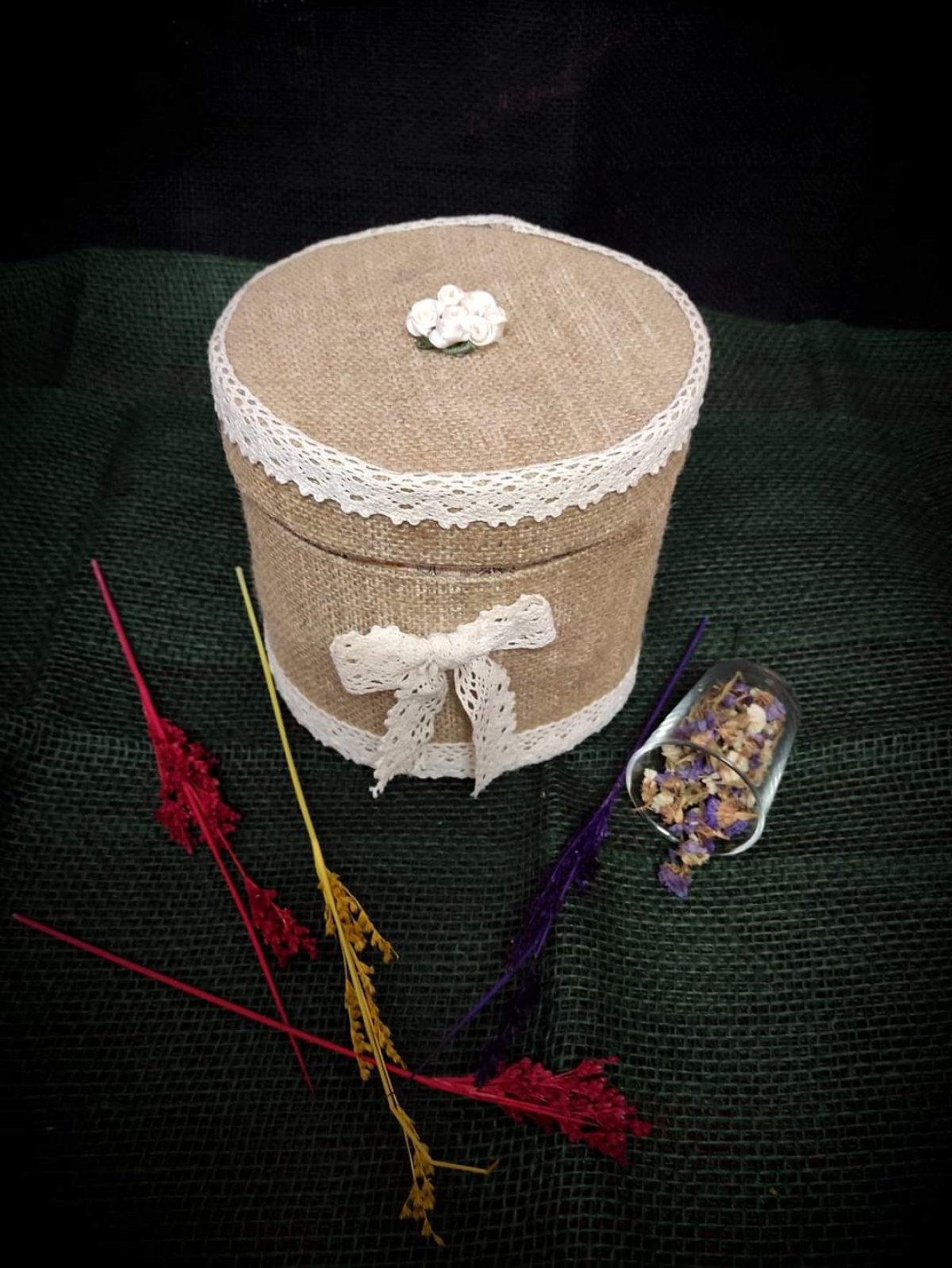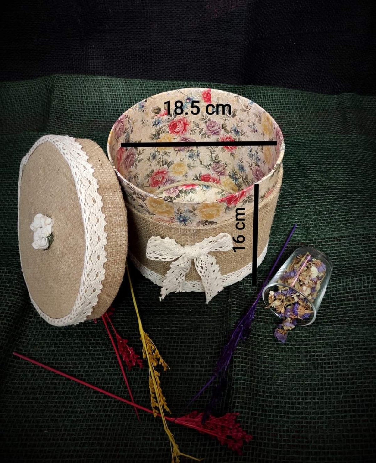 صندوق هدايا دائرى مصنوع من الكرتون المقوى وقماش الخيش مطعم بالجوبير القطن يمكن استخدامه للهدايا او كمنظم لتخزين للمقتنيات البسيطه