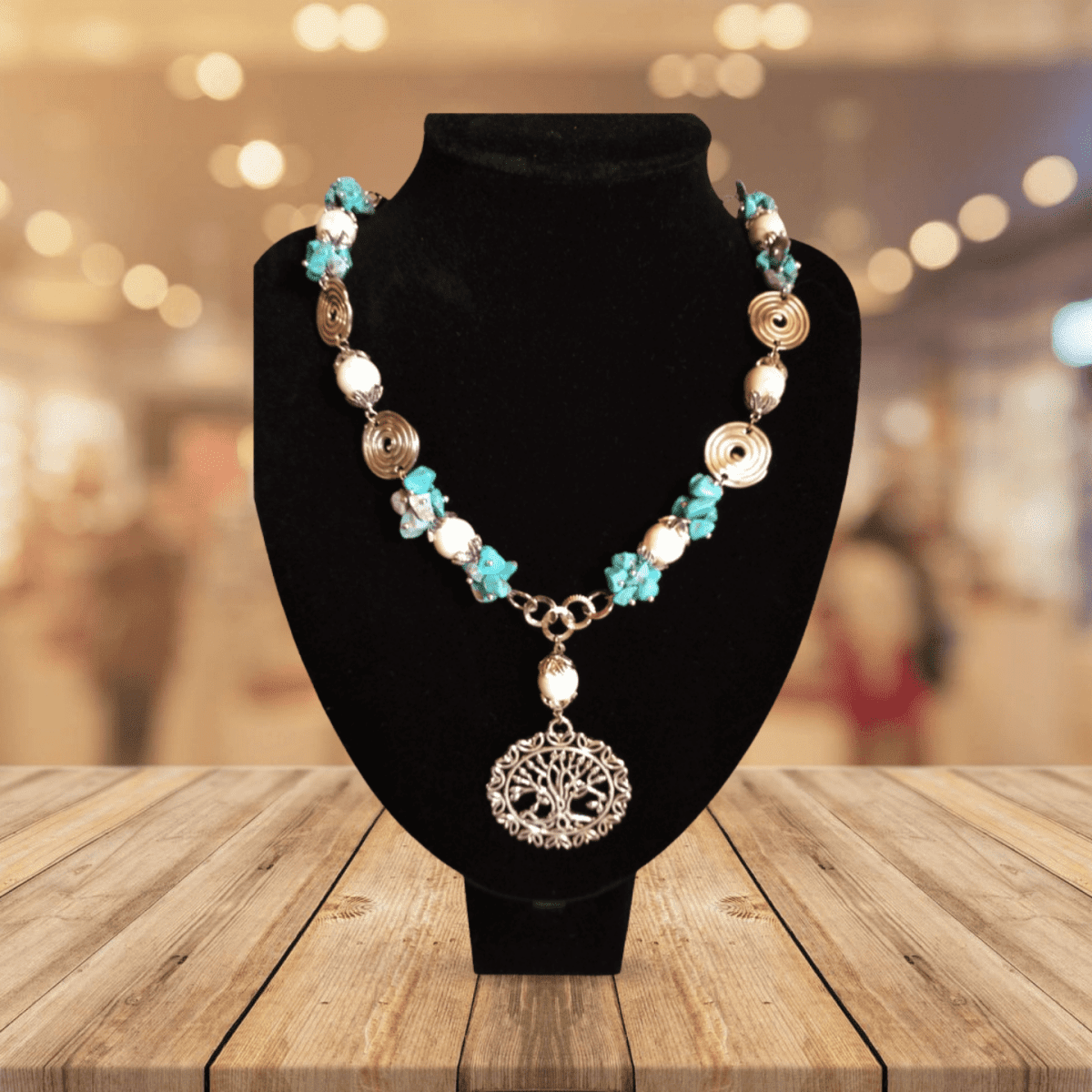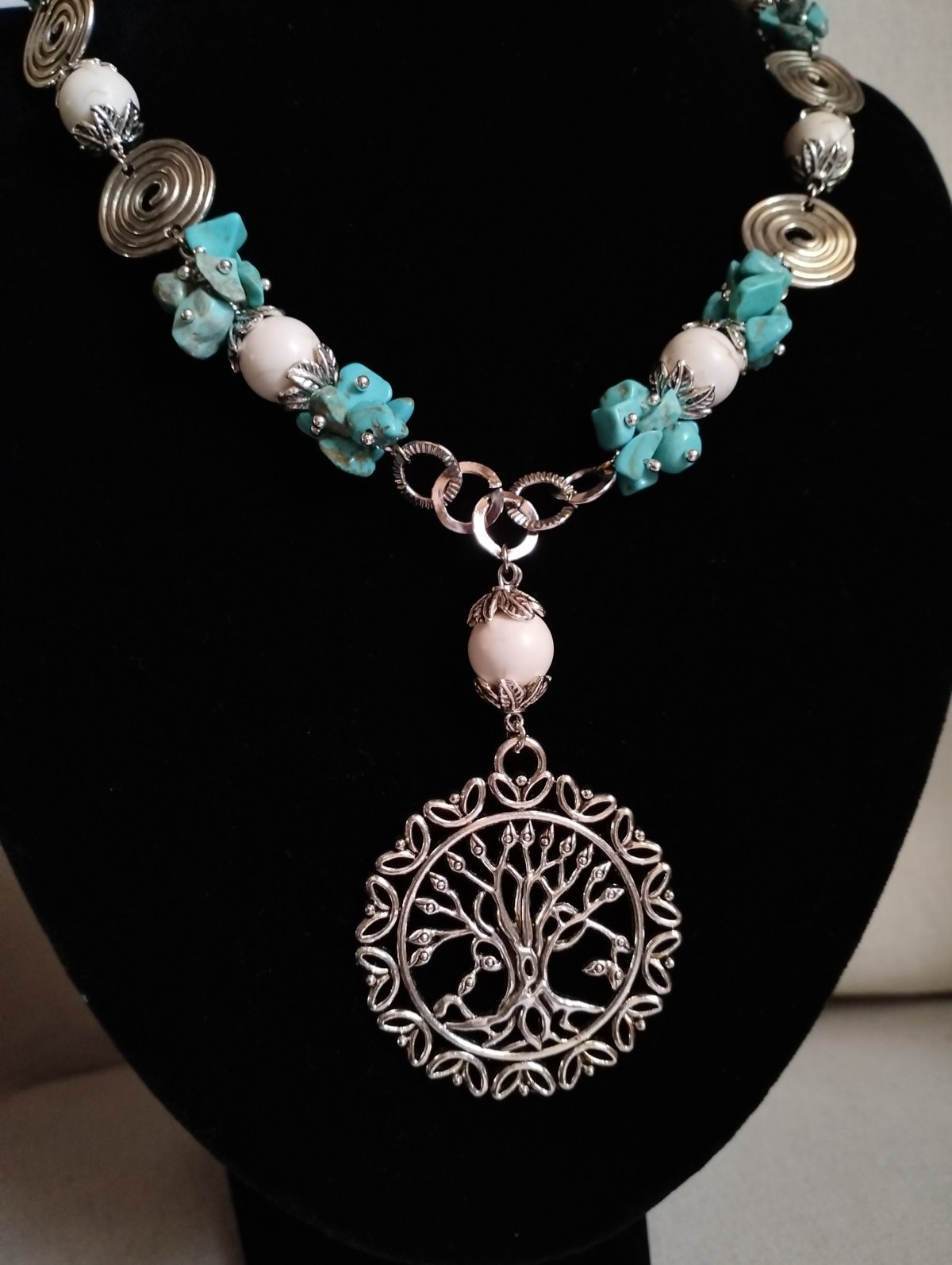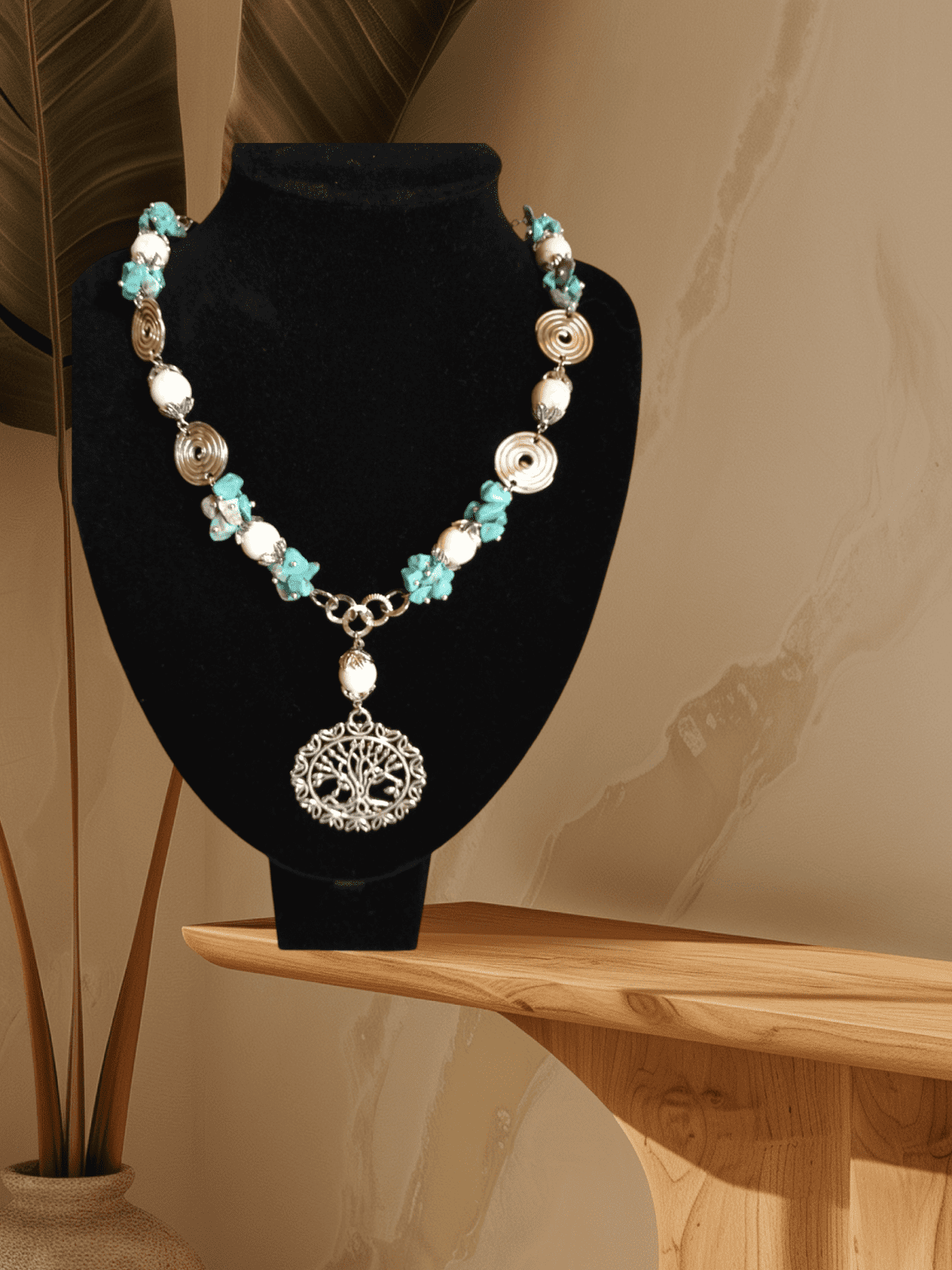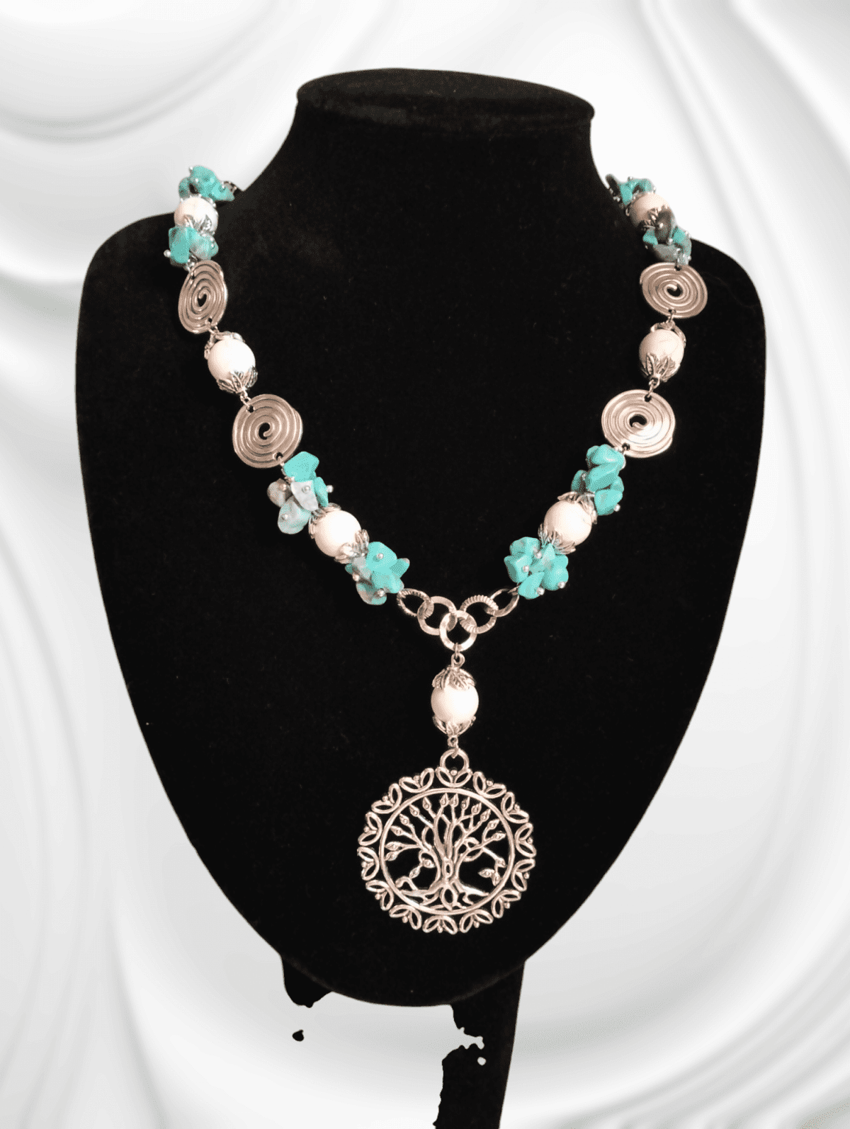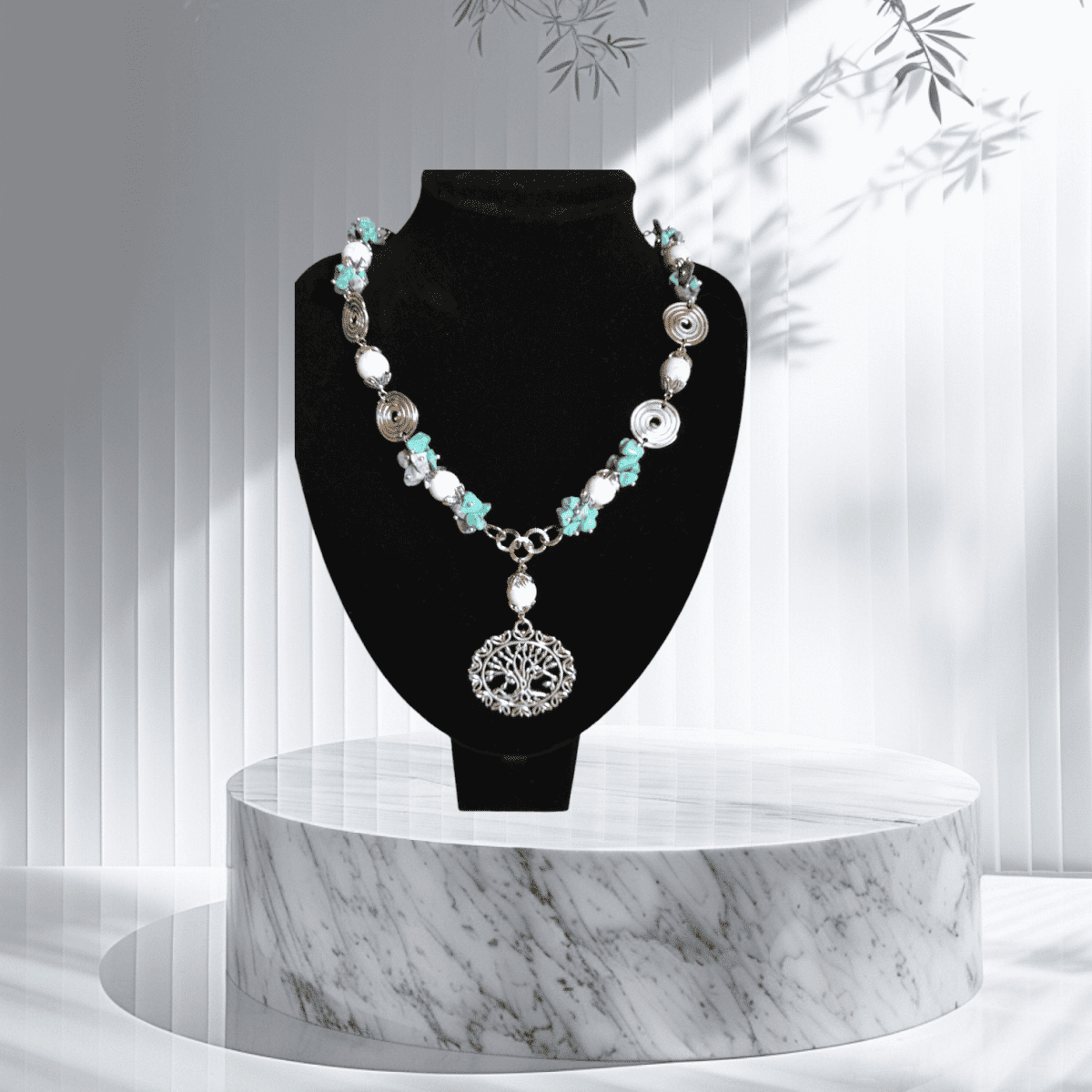 قلاده من كسر حجر فيروزري مع حجر اوف وايت بدلاليه من معدن فضي اللون مرصع بطربوش معدن بطول 47سم