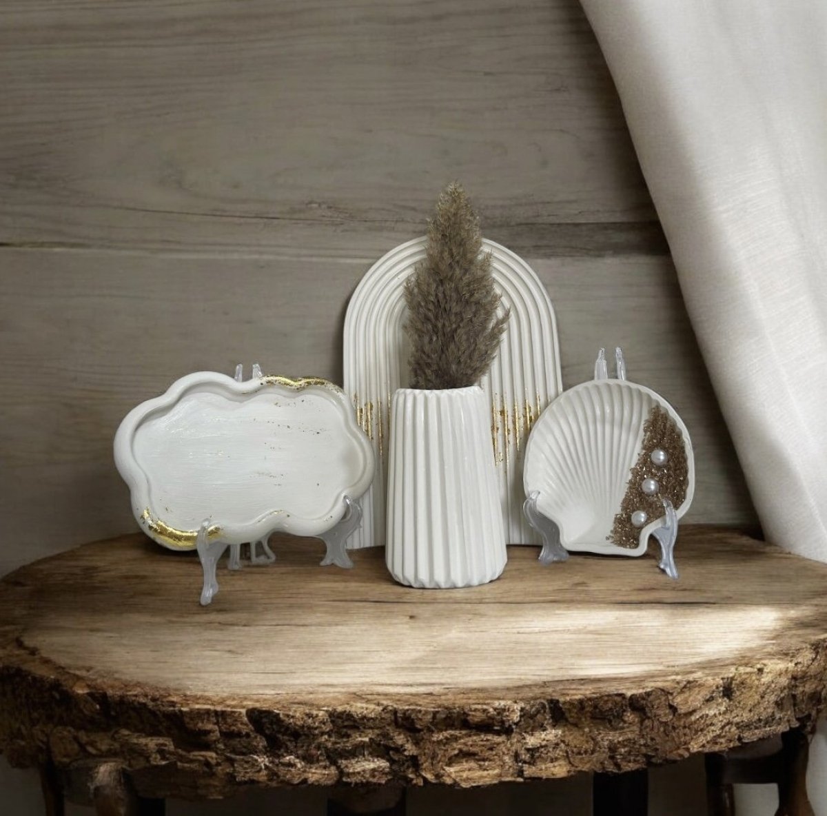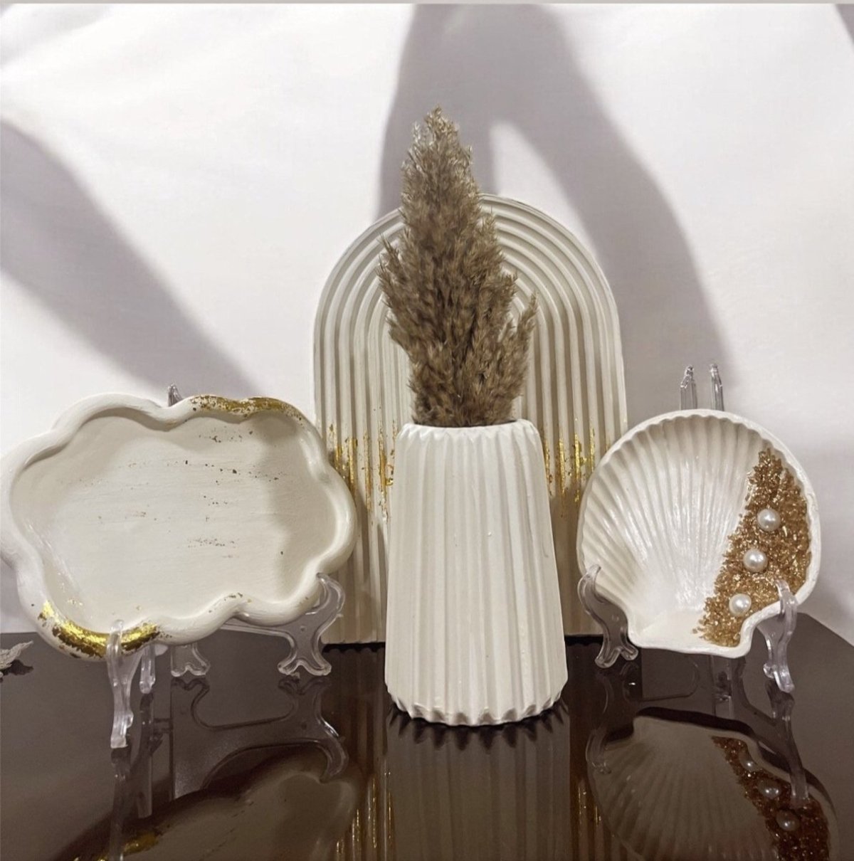 كوستر باللون البيج حجم كبير مزين بورق الدهب وفازه وكوستر صدفه مزين بالاحجار وكوستر مزين بورق الدهب