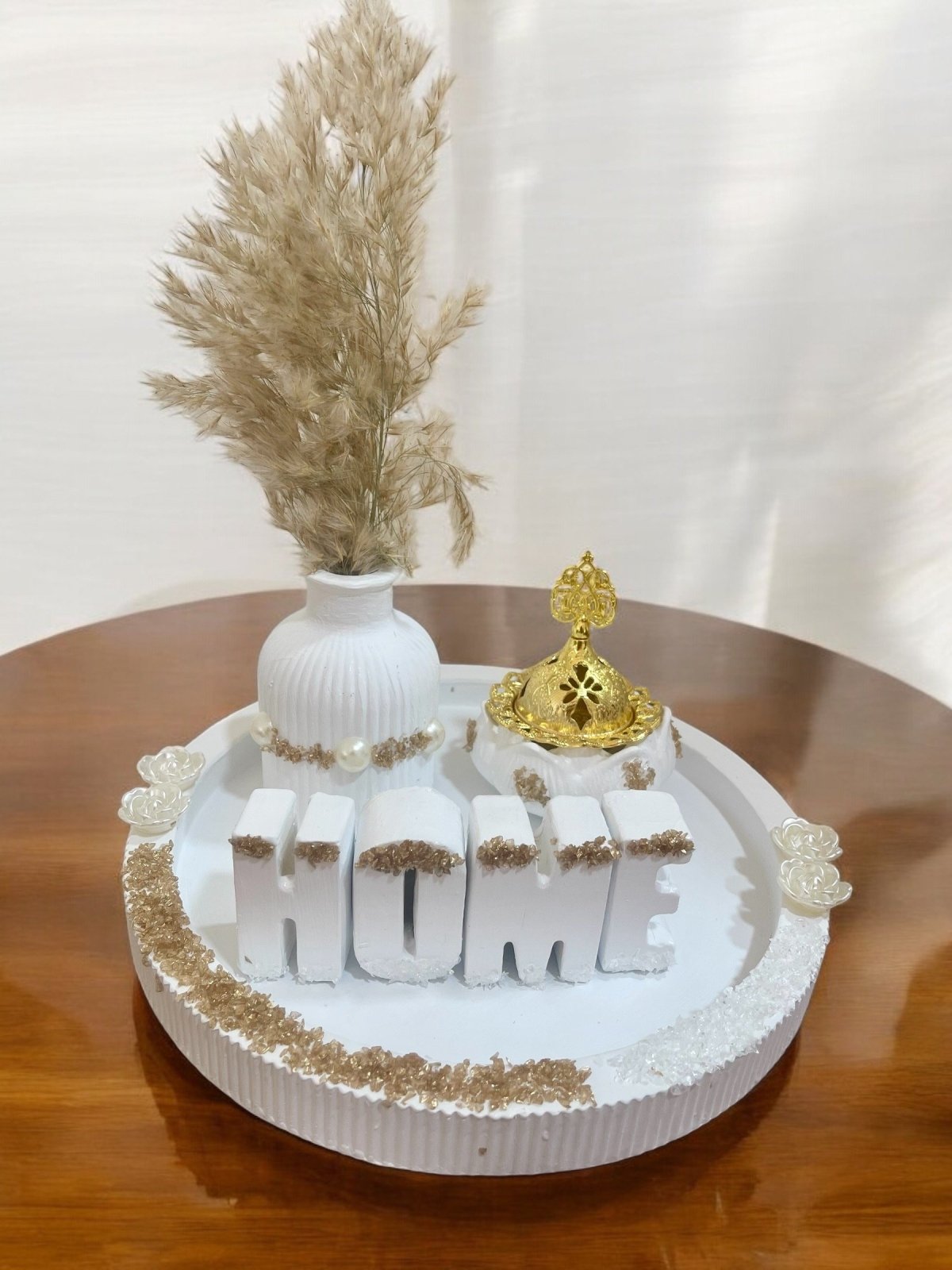 طقم ديكور مكون من صنيه مقاس ٢٦ مزينه بالورود والاحجار واللولي ومعاها مبخره علي شكل ورده وفازه مضلعه