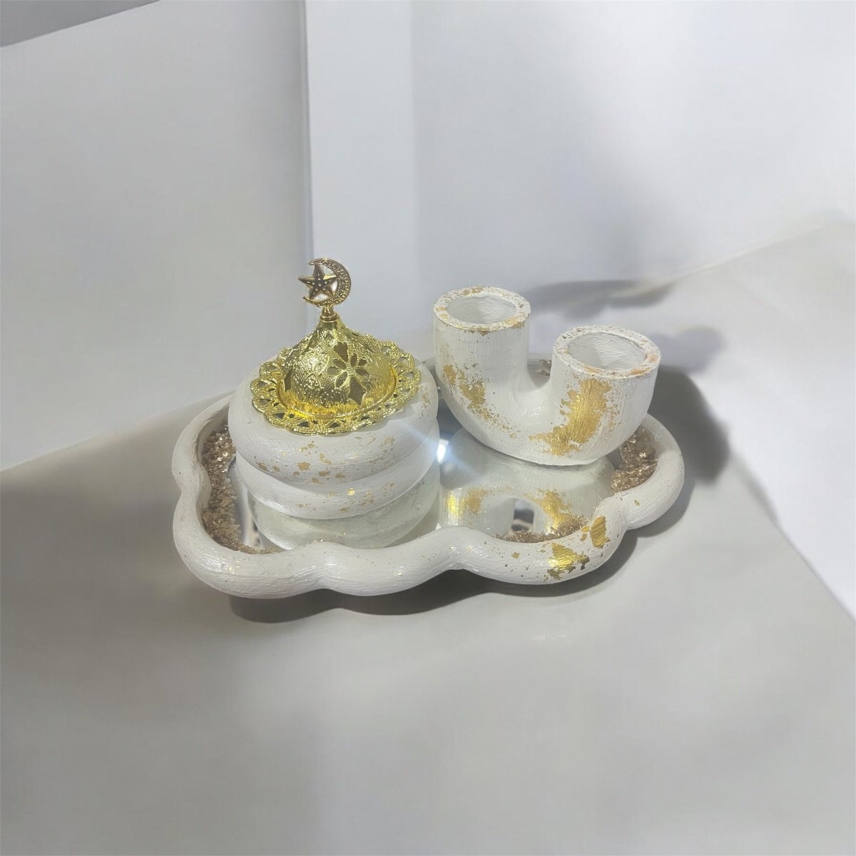 طقم ديكور عباره عن كوستر مرايه مزين بالأحجار ومبهره علي شكر دونتس بغطاء استلس بالبون الدهبي وشمعدان مزينين بورق الدهب