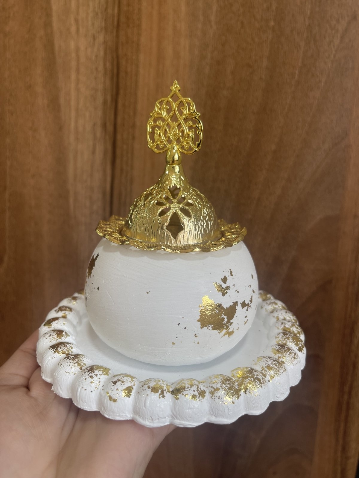 مبخره مزينه بورق الدهب وغطا من الاستلس باللون الدهبي وكوستر بابلز مزين بورق الدهب