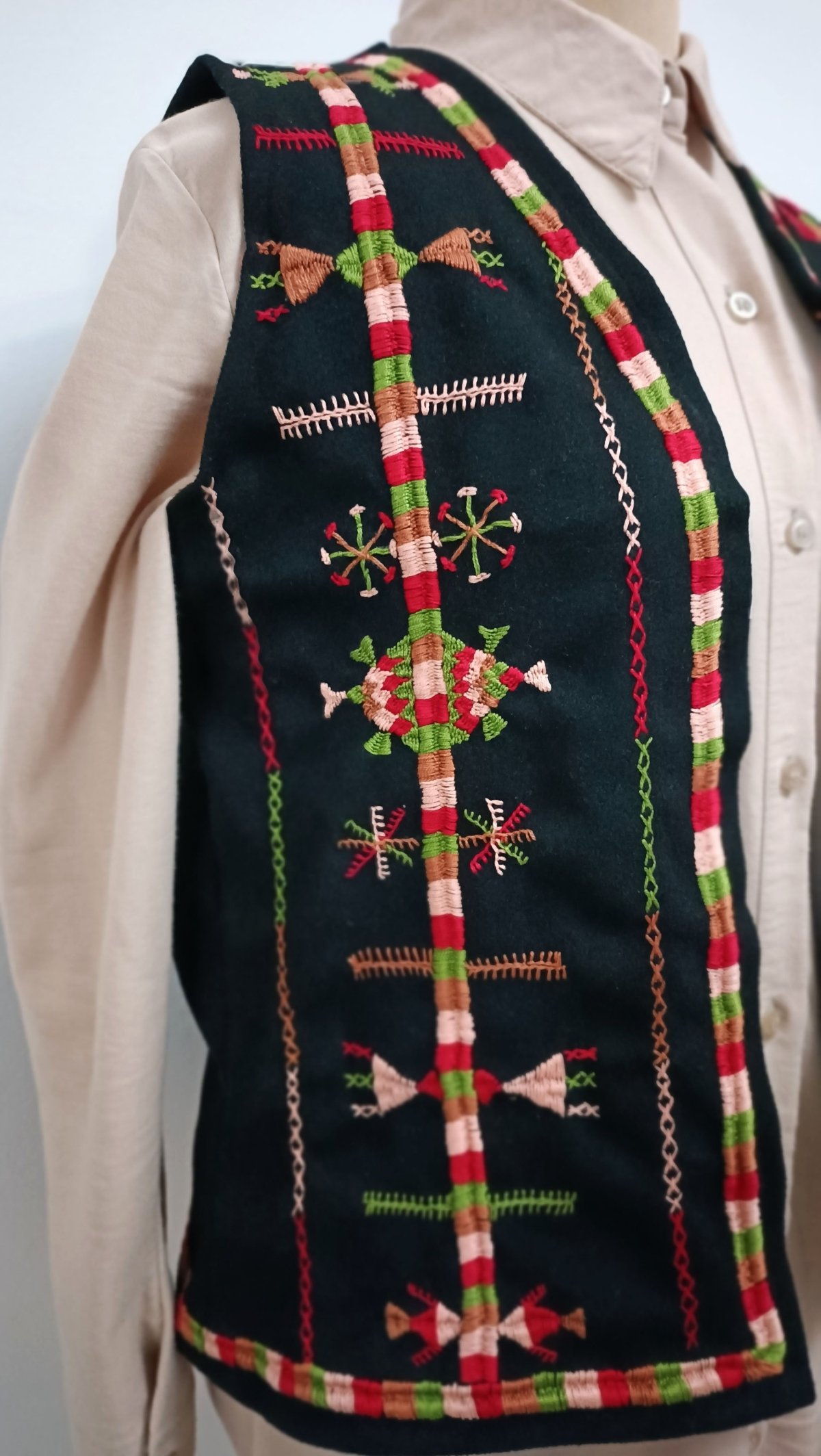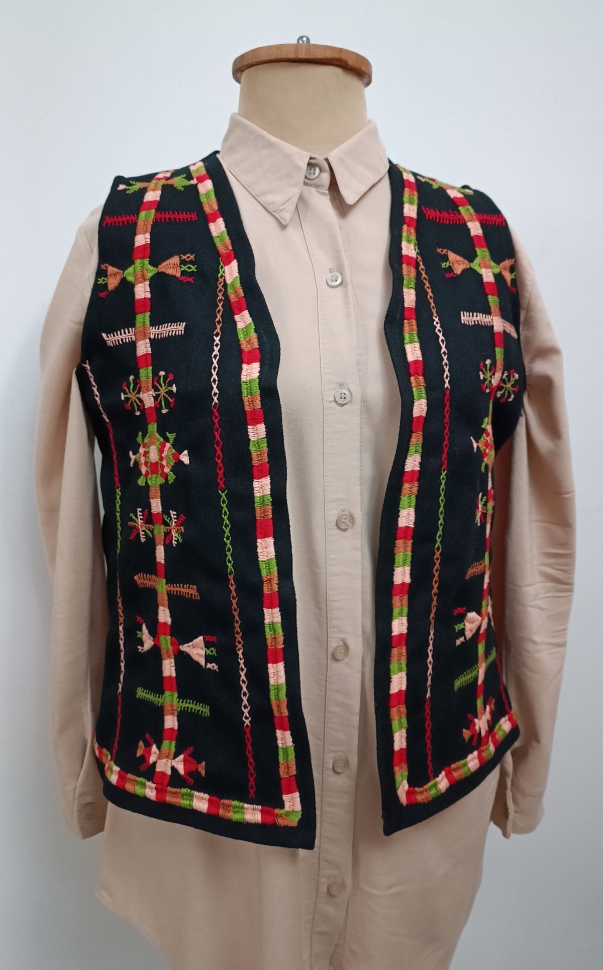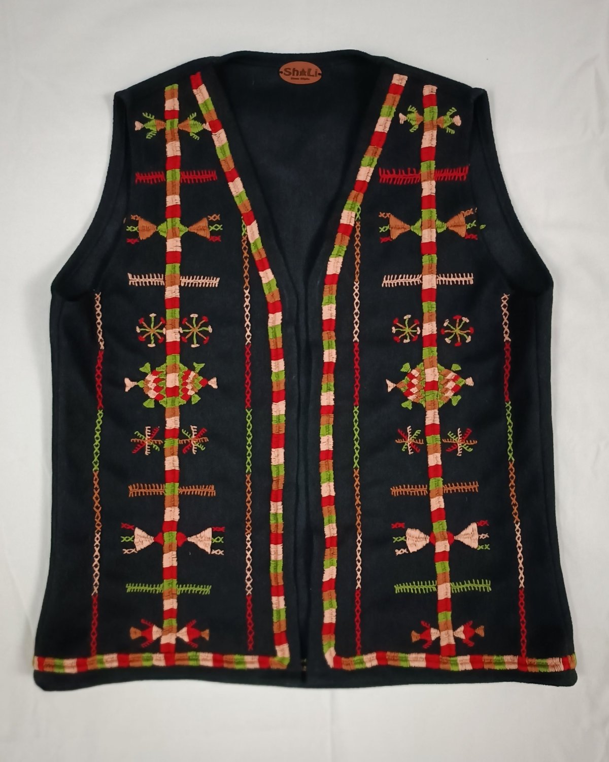 صديرى مميز مصنوع من صوف الجوخ، مطرز يدويًا بعناية بأيدي سيدات واحة سيوة. مناسب حتى وزن ٦٥ كجم. تنظيف جاف أو غسيل يدوي بدون عصر. كي بدرجة حرارة منخفضة.