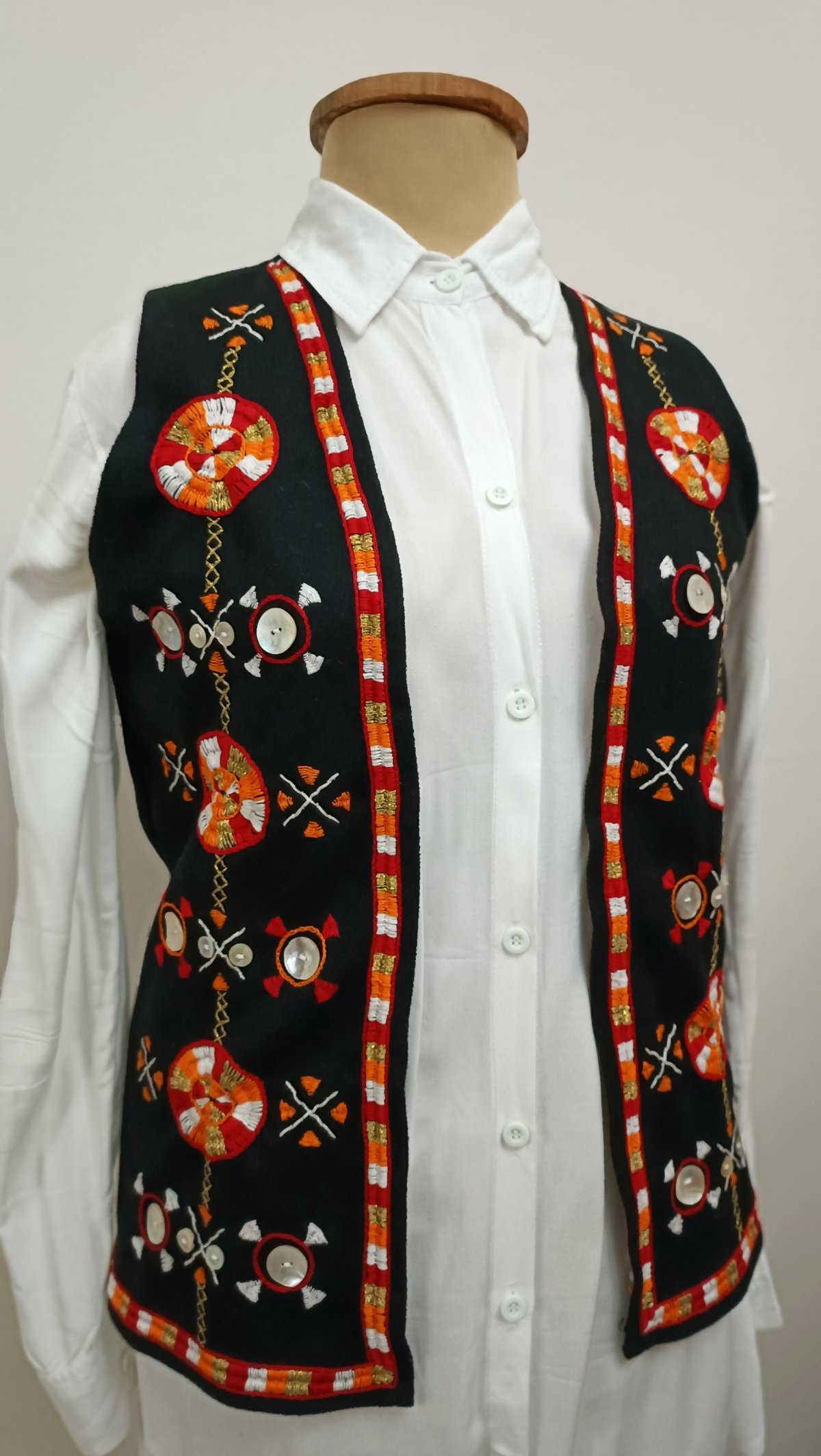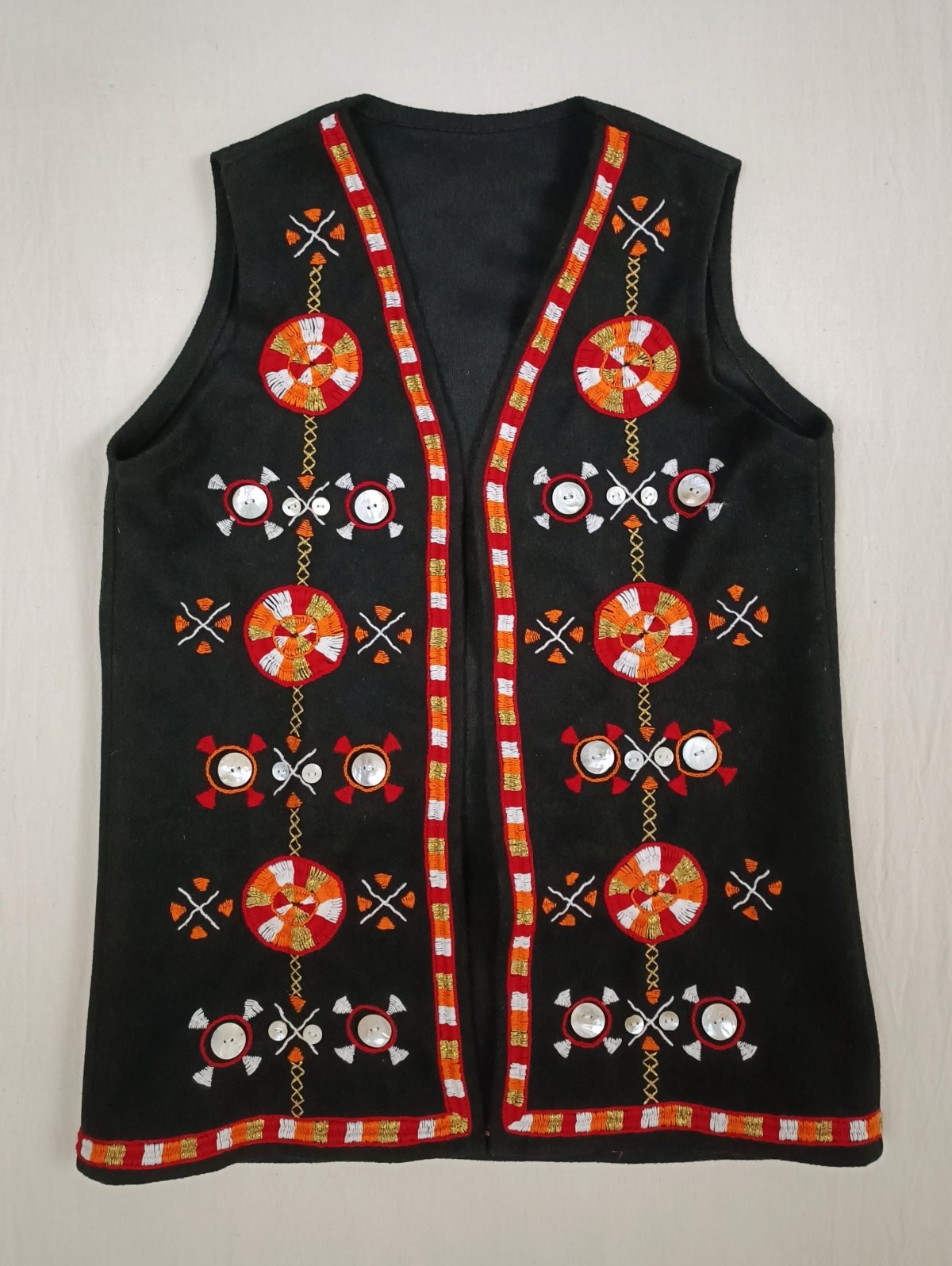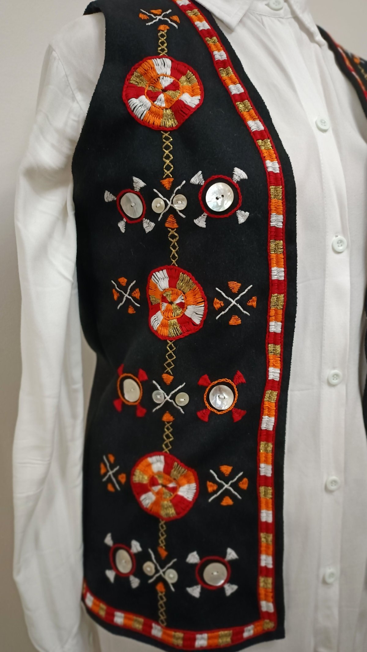 صديرى مميز مصنوع من صوف الجوخ، مطرز يدويًا بعناية بأيدي سيدات واحة سيوة. مطعم بأزرار من الصدف الطبيعى مناسب حتى وزن ٦٥ كجم. تنظيف جاف أو غسيل يدوي بدون عصر. كي بدرجة حرارة منخفضة.