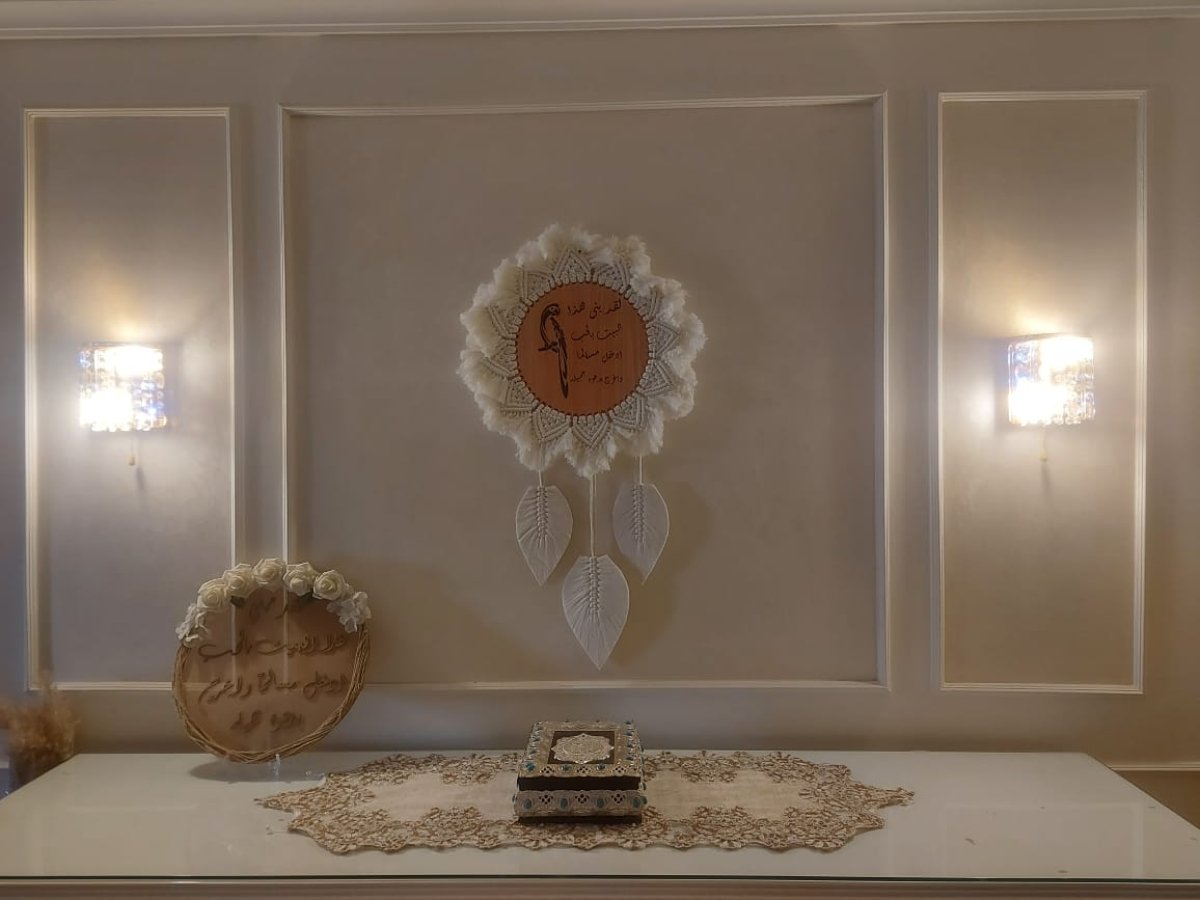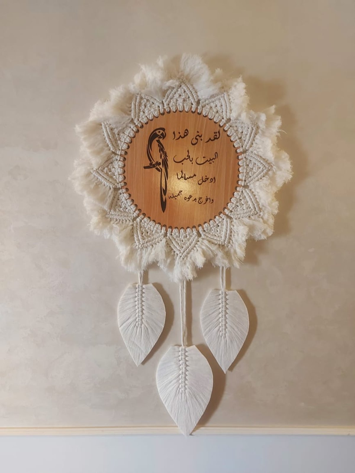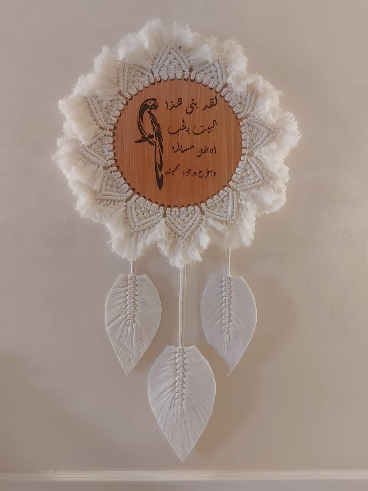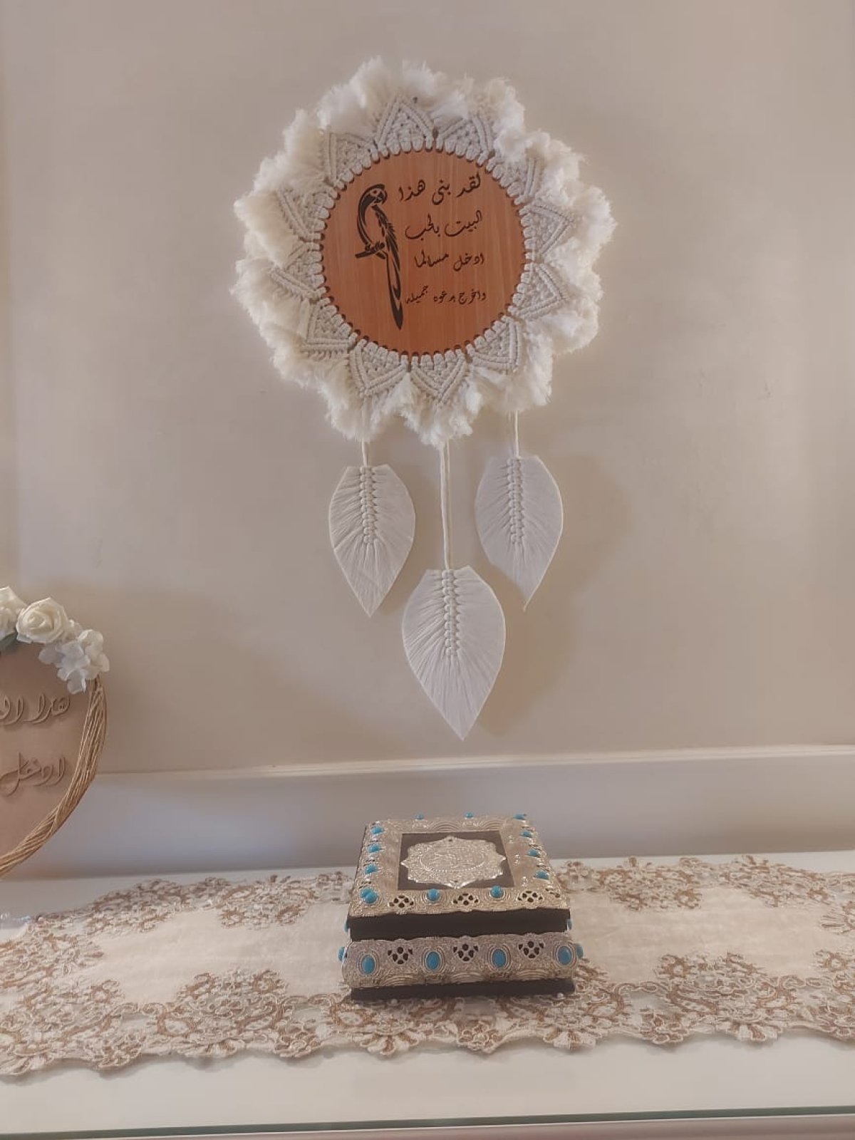 معلقة مكرمية بريش المكرمية ودعوه جميله مناسبه للريسبشن جدا ولونها الاوف وايت الجميل