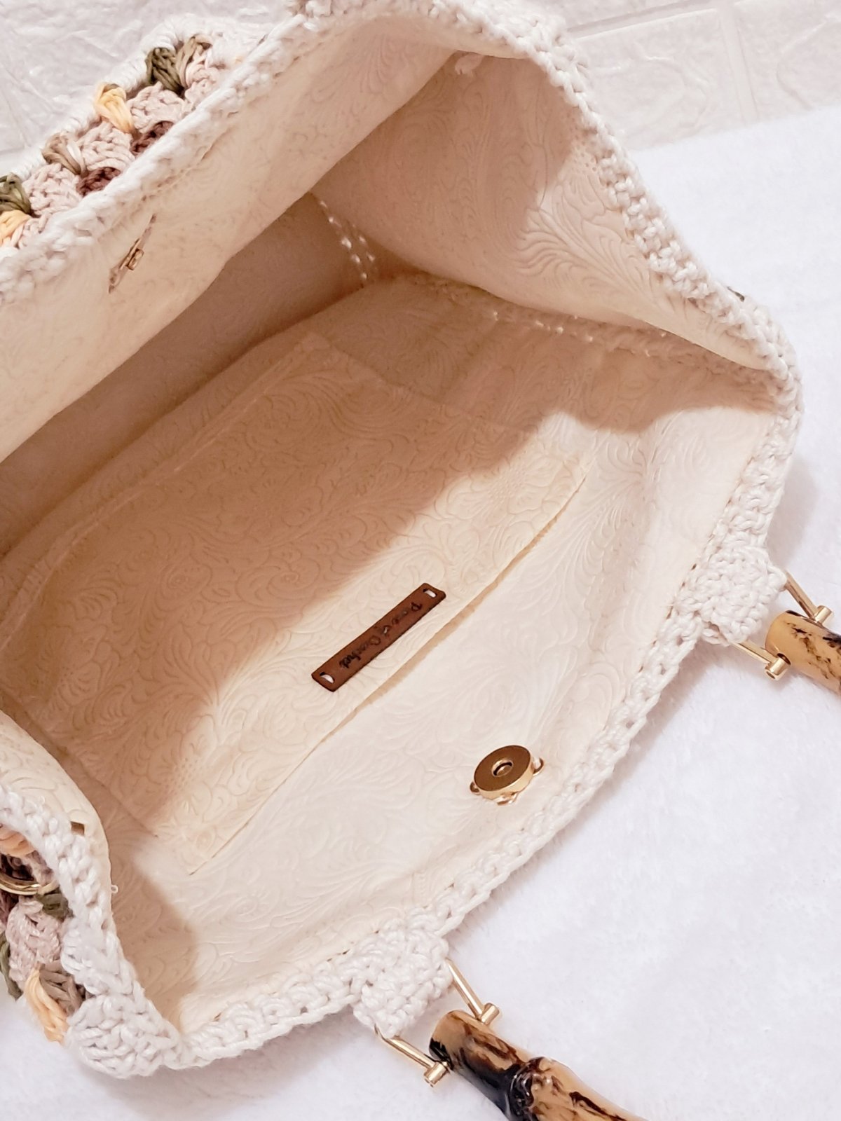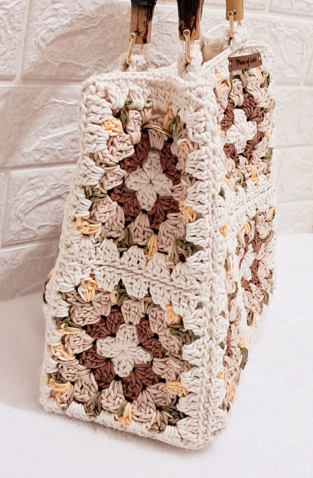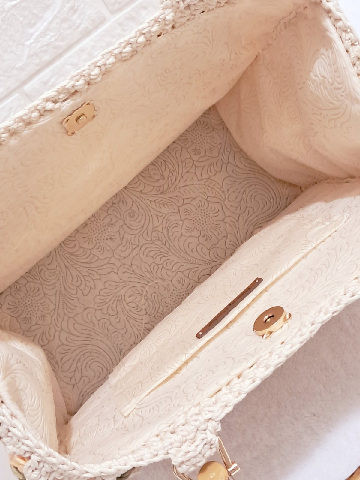الشنطة مشغولة بخيوط قطن عالية الجودة . ومبطنة من الداخل ولها يد عاج شبه الخوص . الشنطة لها يد كروس ويمكن التحكم في طول او قصر اليد . الشنطة لها قفل تركى خامة ممتازة . تتميز بانها واسعه من الداخل وكمان لها جيب داخلى . عرض الشنطة ٢٨ سم ارتفاع الشنطة ٢٨ سم عرض جانب الشنطة ١٤ سم عرض القاعدة ١٤ سم متاح تنفيذها بالوان مختلفة وباحجام مختلفة .