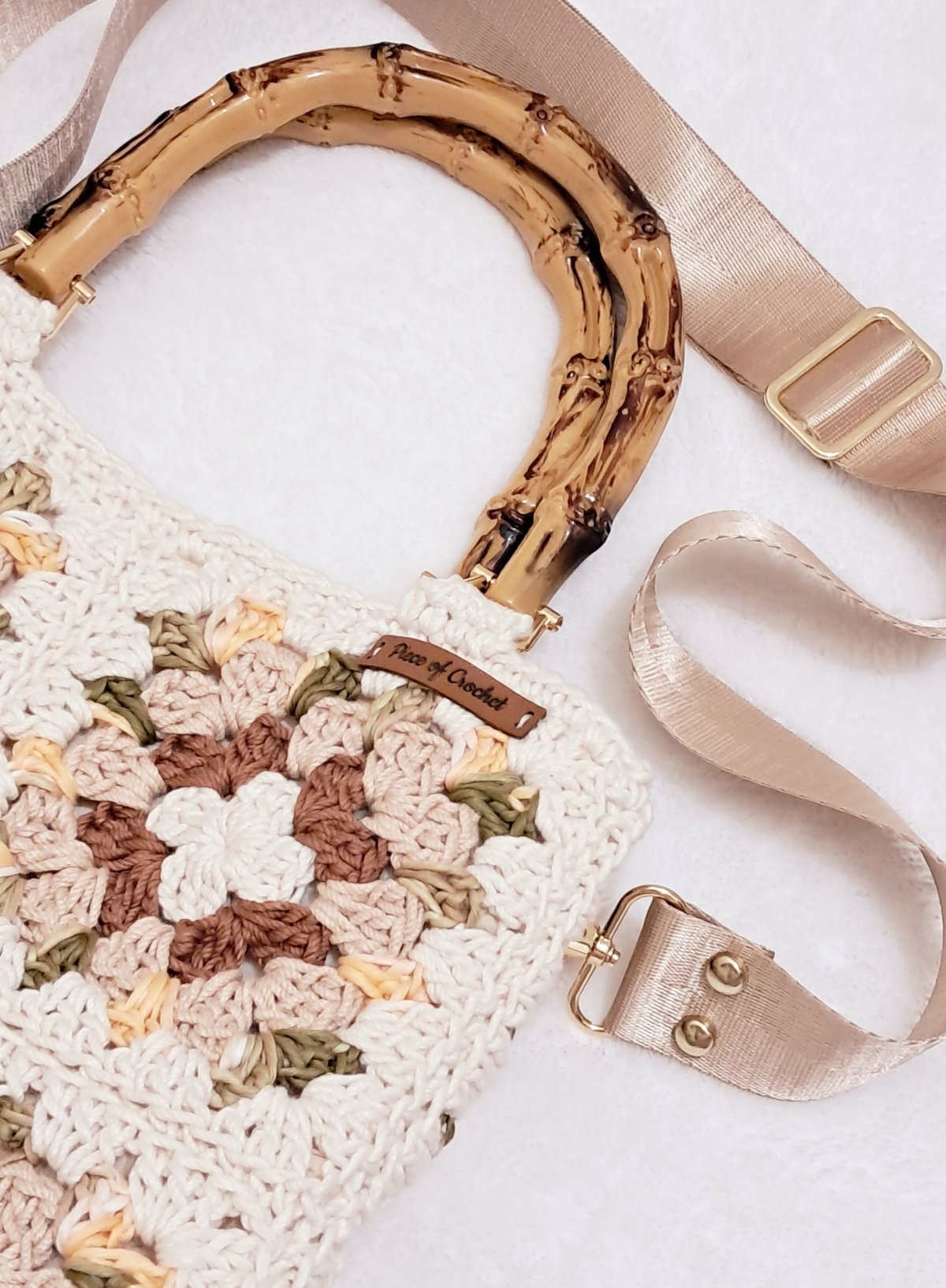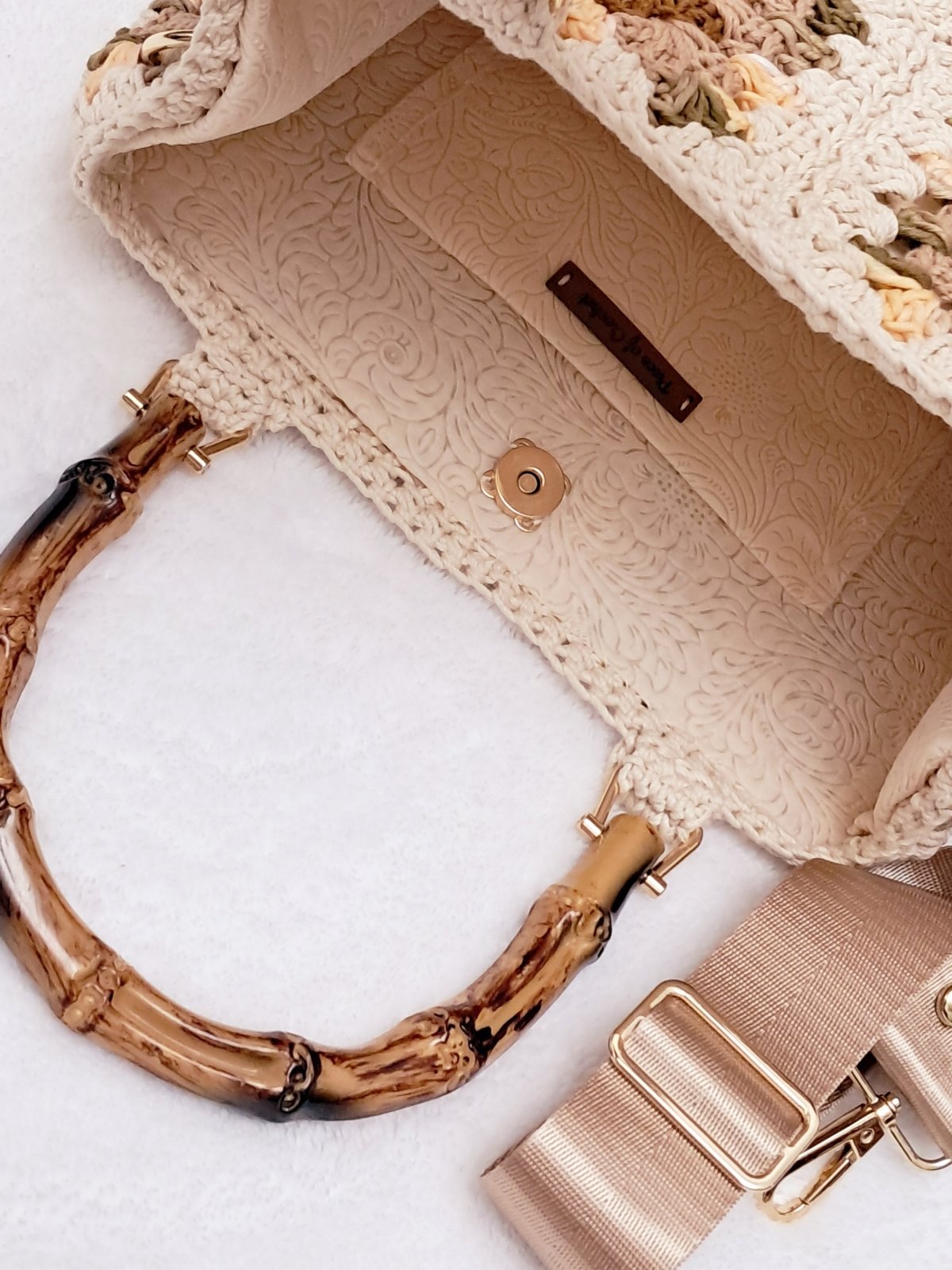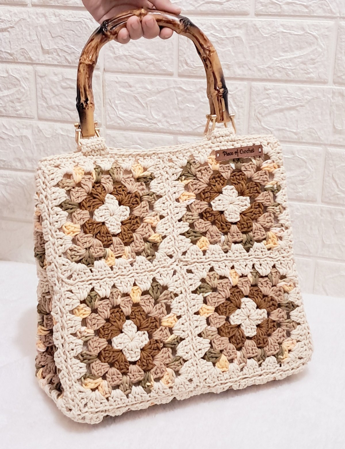 الشنطة مشغولة بخيوط قطن عالية الجودة . ومبطنة من الداخل ولها يد عاج شبه الخوص . الشنطة لها يد كروس ويمكن التحكم في طول او قصر اليد . الشنطة لها قفل تركى خامة ممتازة . تتميز بانها واسعه من الداخل وكمان لها جيب داخلى . عرض الشنطة ٢٨ سم ارتفاع الشنطة ٢٨ سم عرض جانب الشنطة ١٤ سم عرض القاعدة ١٤ سم متاح تنفيذها بالوان مختلفة وباحجام مختلفة .
