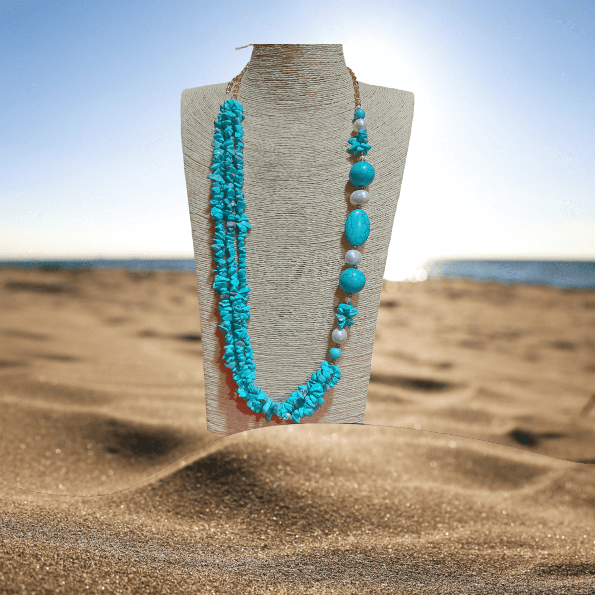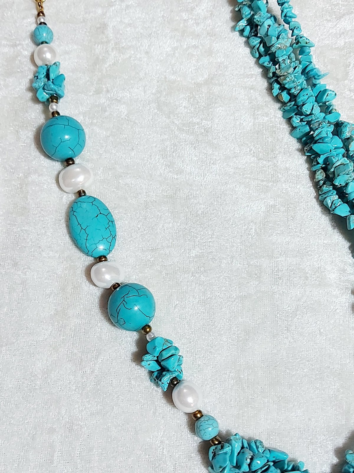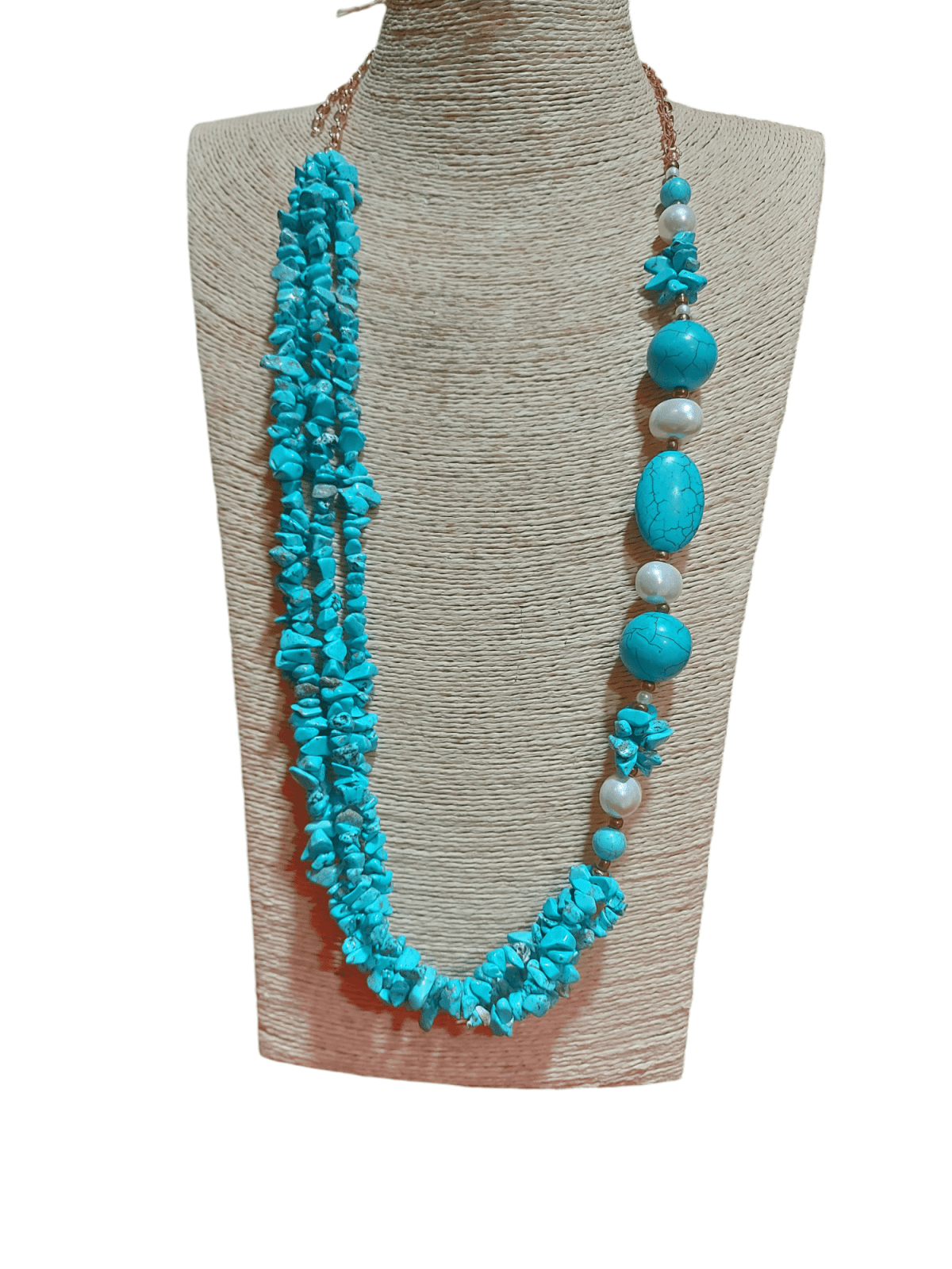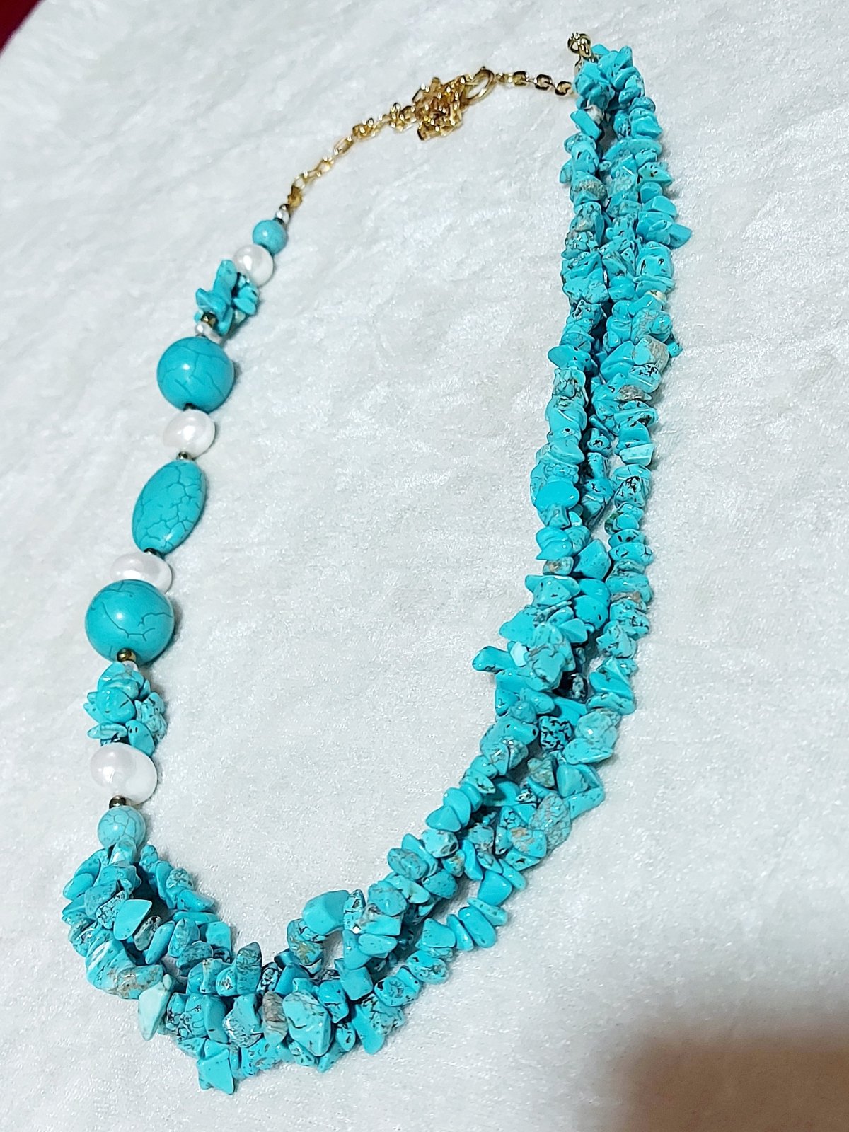 كوليه من احجار الفيروز باشكاله مطعم بفواصل احجار الهيماتيت مزود بسلسلة للتحكم في الطول