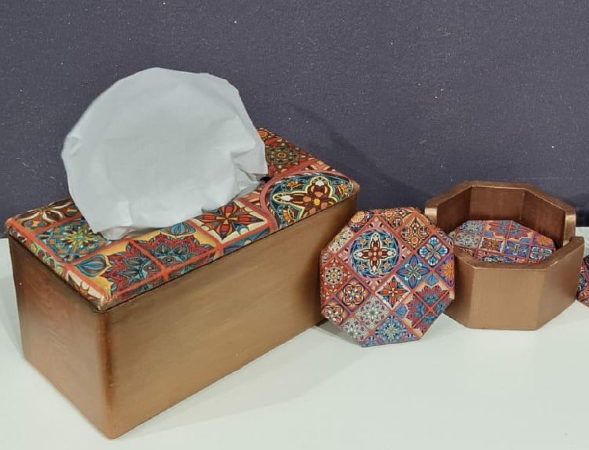 ممكن تنفيذها بالتصميم والألوان المناسبه لديكور المكان عندك، وممكن كمان تنسيقها مع قطع اخري علي ترابيزة غرفة الجلوس زي علبة مناديل ومنظم المشروبات وغيرها
