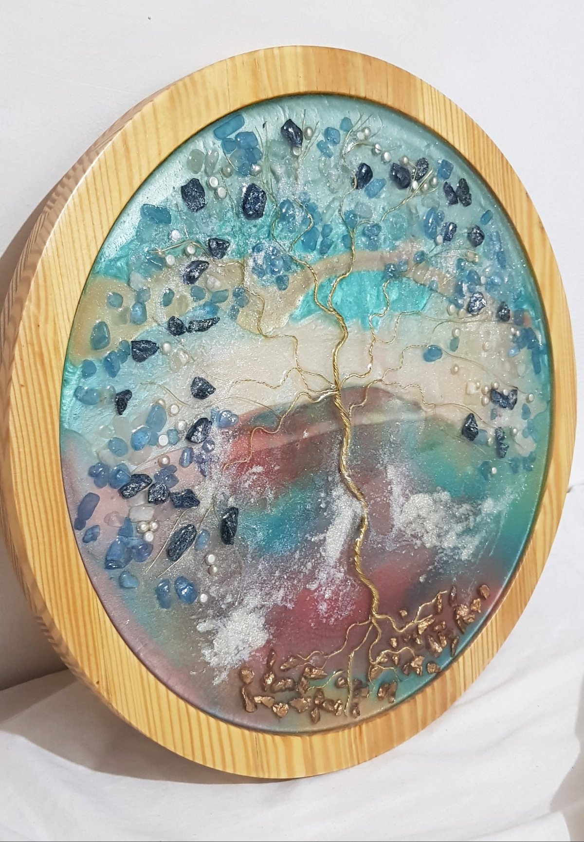 تابلوه من الخشب العزيزي مليء بالريزن بديزاين وألوان مبهجة 💙💙❤❤مع شجرة من النحاس والأحجار