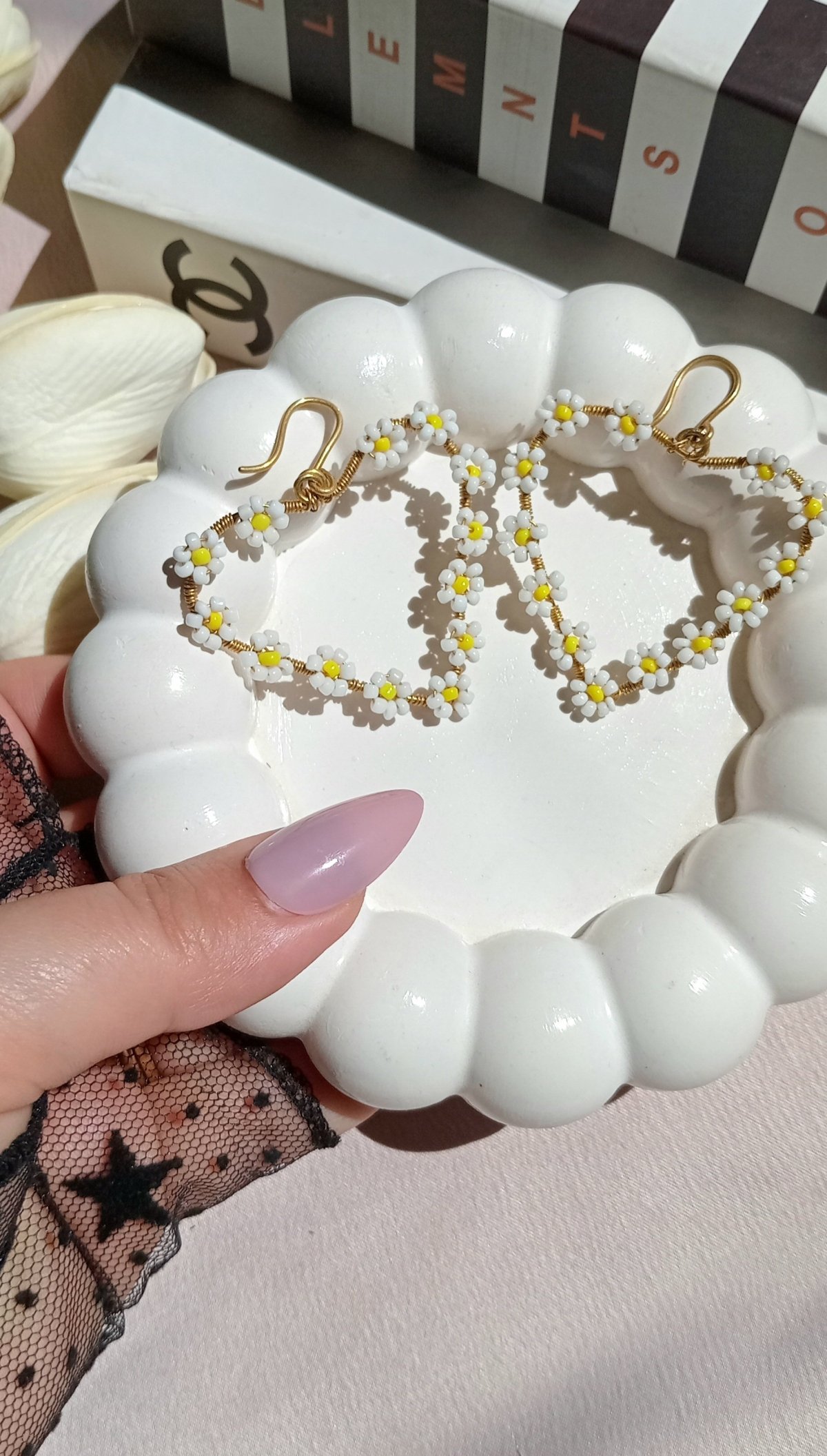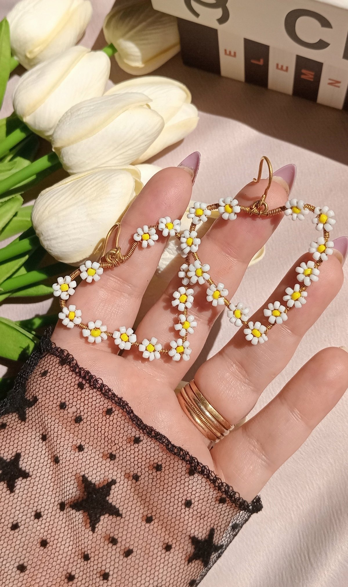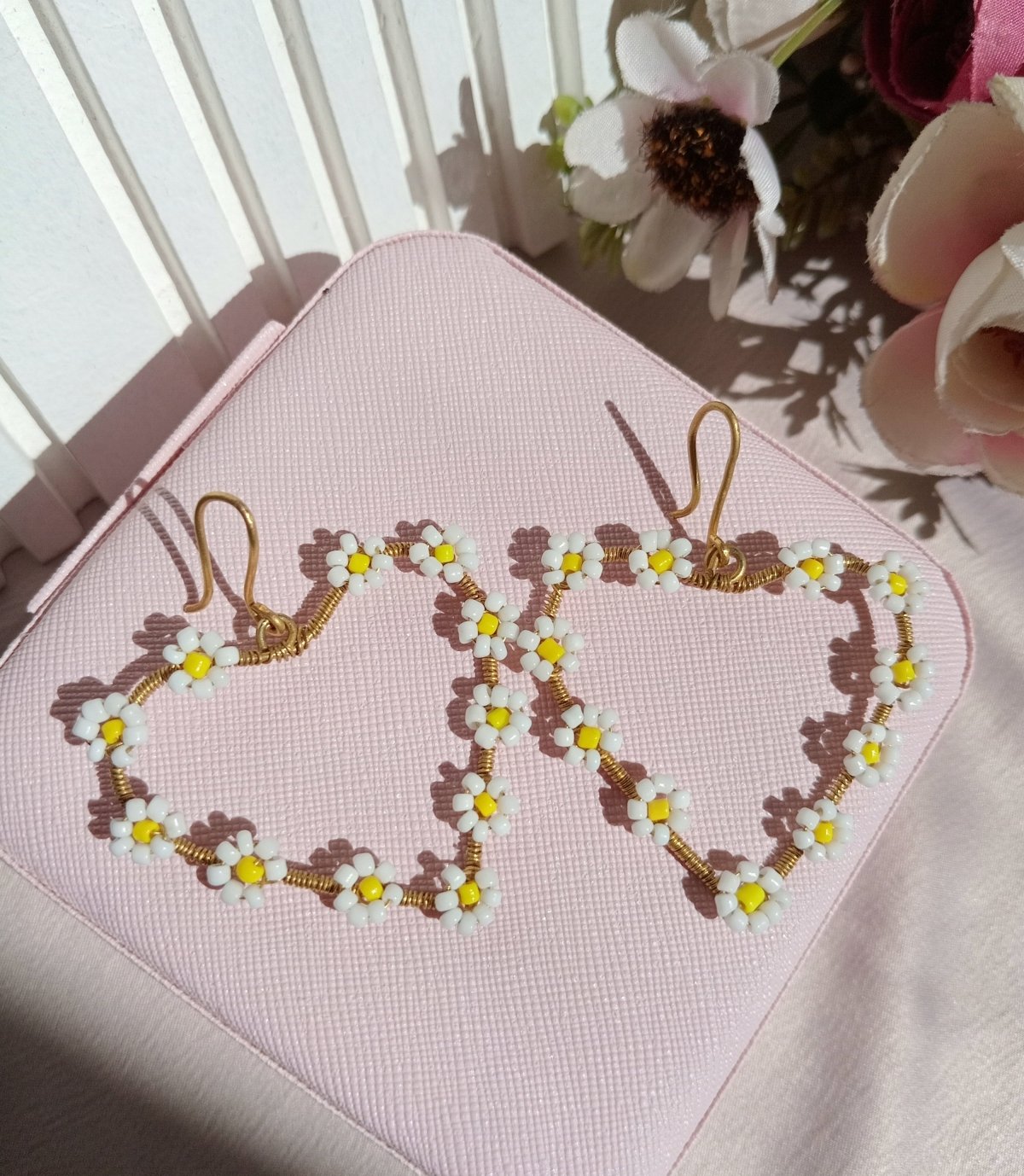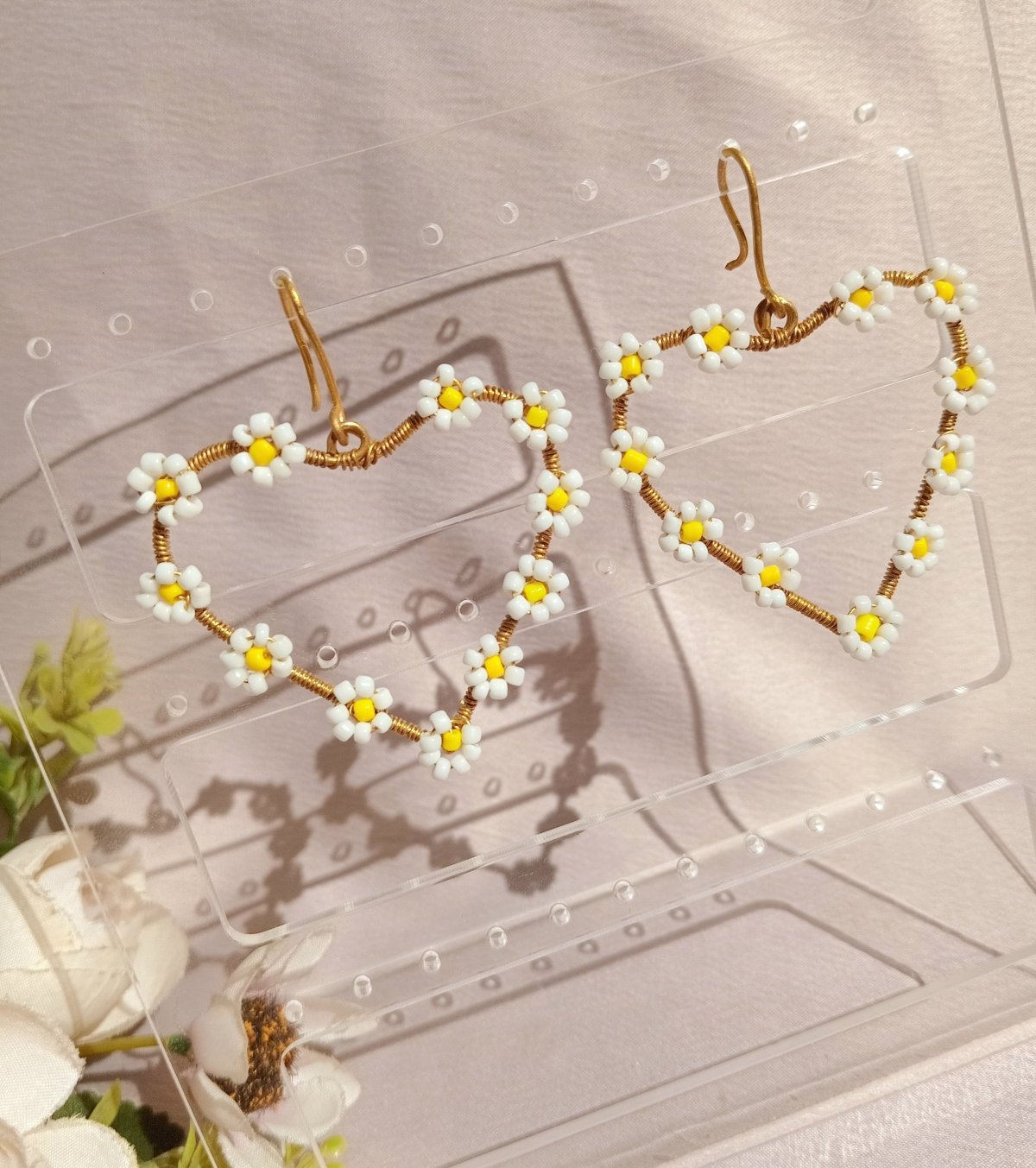 حلق هوك نحاس هاندميد علي شكل قلب مع ورد الياسمين الأبيض بالخرز
