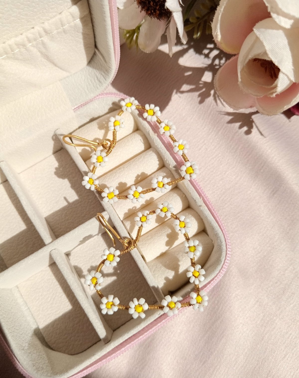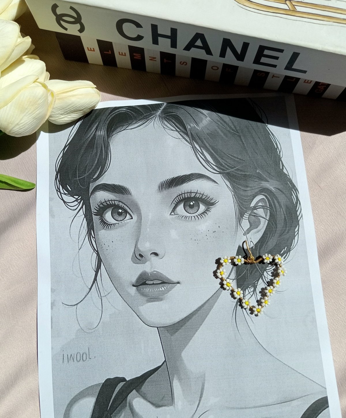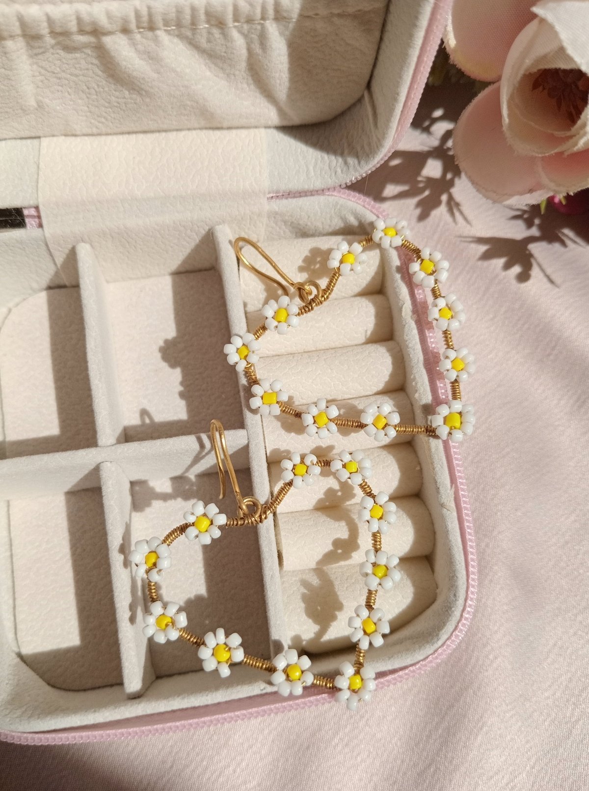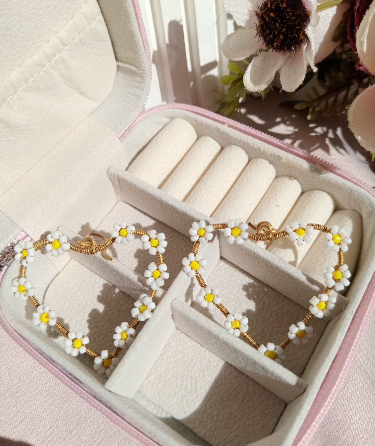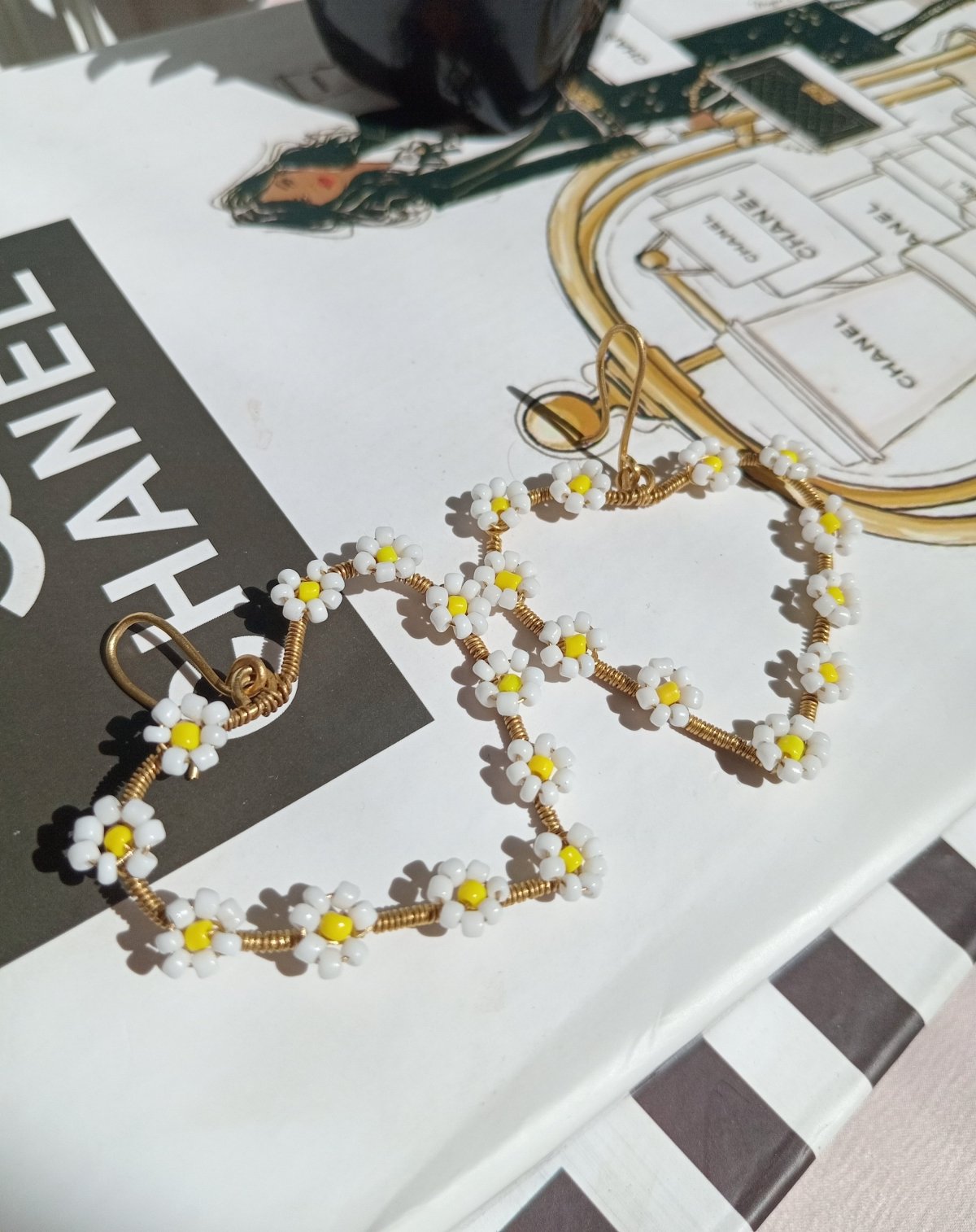حلق هوك نحاس هاندميد علي شكل قلب مع ورد الياسمين الأبيض بالخرز