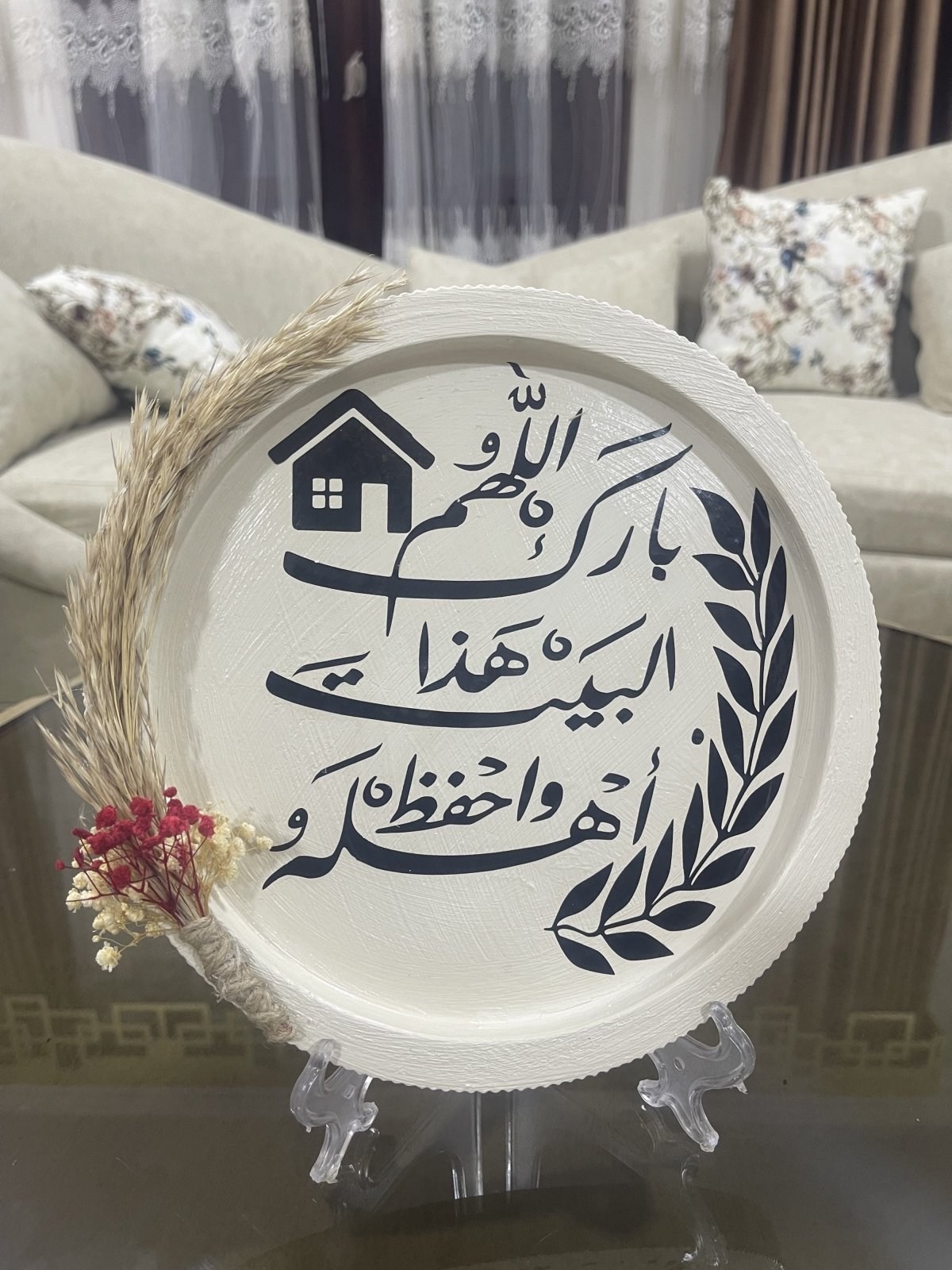 صنيه ديكور ومطرزه بالورود وجمله اللهم بارك هذا البيت واحفظ اهله