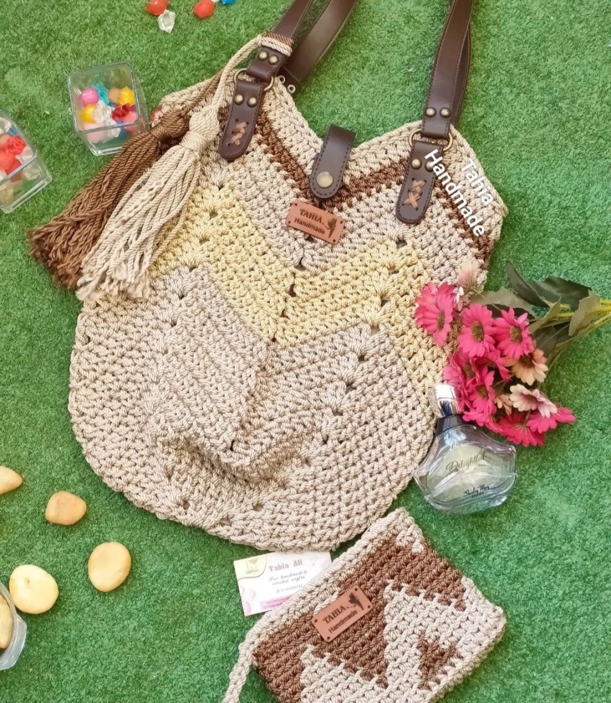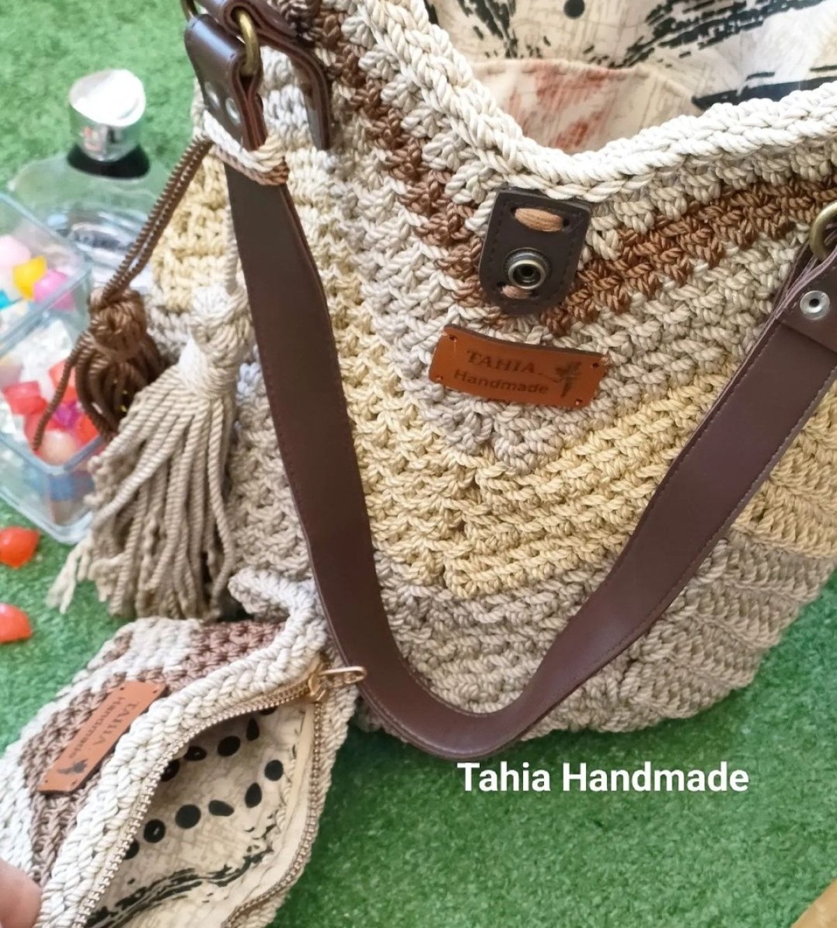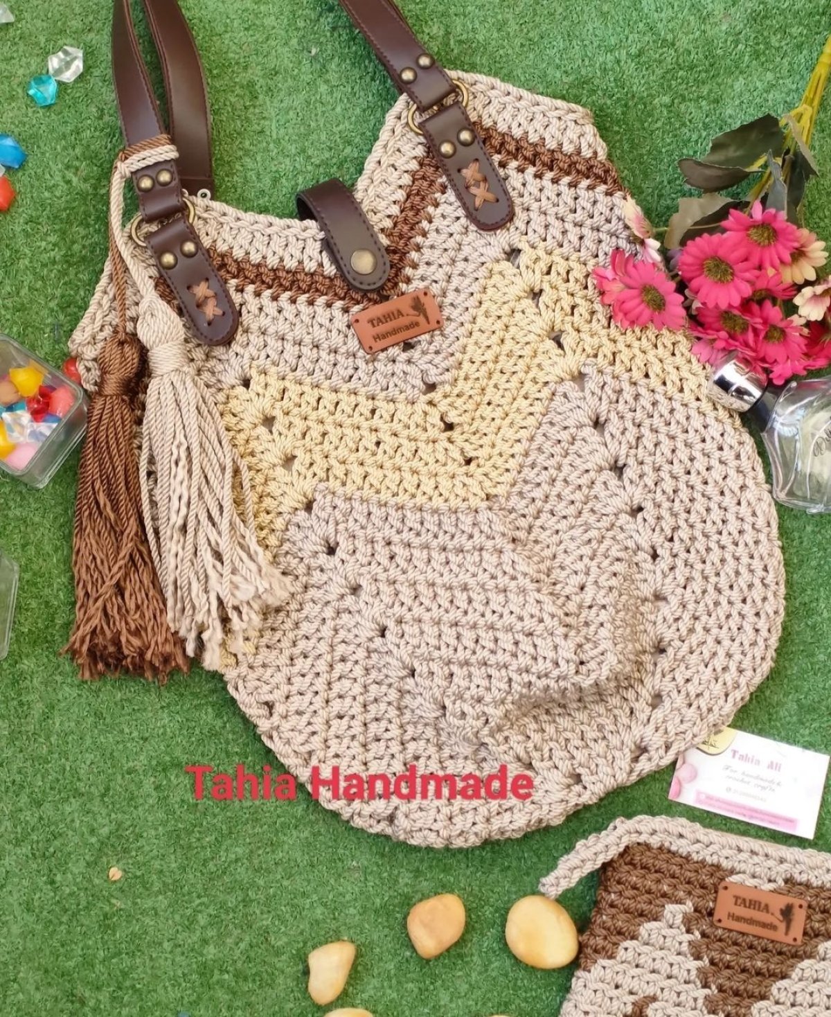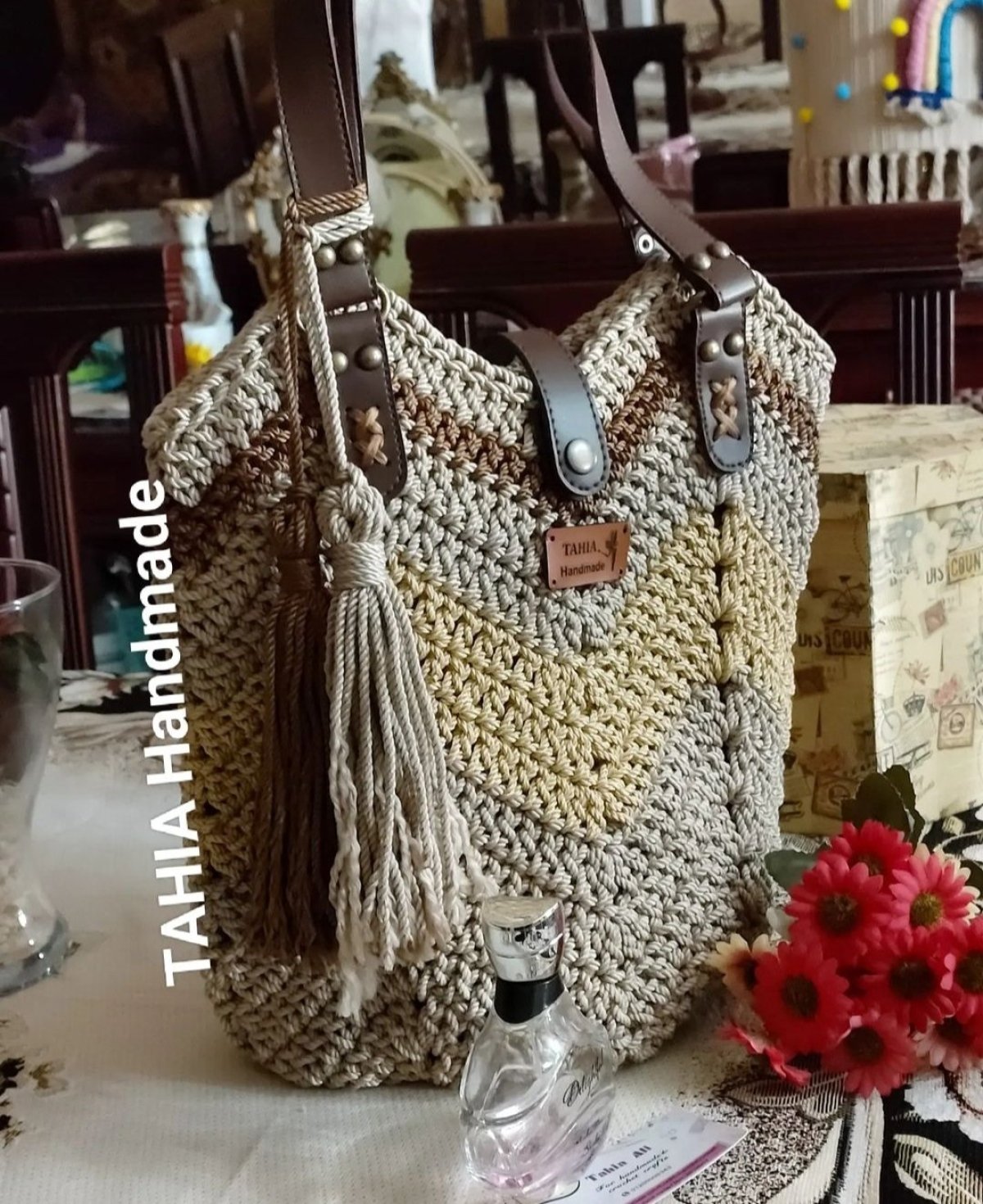 شنطة حريمى كروشيه من أفضل الخيوط يد جلد مقاس كبير مبطنة من الداخل