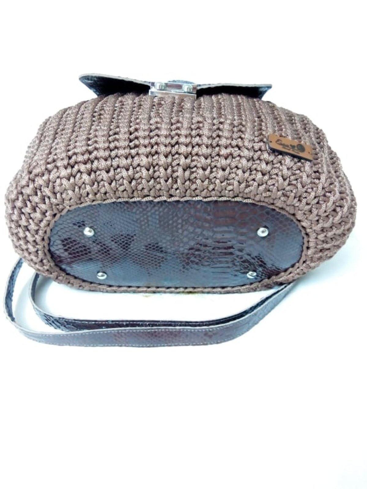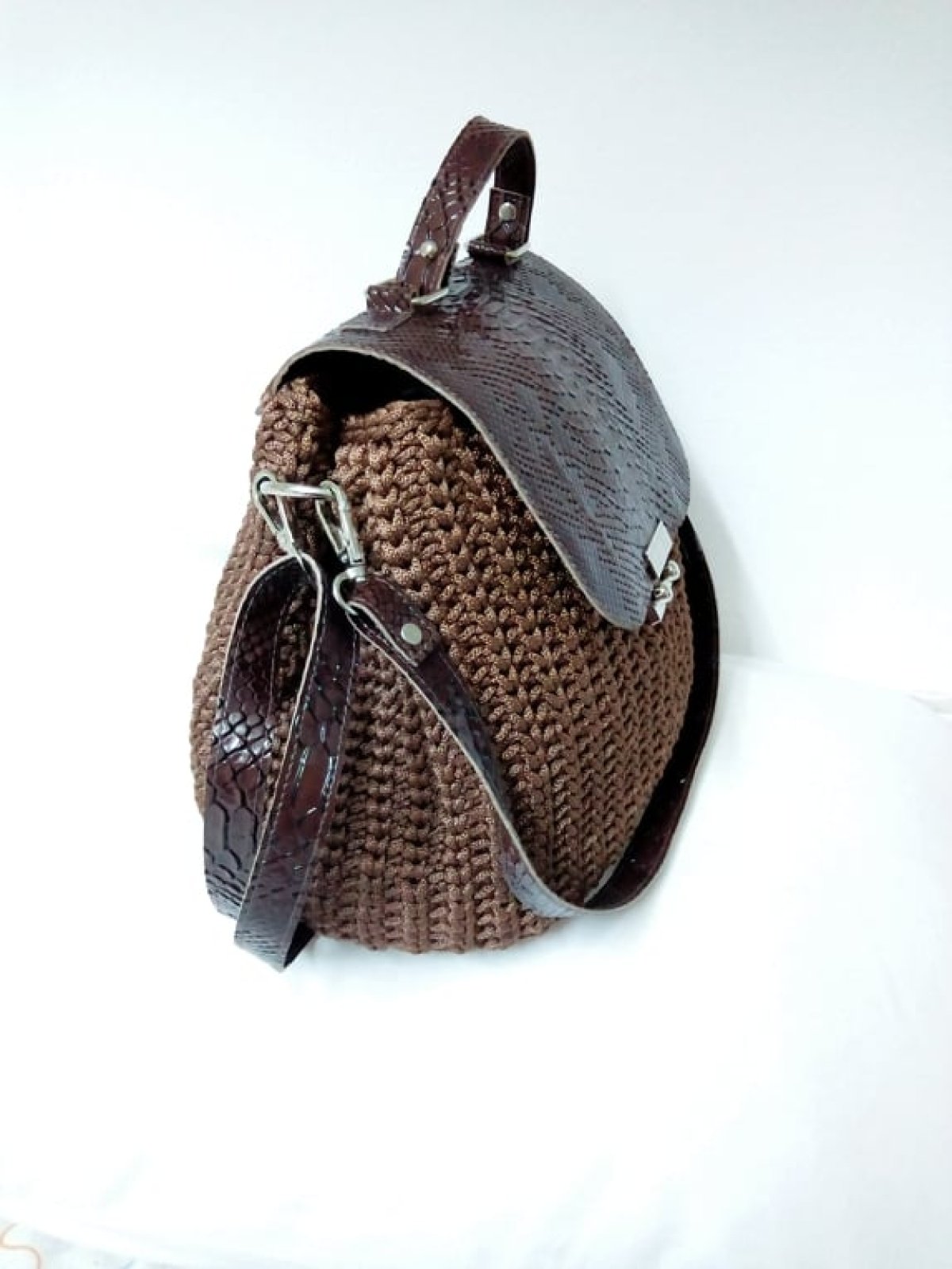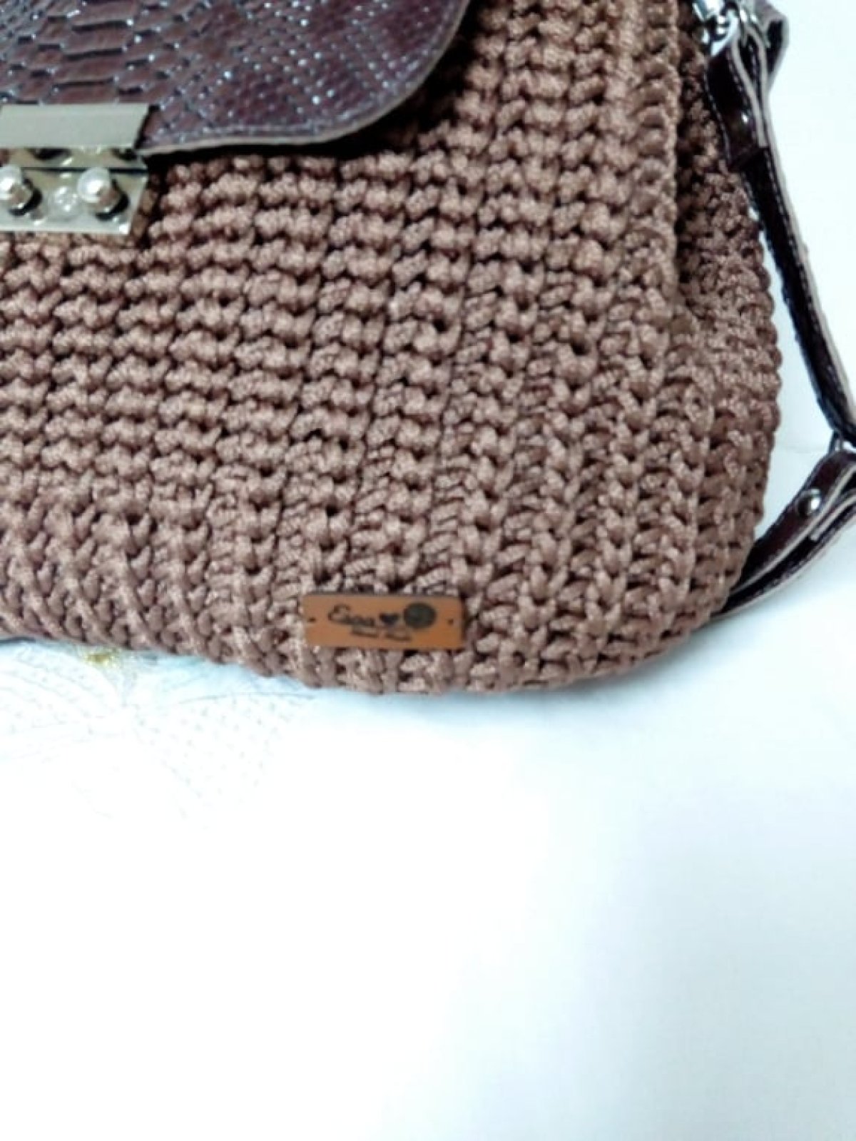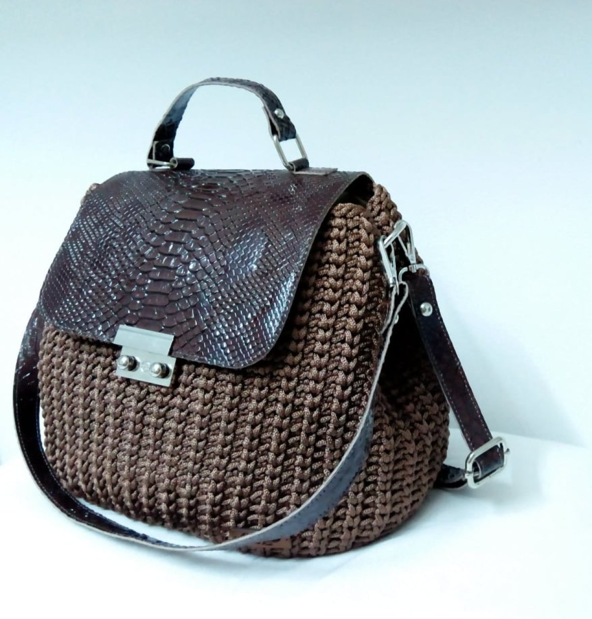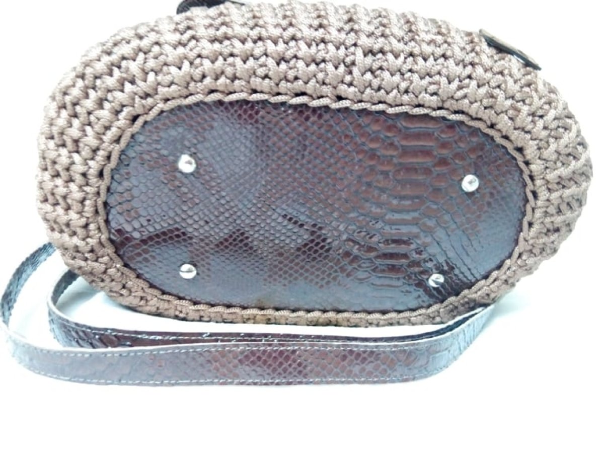 • شنطة هاند ميد كروشيه ، تتميز بالدمج بين خيوط السلسلة والجلد .