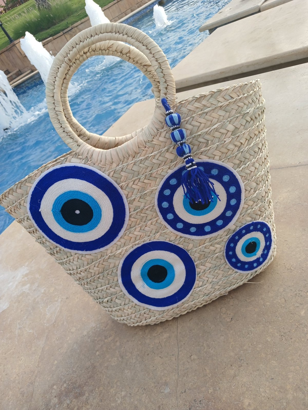شنطة من الخوص مطعمة بالعيون والأحجار والقواقع