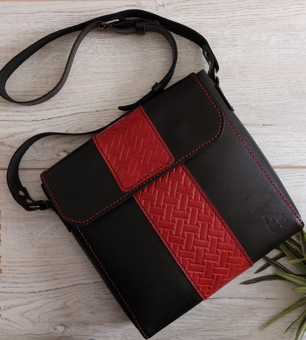 حقيبة مصنوعة يدويا من الجلد الطبيعي بتصميم مميز لون ابيض مع نقش اسود مقاس 25سم 22سم