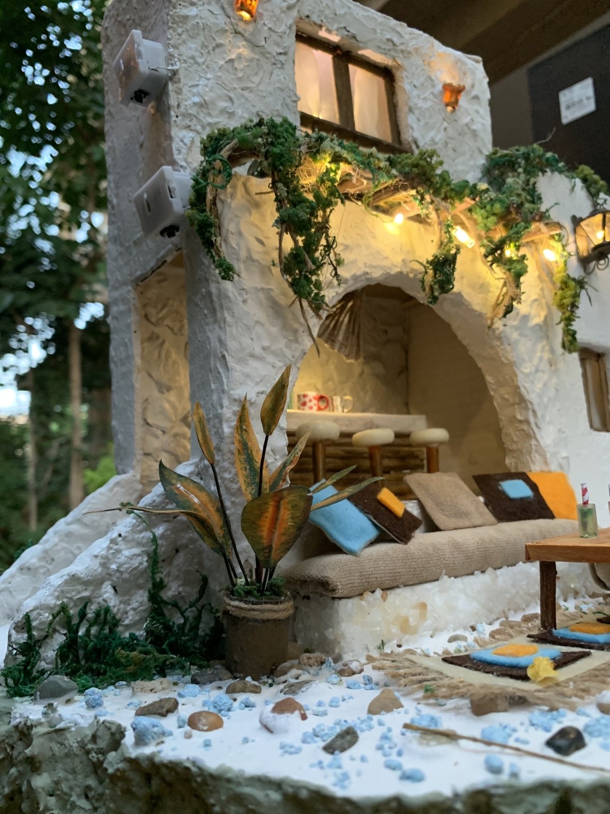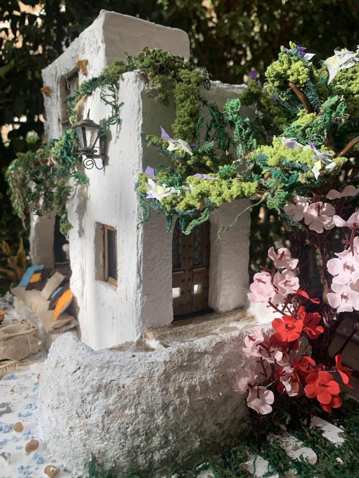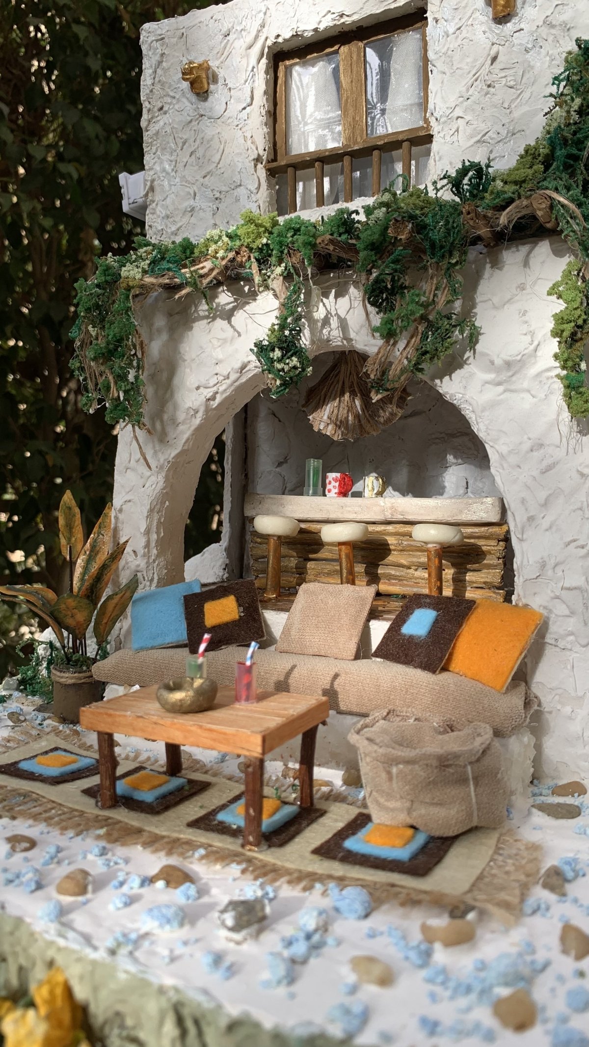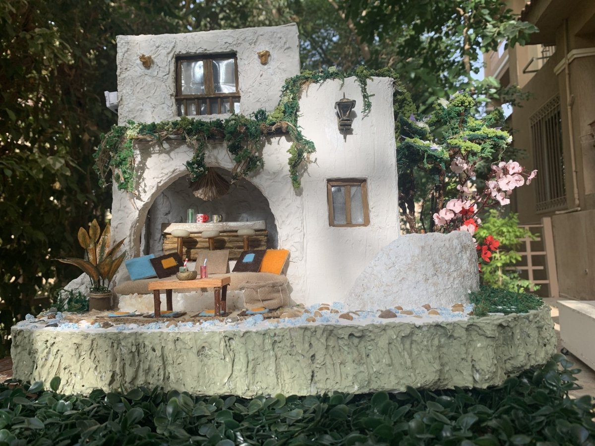 ماكيت من فن المصغرات لبيت عائلي دافئ يبعث الراحة في النفس .. مصنوع يدويا من خامات متعددة منها الكرتون والجبس والخشب والورق والقماش والنباتات الصناعيه والزلط وغيرها ومزود بإضاءة .. الأبعاد: عرض ٥٣ عمق ٣٠ ارتفاع ٣٧ سنتي