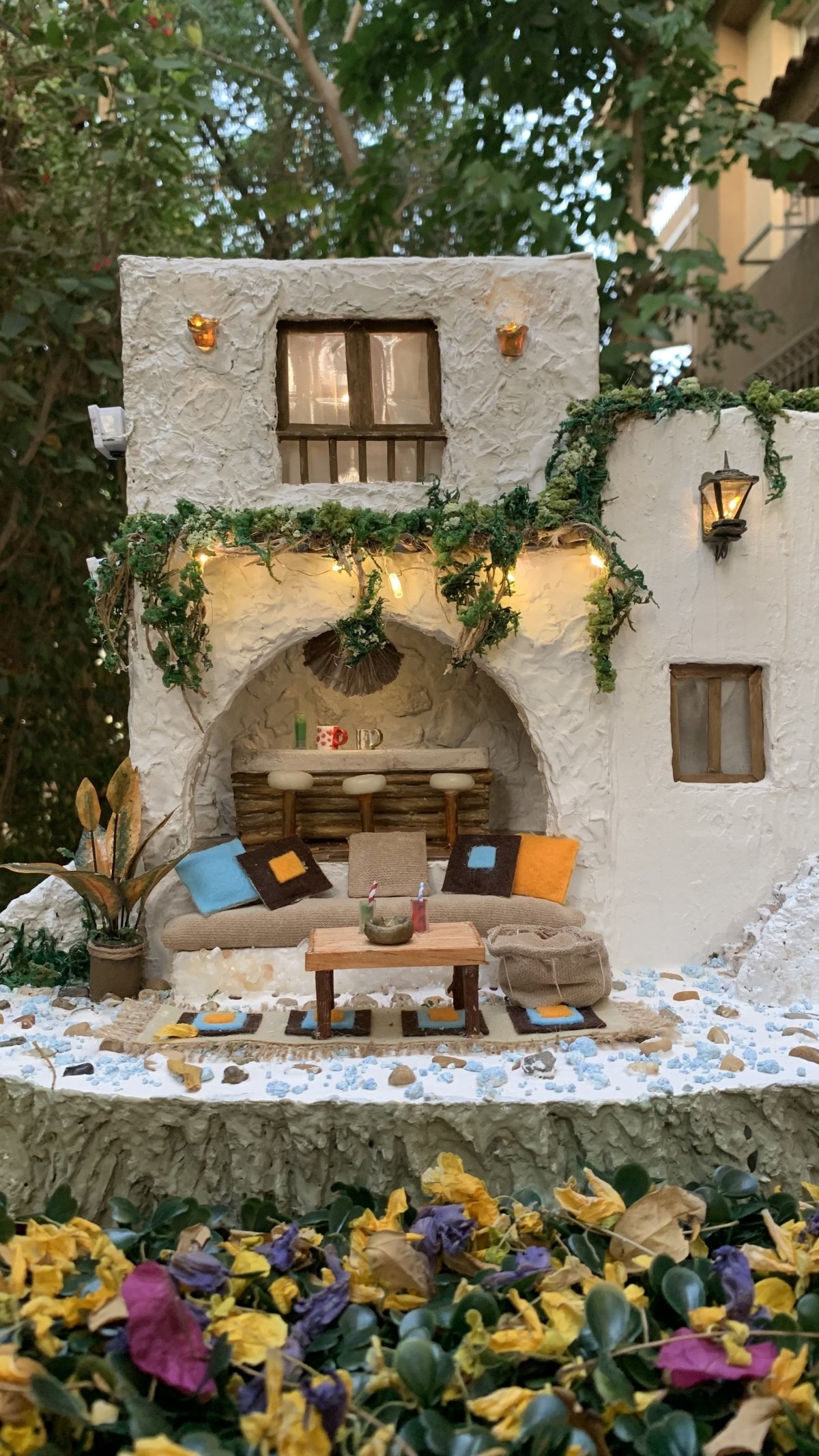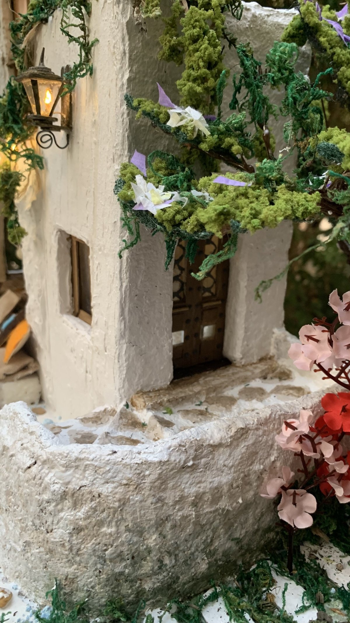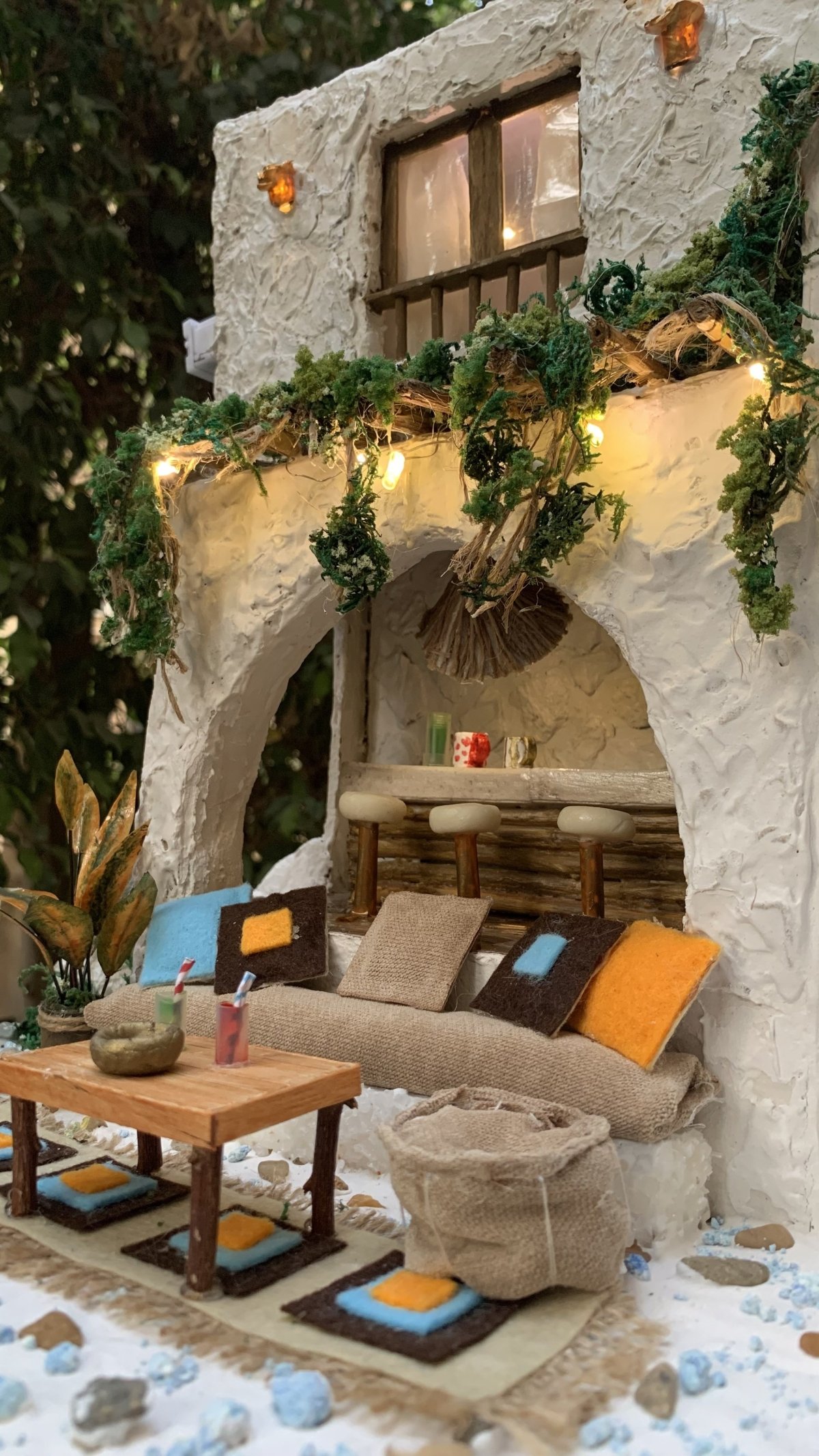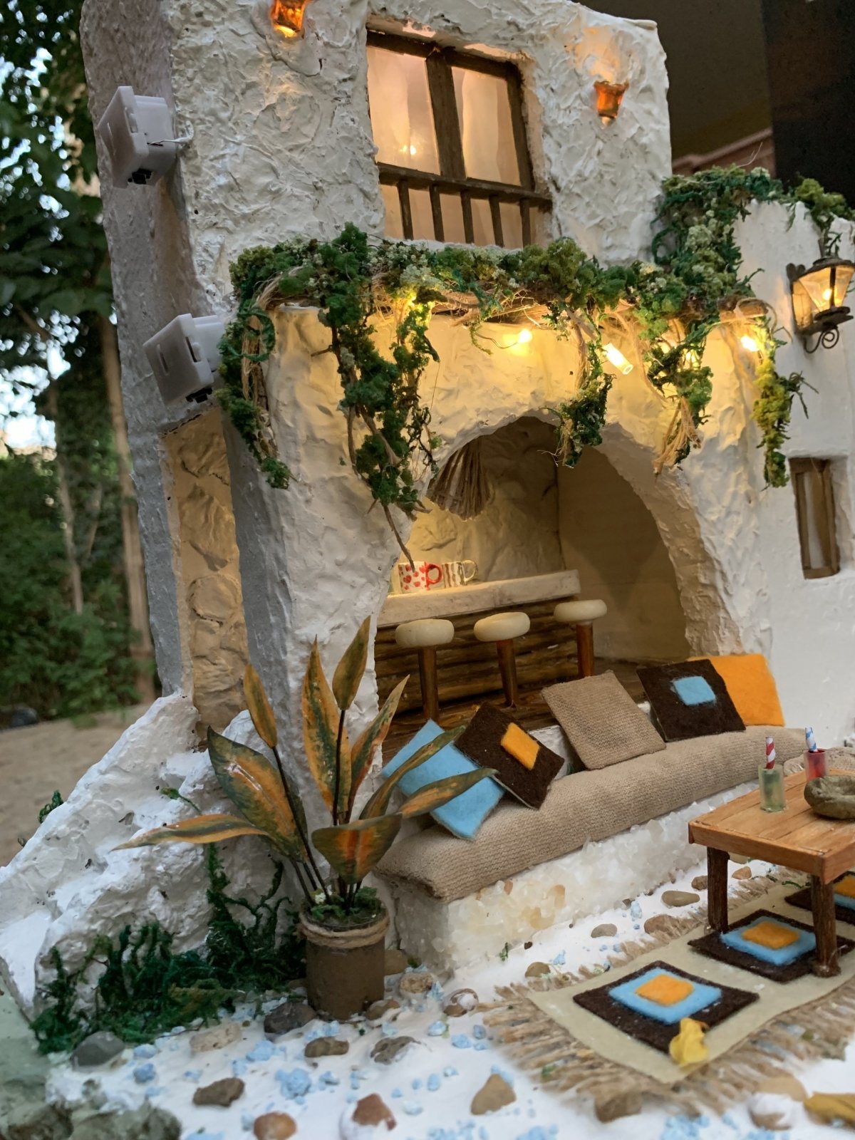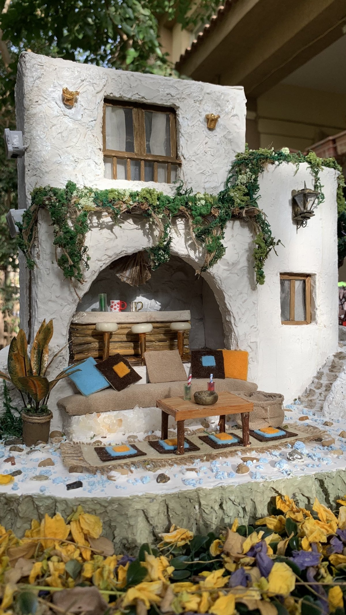 ماكيت من فن المصغرات لبيت عائلي دافئ يبعث الراحة في النفس .. مصنوع يدويا من خامات متعددة منها الكرتون والجبس والخشب والورق والقماش والنباتات الصناعيه والزلط وغيرها ومزود بإضاءة .. الأبعاد: عرض ٥٣ عمق ٣٠ ارتفاع ٣٧ سنتي