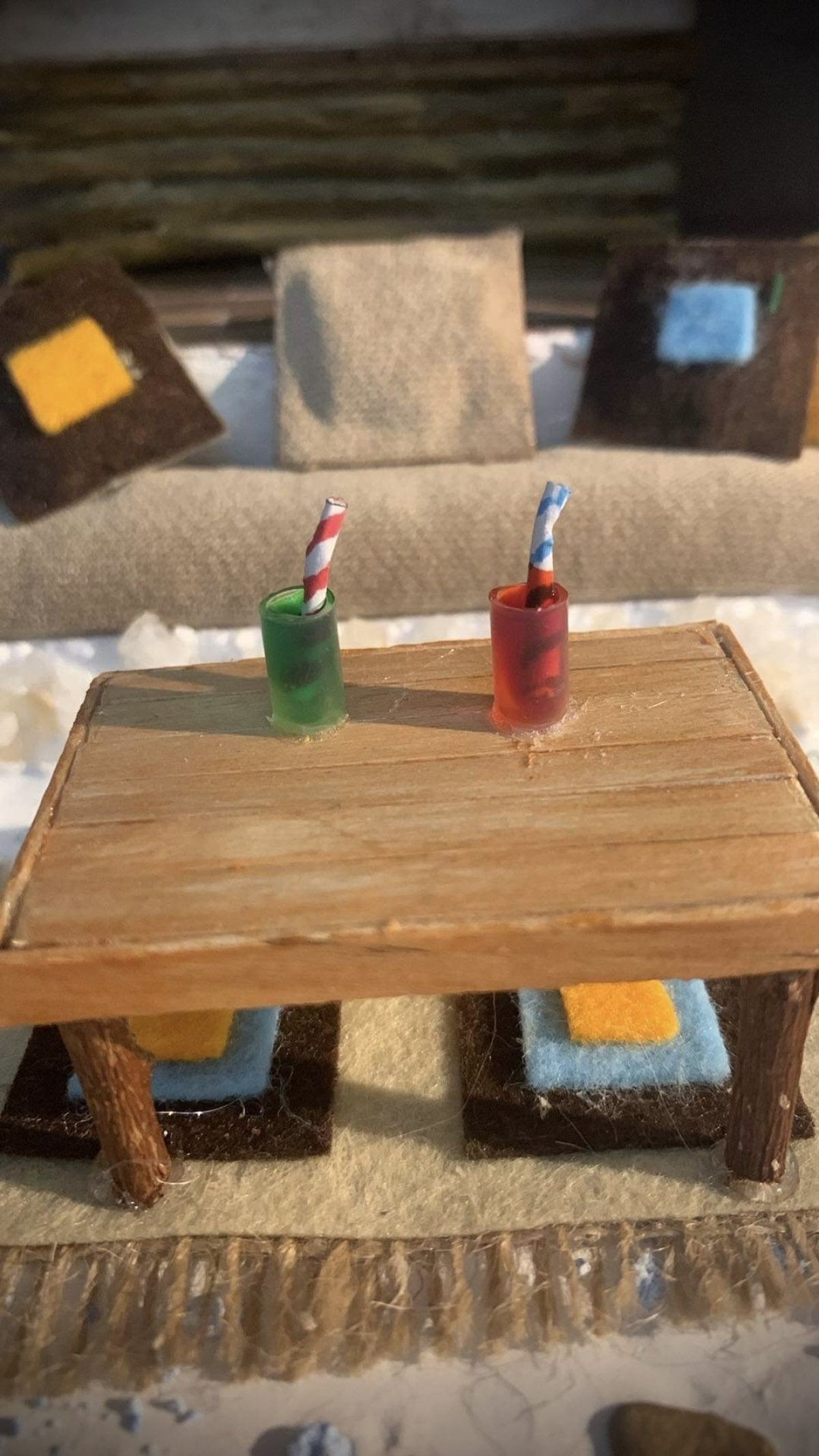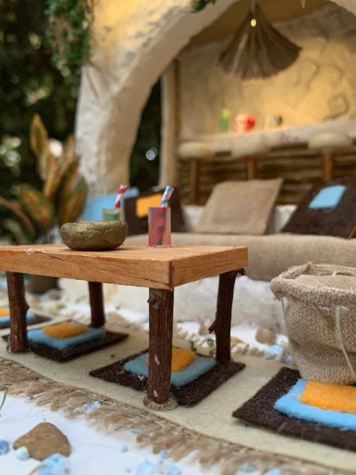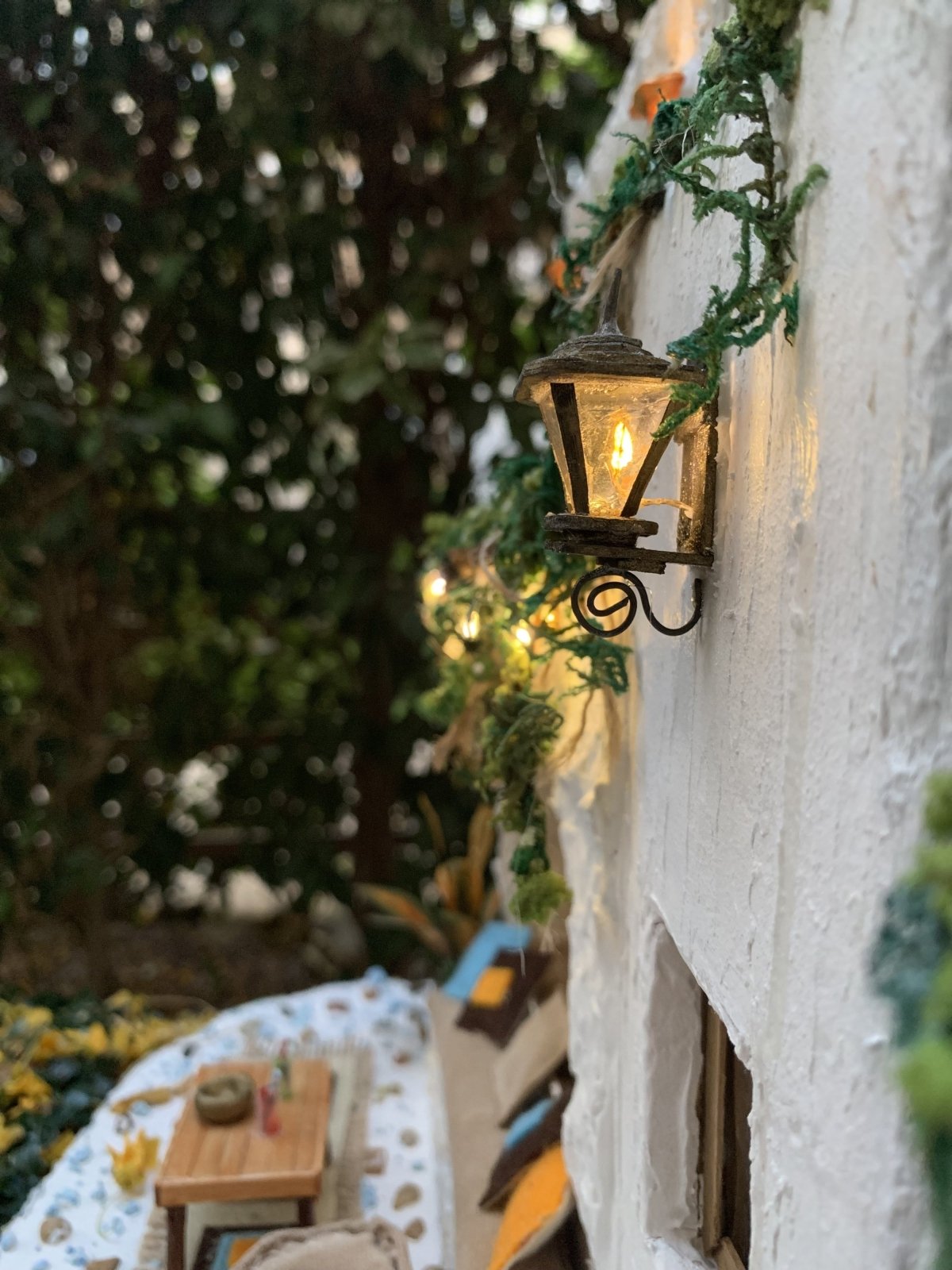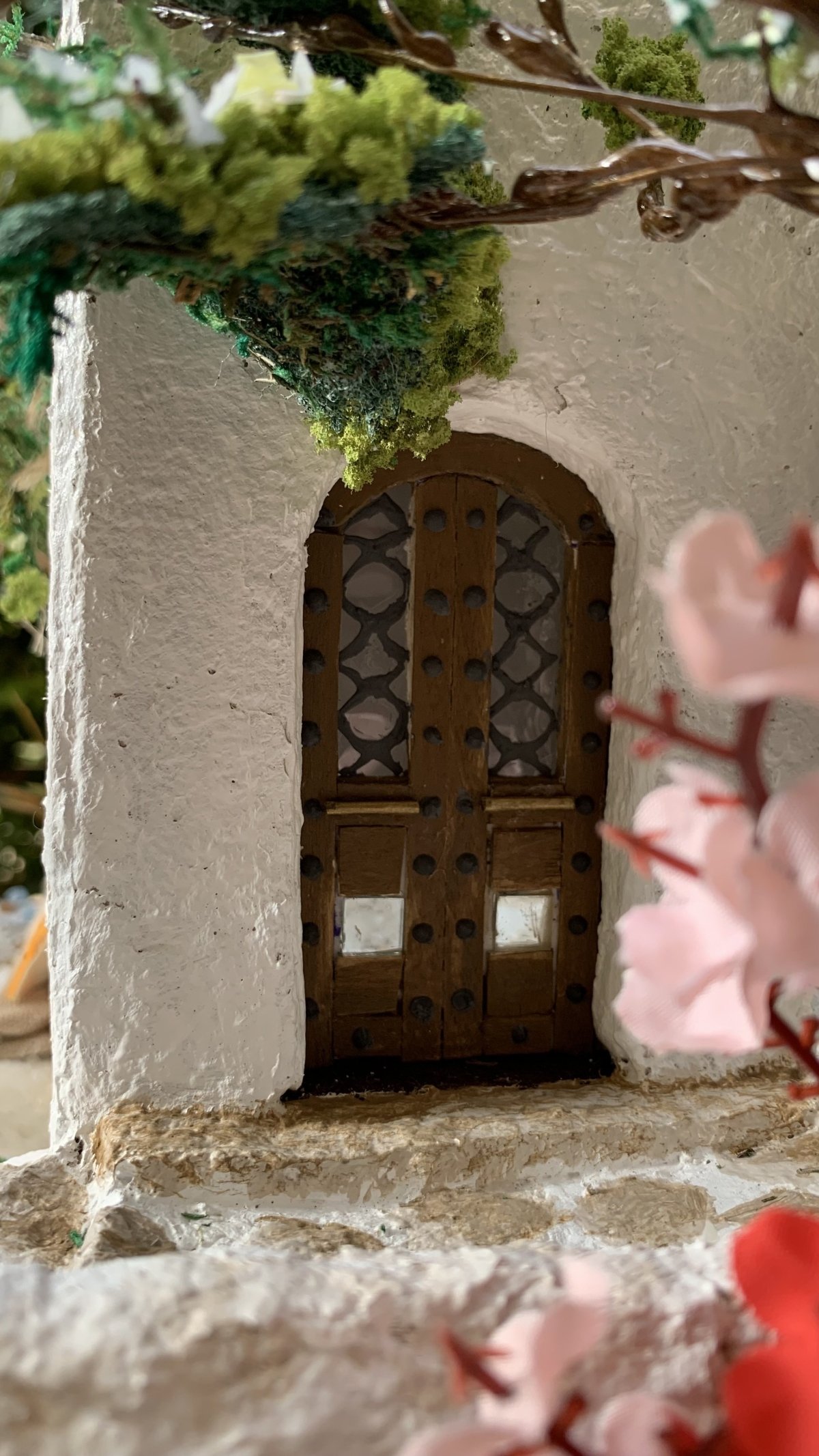 ماكيت من فن المصغرات لبيت عائلي دافئ يبعث الراحة في النفس .. مصنوع يدويا من خامات متعددة منها الكرتون والجبس والخشب والورق والقماش والنباتات الصناعيه والزلط وغيرها ومزود بإضاءة .. الأبعاد: عرض ٥٣ عمق ٣٠ ارتفاع ٣٧ سنتي