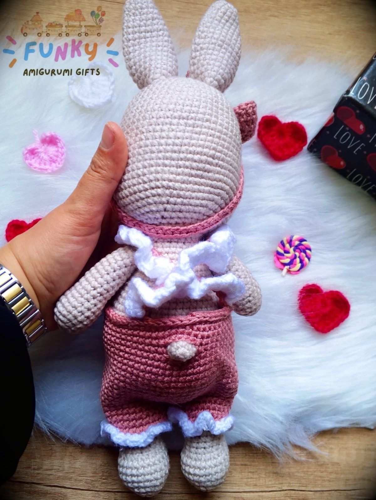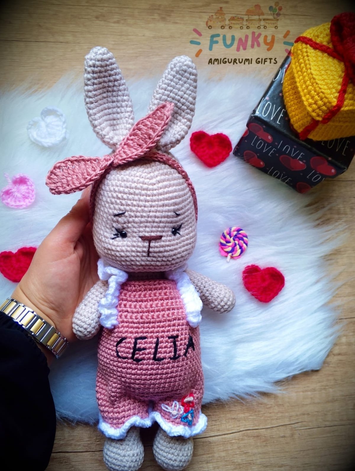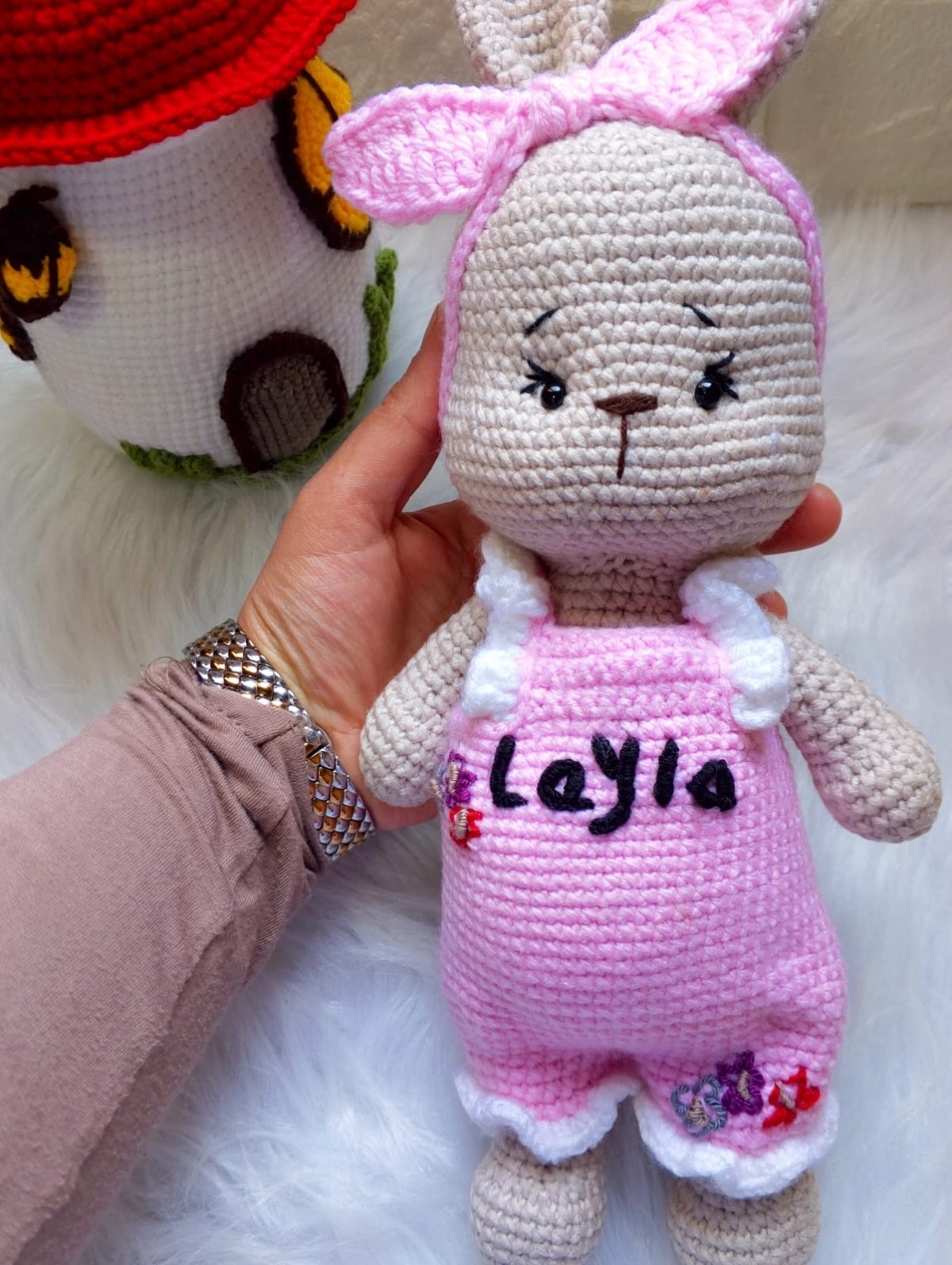 ارنب طوله حوالي 24 سم ومن الممكن تغيير الالوان وكتابة اسم الطفل عليه