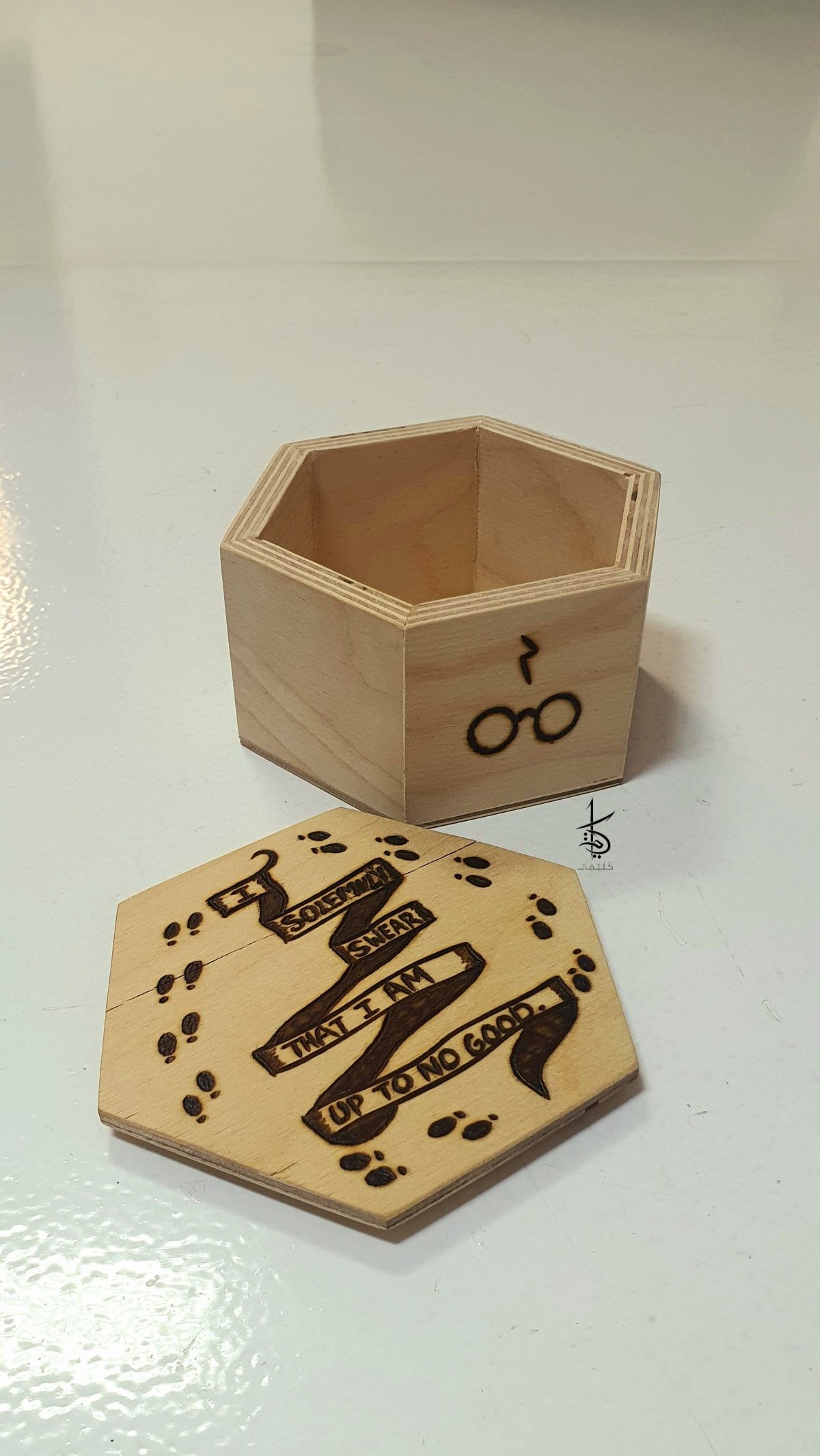 صندوق خشب صغير سداسي الشكل، بتصميم فريد من نوعه، نفَّذناه بفن الحرق اليدوي على الخشب.