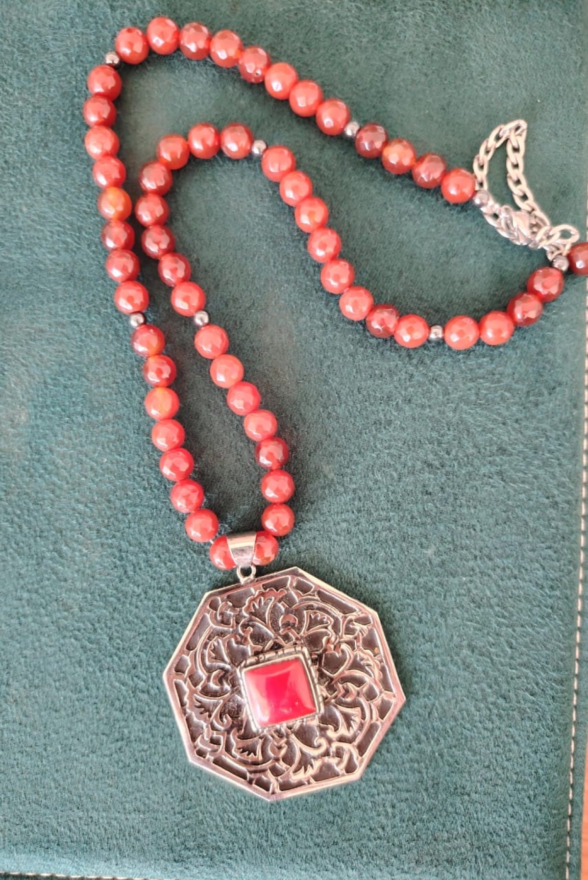 عقد من العقيق الأحمر مع دلاية من النحاس المطلي