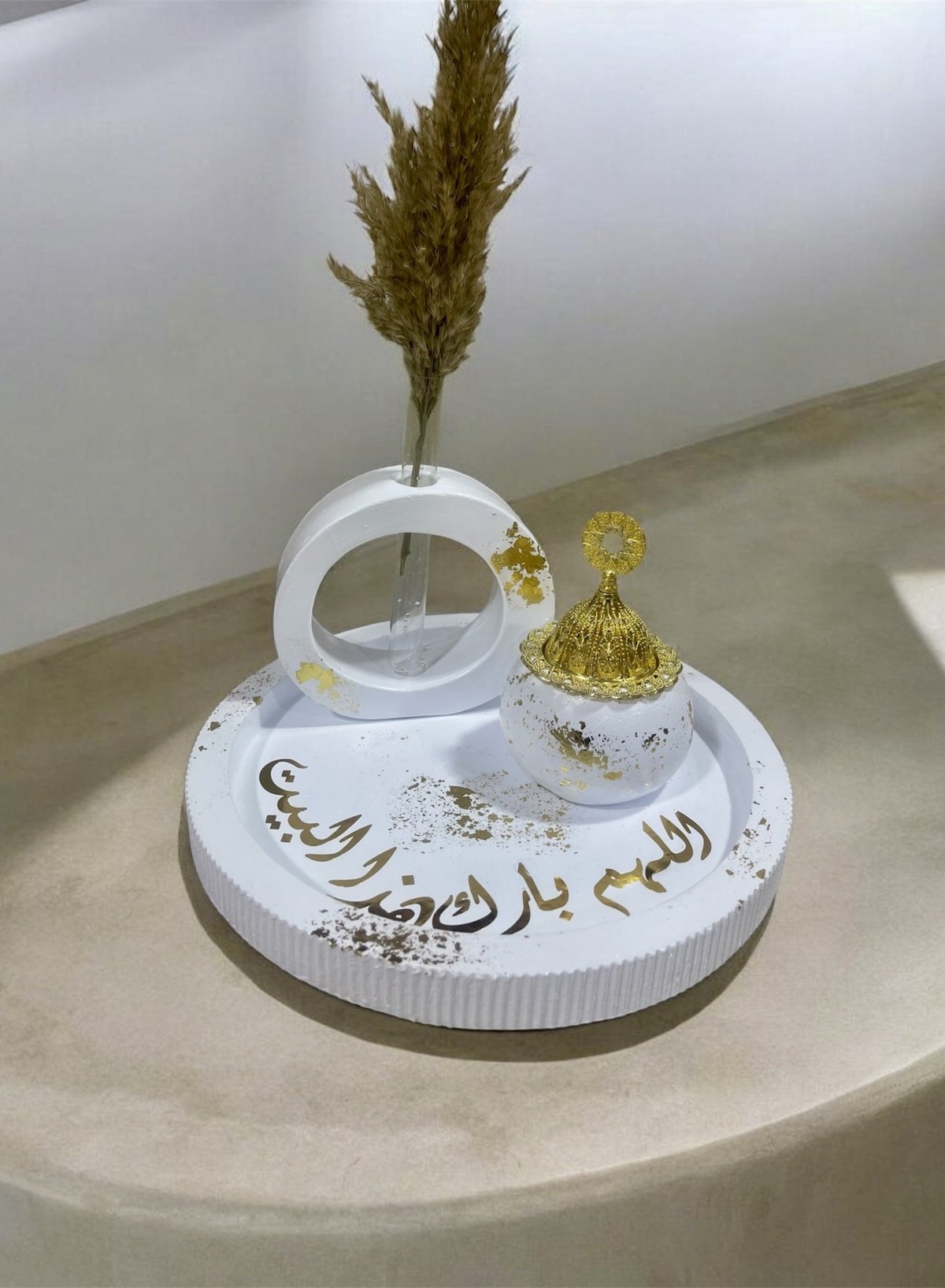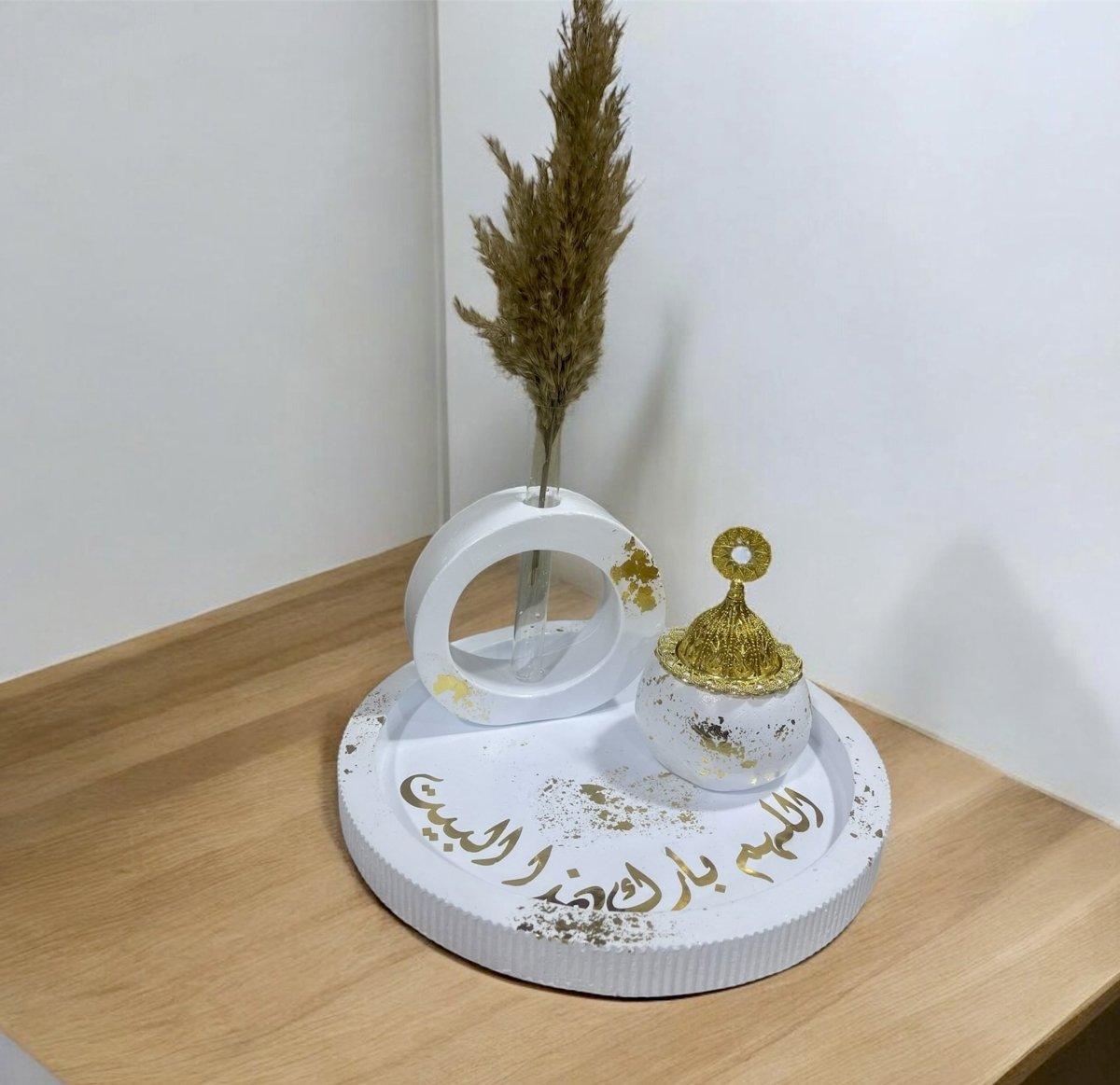 طقم صنيه مزينه بورق الدهب وفازه ومبخره بغطا من اللون الدهبي