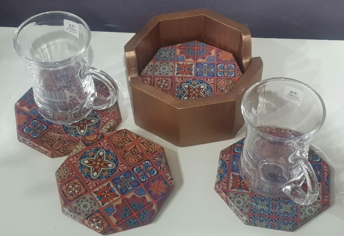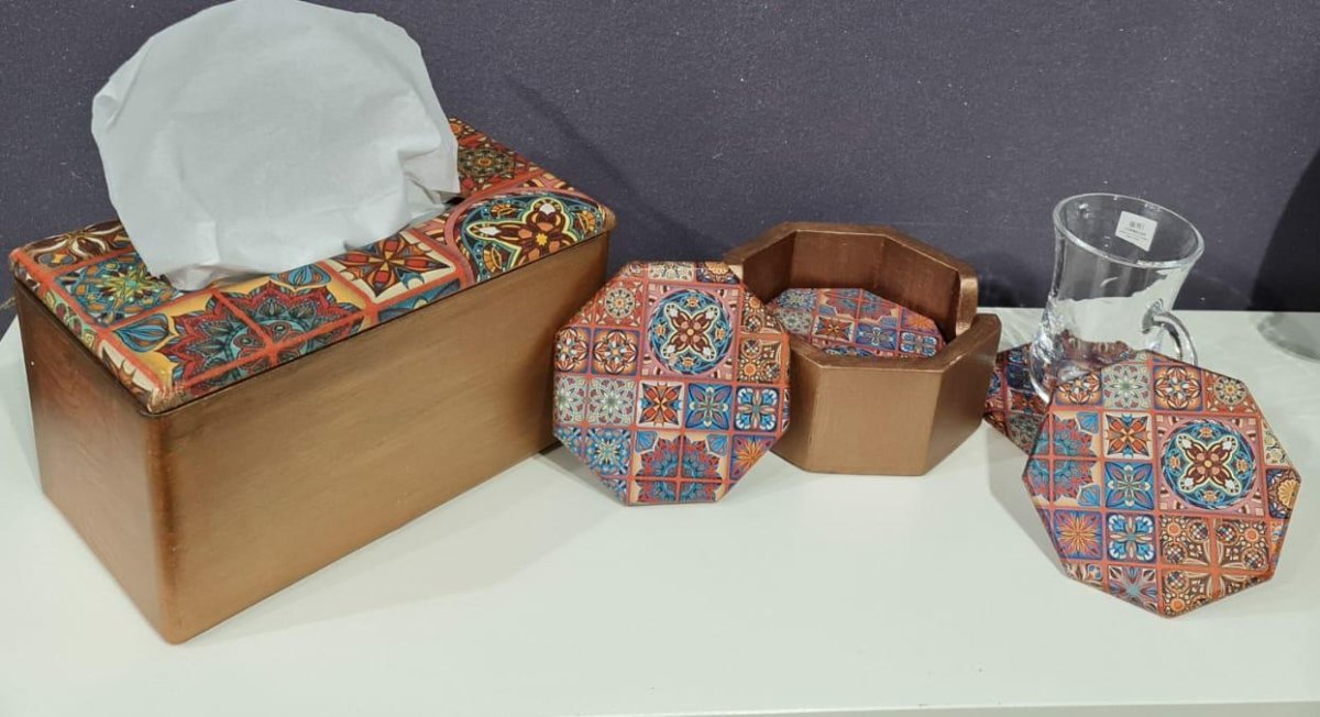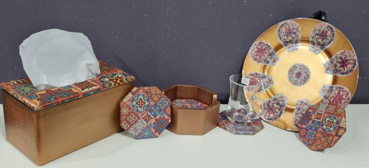 طقم عباره عن علبة مناديل ديكوريه وطقم كوسترات، من الحاجات البسيطه اللي ممكن تغير شكل المكان وتضفي عليه لمسه جماليه وشياكه، ينفع كمان يكون هديه قيمه وفي نفس الوقت سعرها مناسب جدا