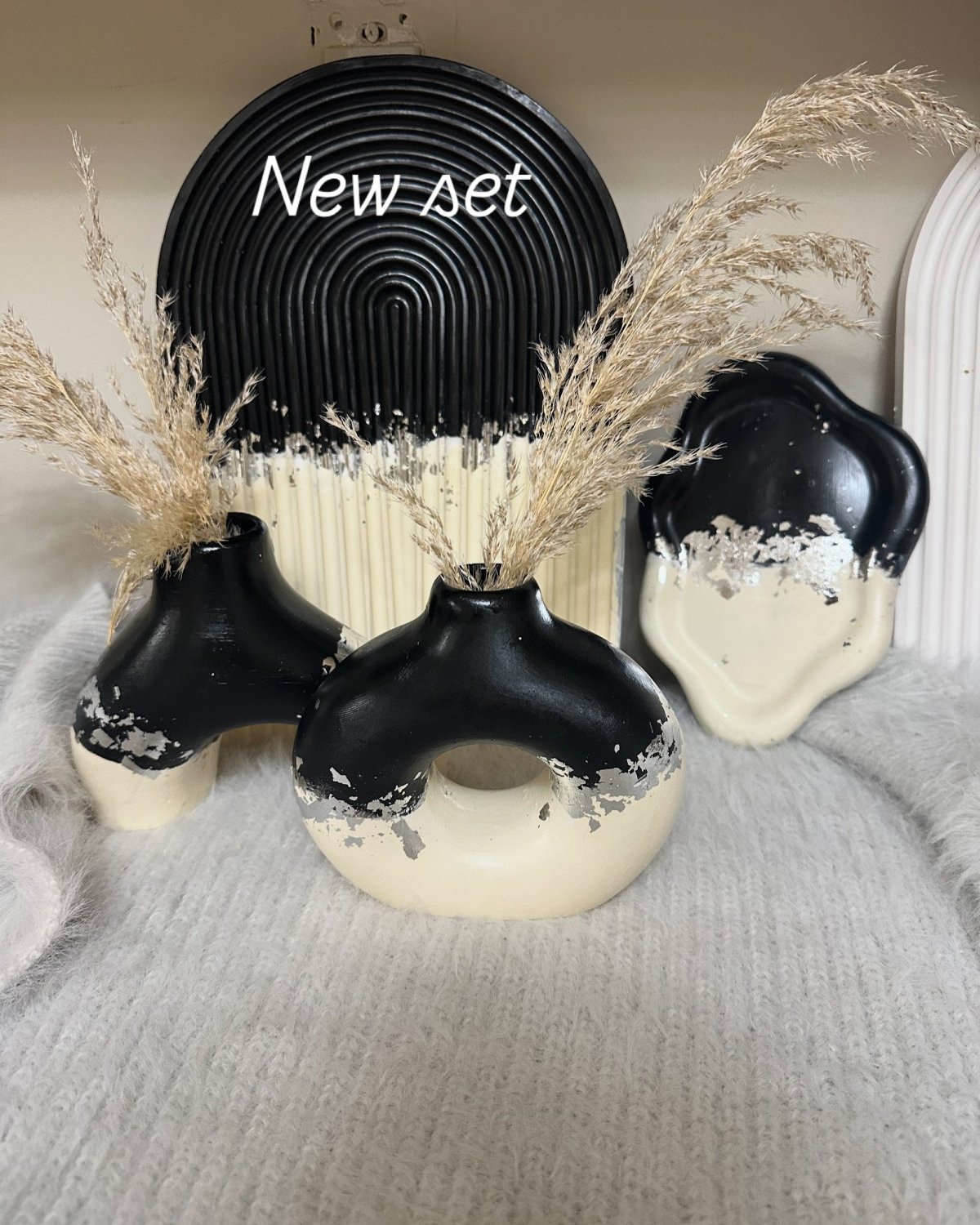 طقم كونكريت مكون من صنيه وفازه دونت وفازه حرف إن وكوستر باللون الأبيض والأسود وورق الفضه ومتاح تغيير اللون