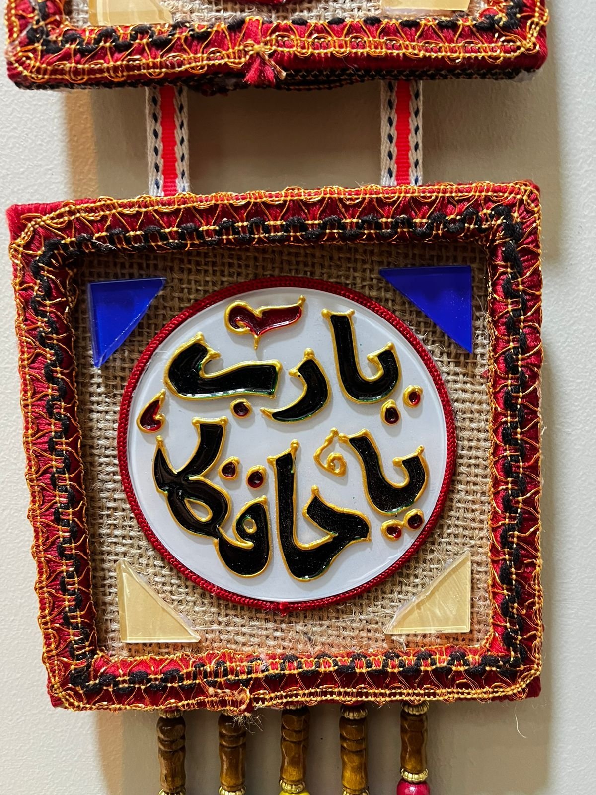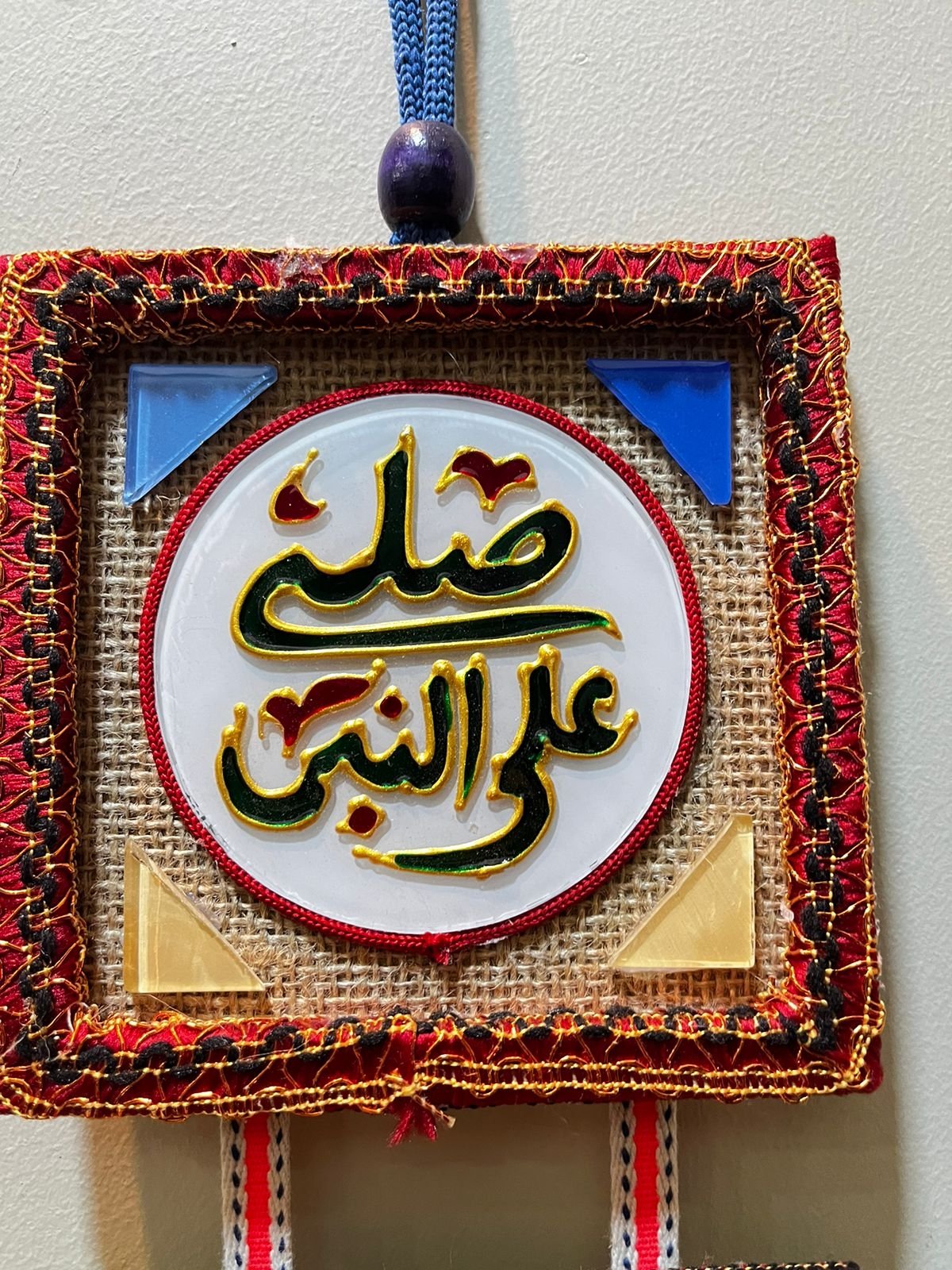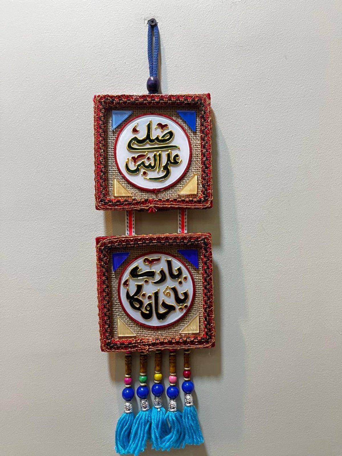 معلقة حائط مرسوم عليها بالوان زجاج صلي على النبي ويارب ياحافظ، ديكور شعبي مصري قديم للترحيب بالزائرين تعلق على باب المنزل او الحائط
