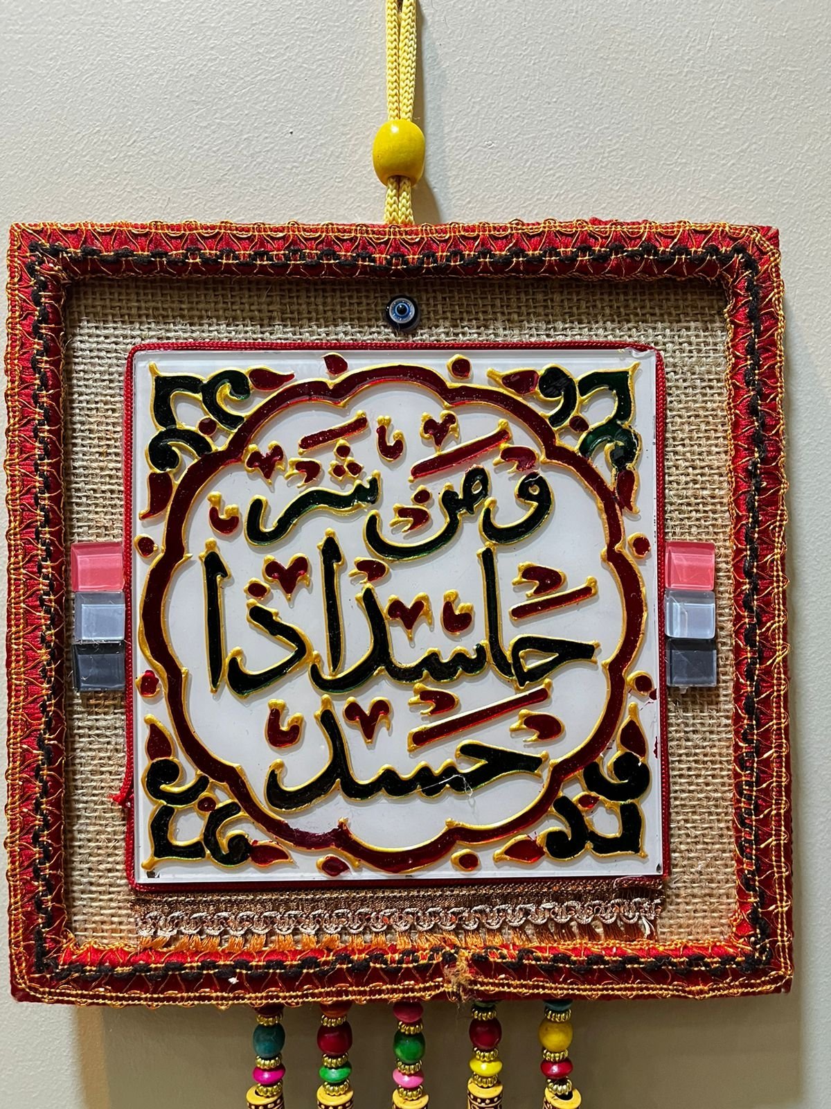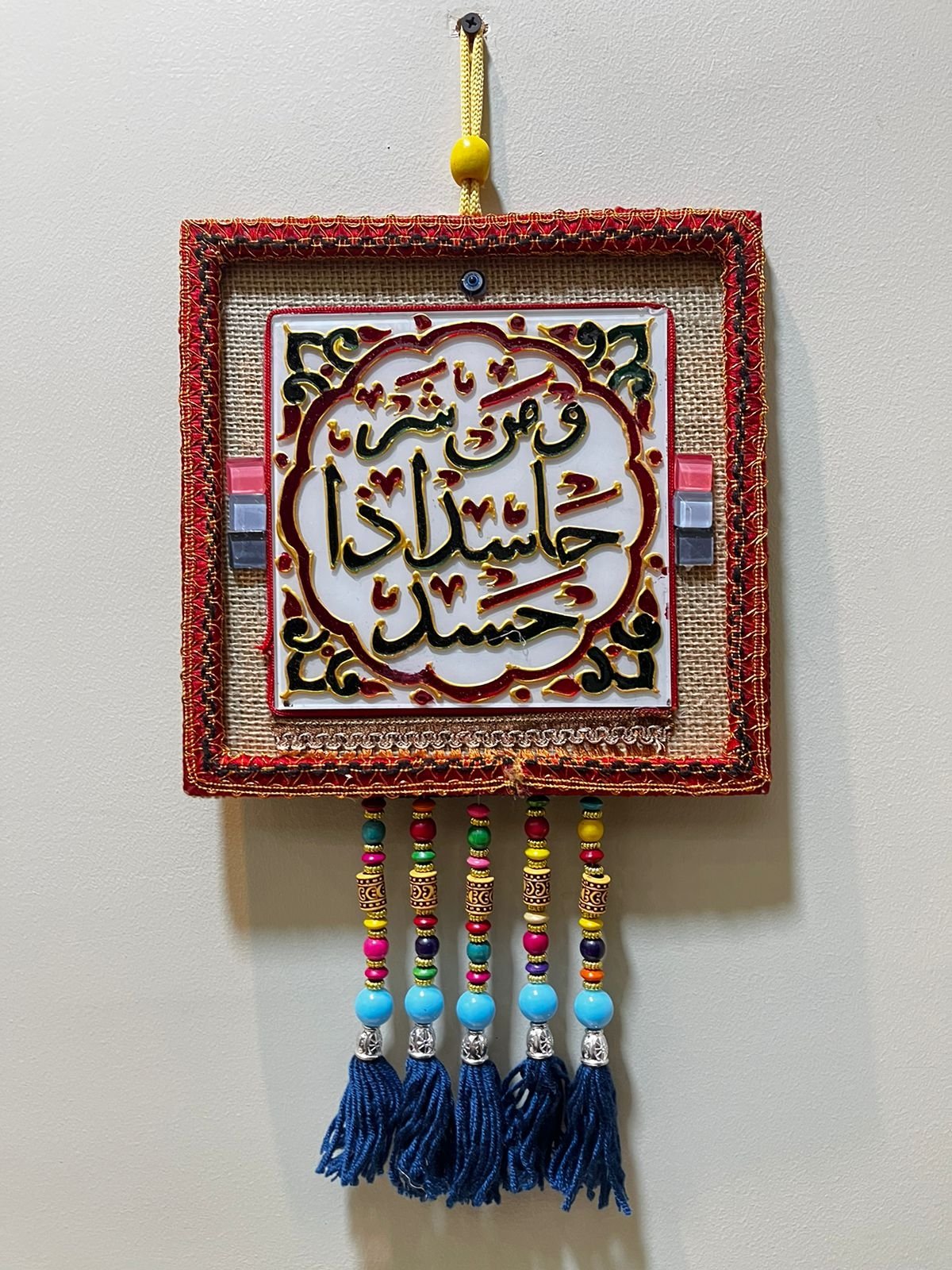 معلقة حائط مرسوم عليها بالوان زجاج ومن شر حاسد إذا حسد، صناعة يدوية متقنة من الخشب والاكليريك والخيش مقاس 24x27