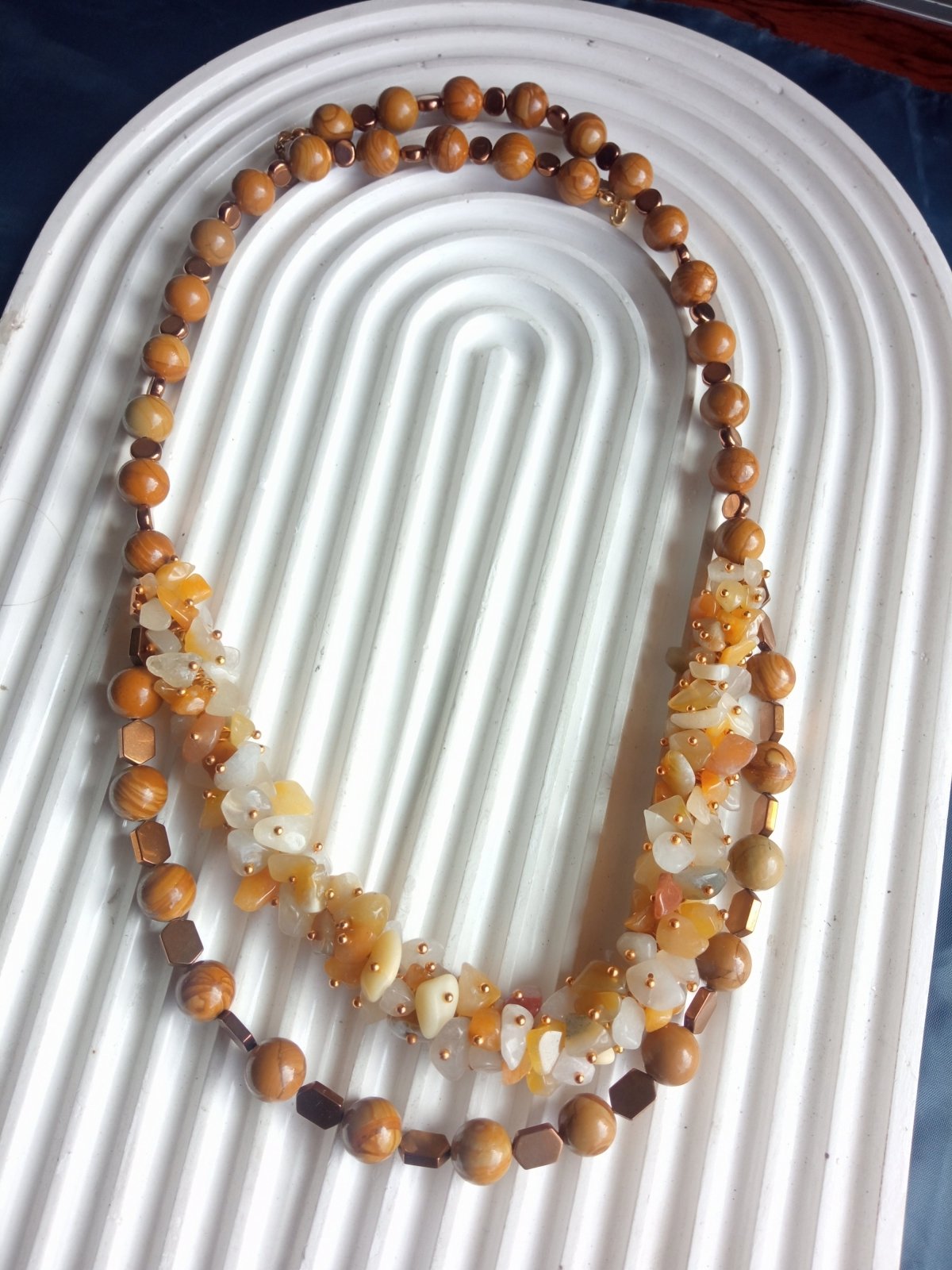 كوليه من حجر ال چاسبر مع كسر حجر عقيق و فواصل هيماتيت لا تصدأ