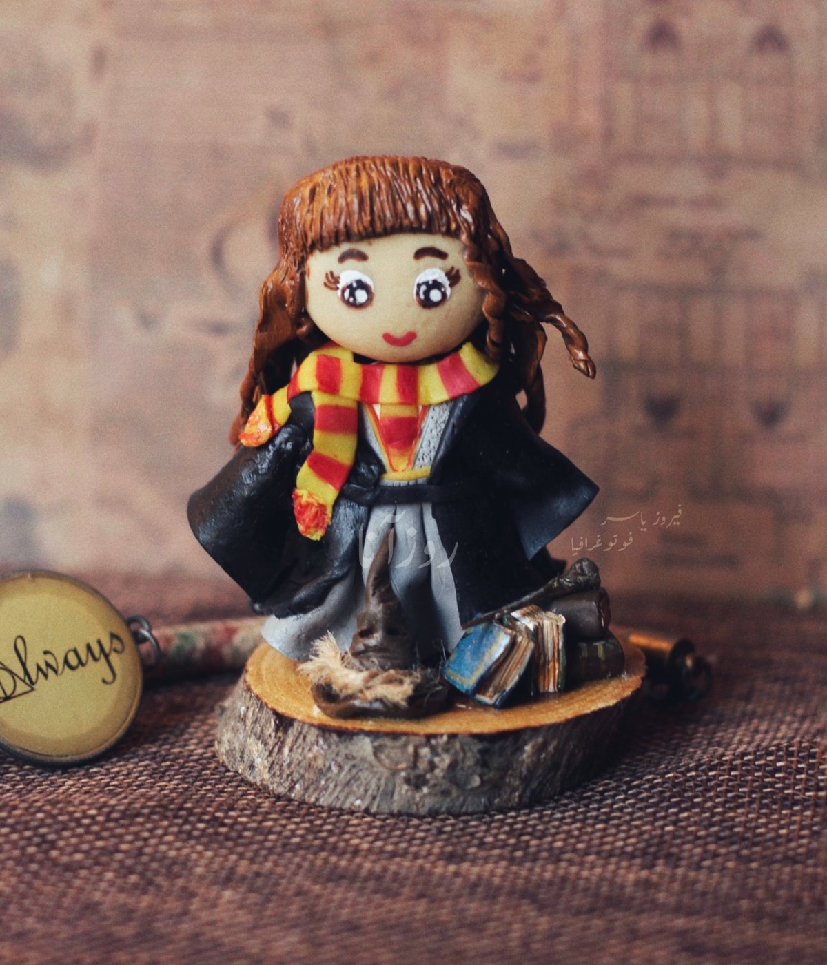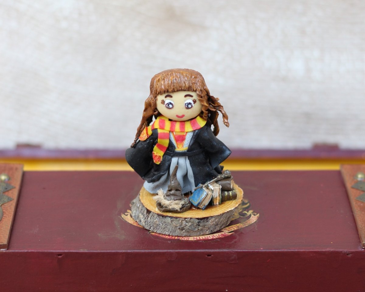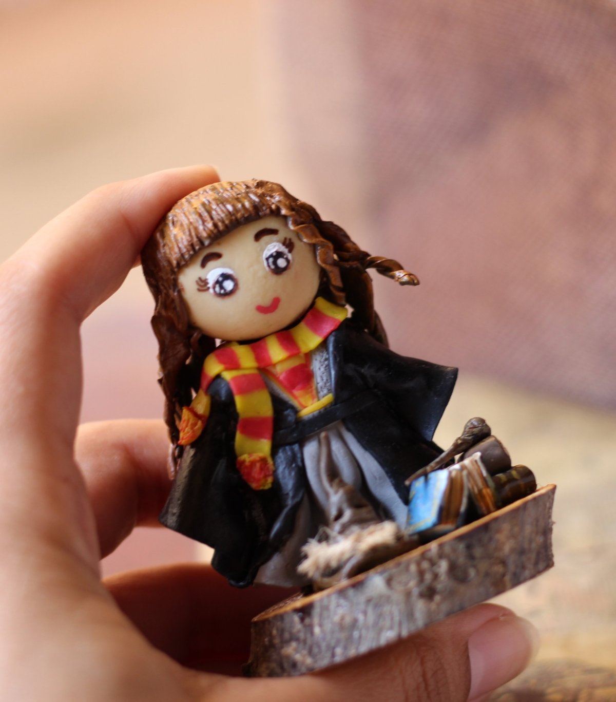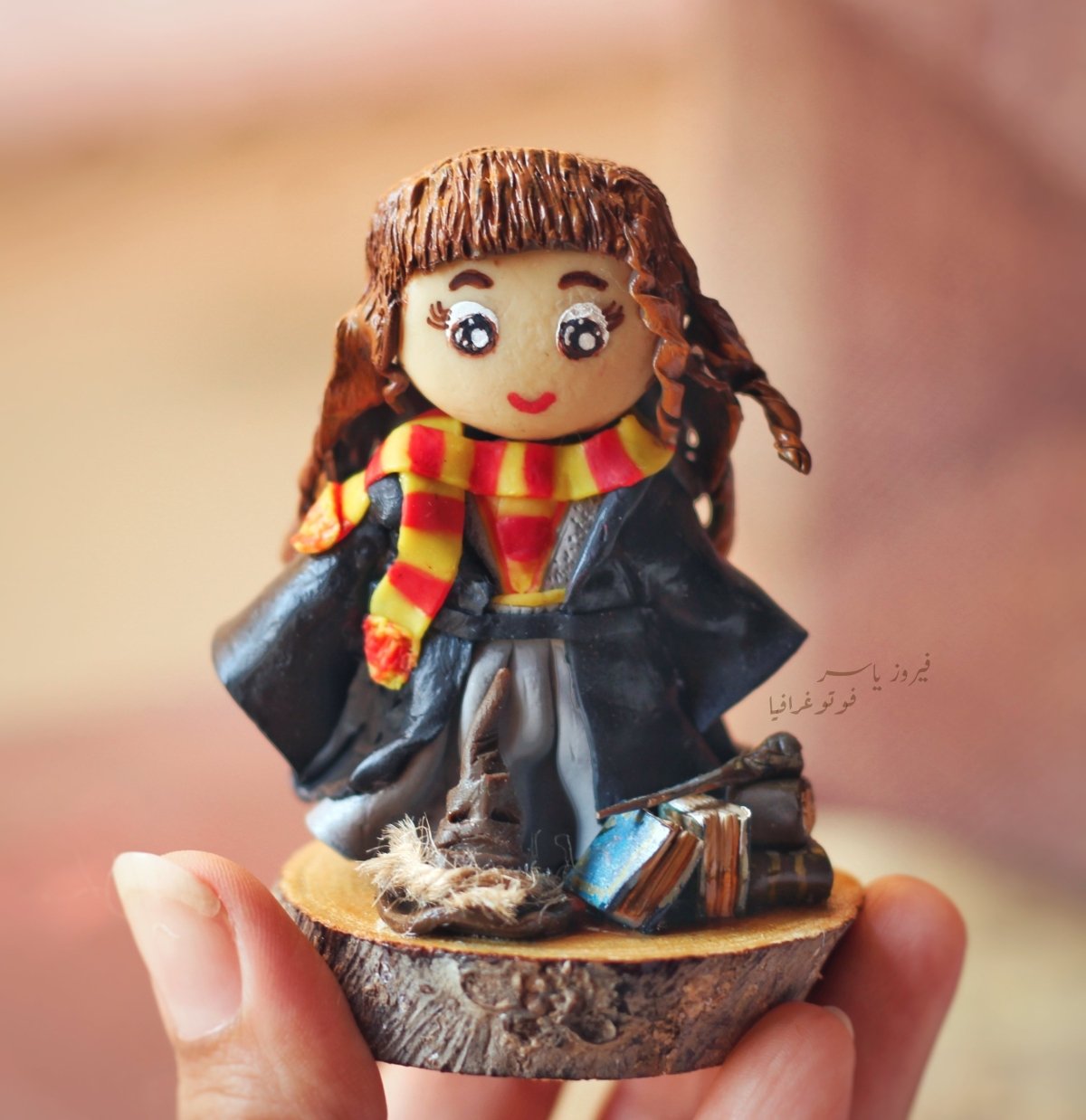 - مصغر من الصلصال الحراري لمحبي هيرميوني على جذع من الخشب