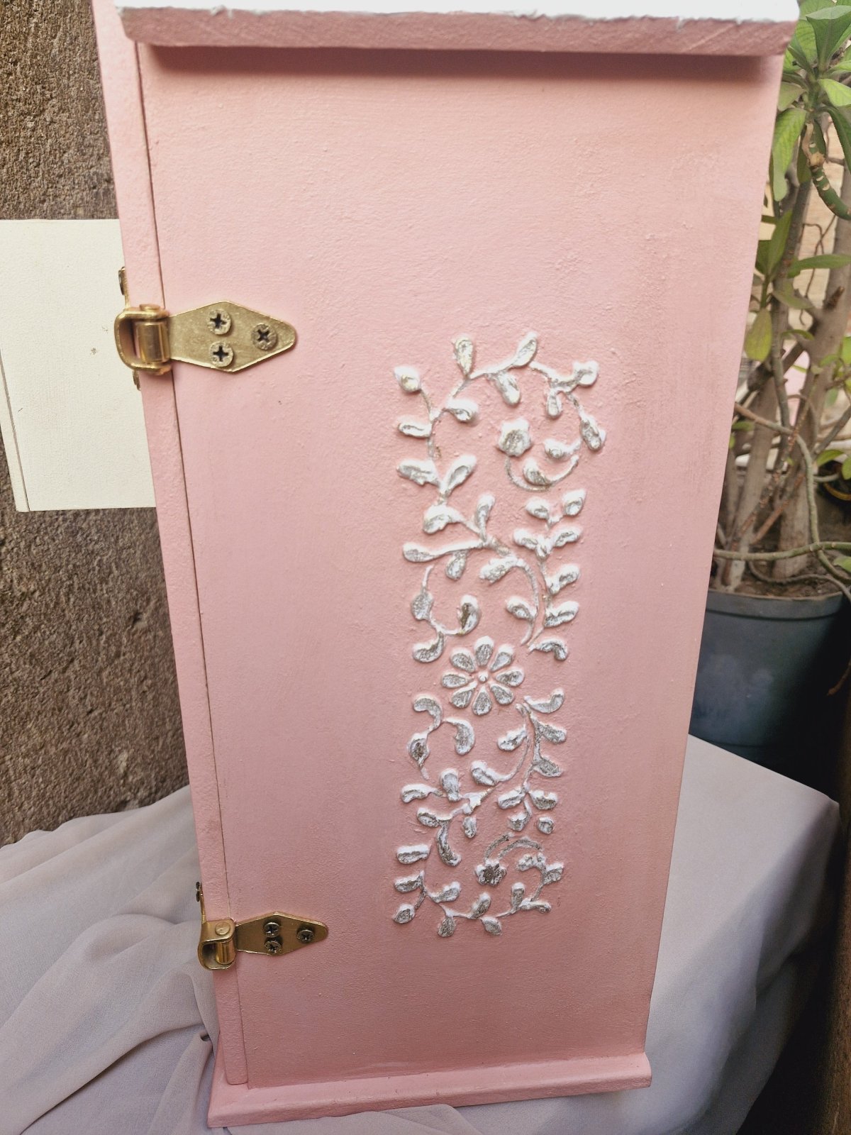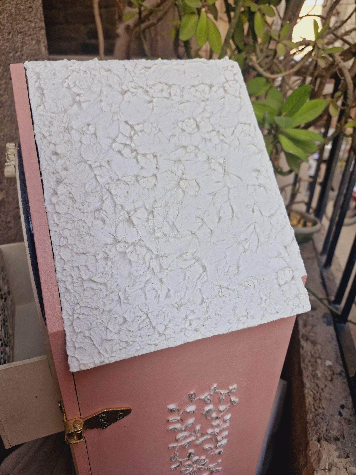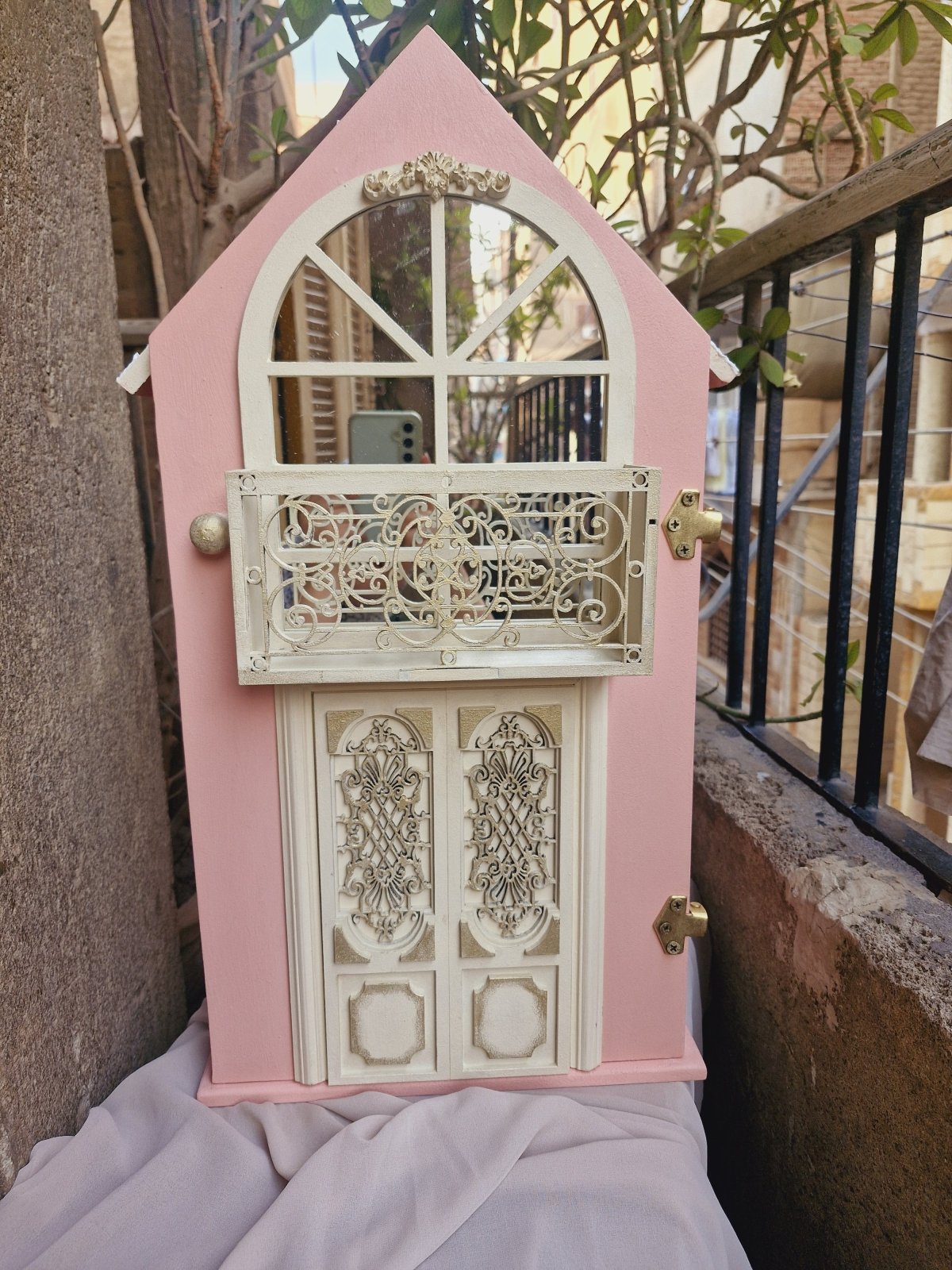 بوكس من الخشب مصمم علي شكل منزل ومصمم من جناب برسومات بارزه ومقسم من الداخل الارتفاع ٦٠ والعرض ٤٠ والعمق ٤٠