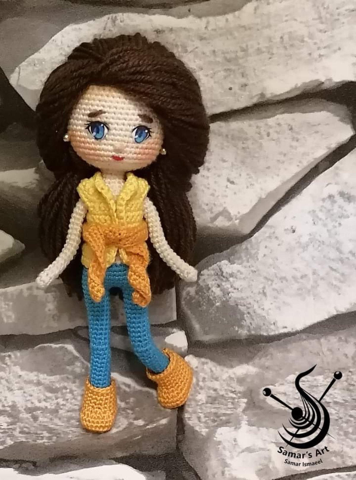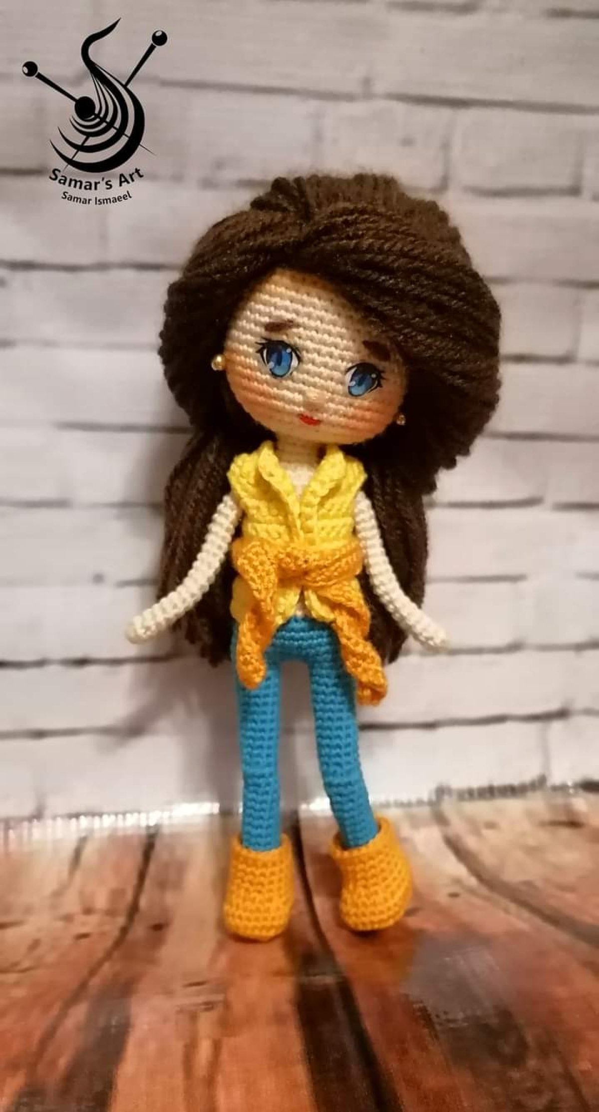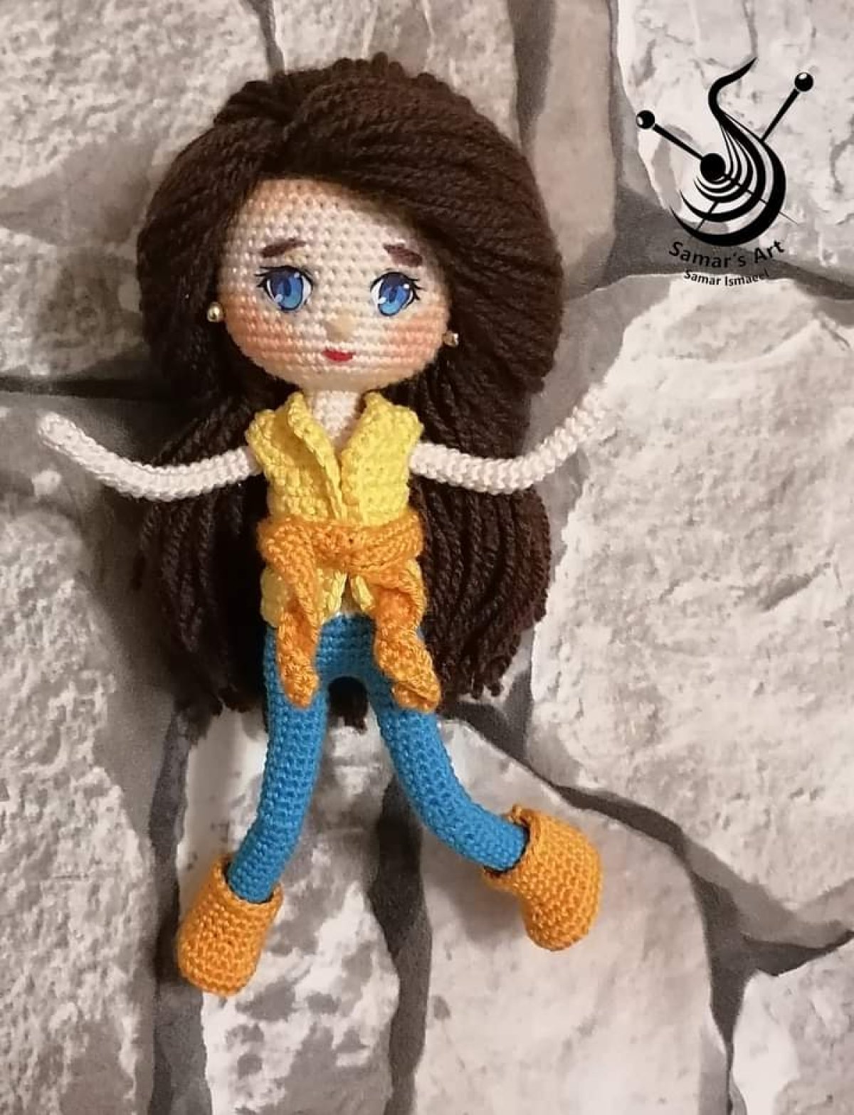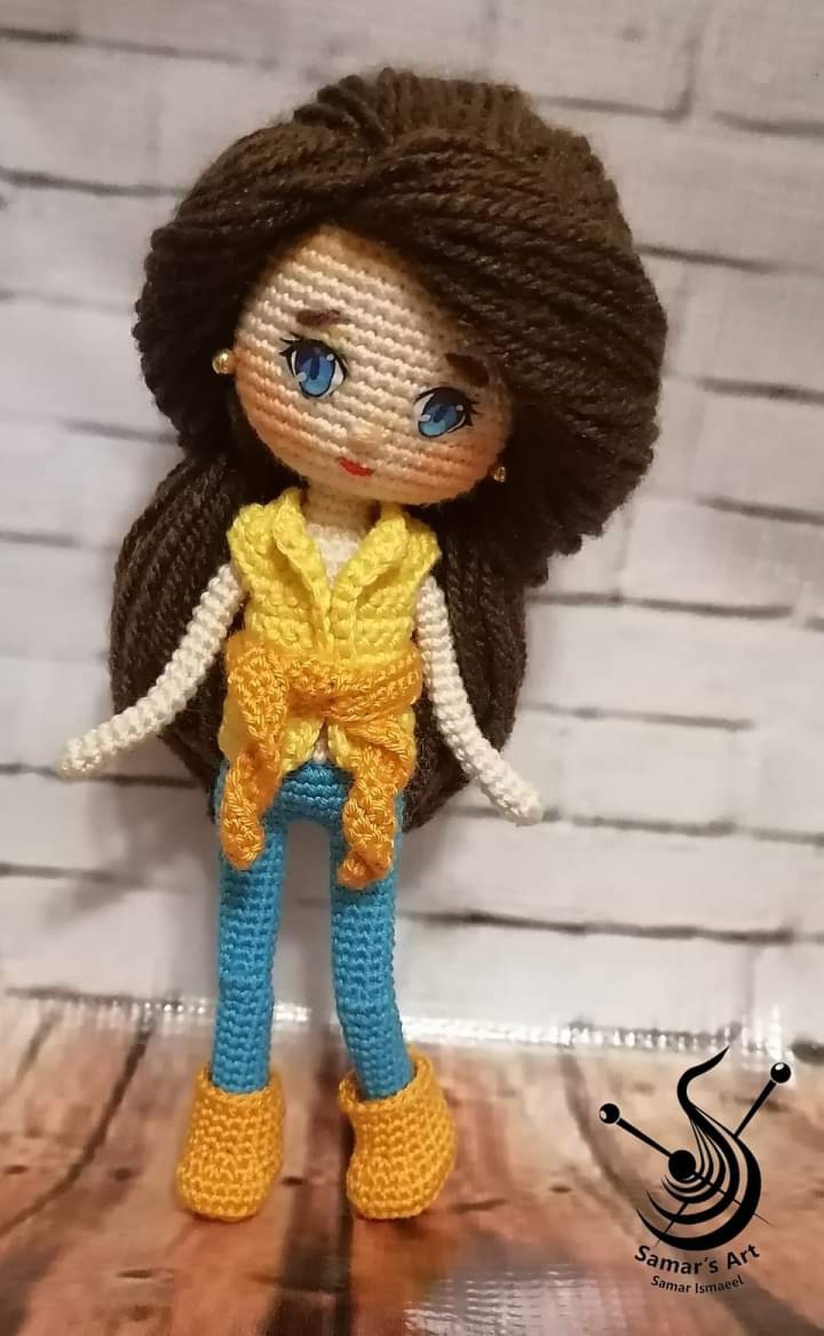 دمية مصنوعة من الكروشيه مقاس ٢٠ سم لها شعر من الخيوط الصوف ومدعمة بسلك من الداخل لسهولة الحركة