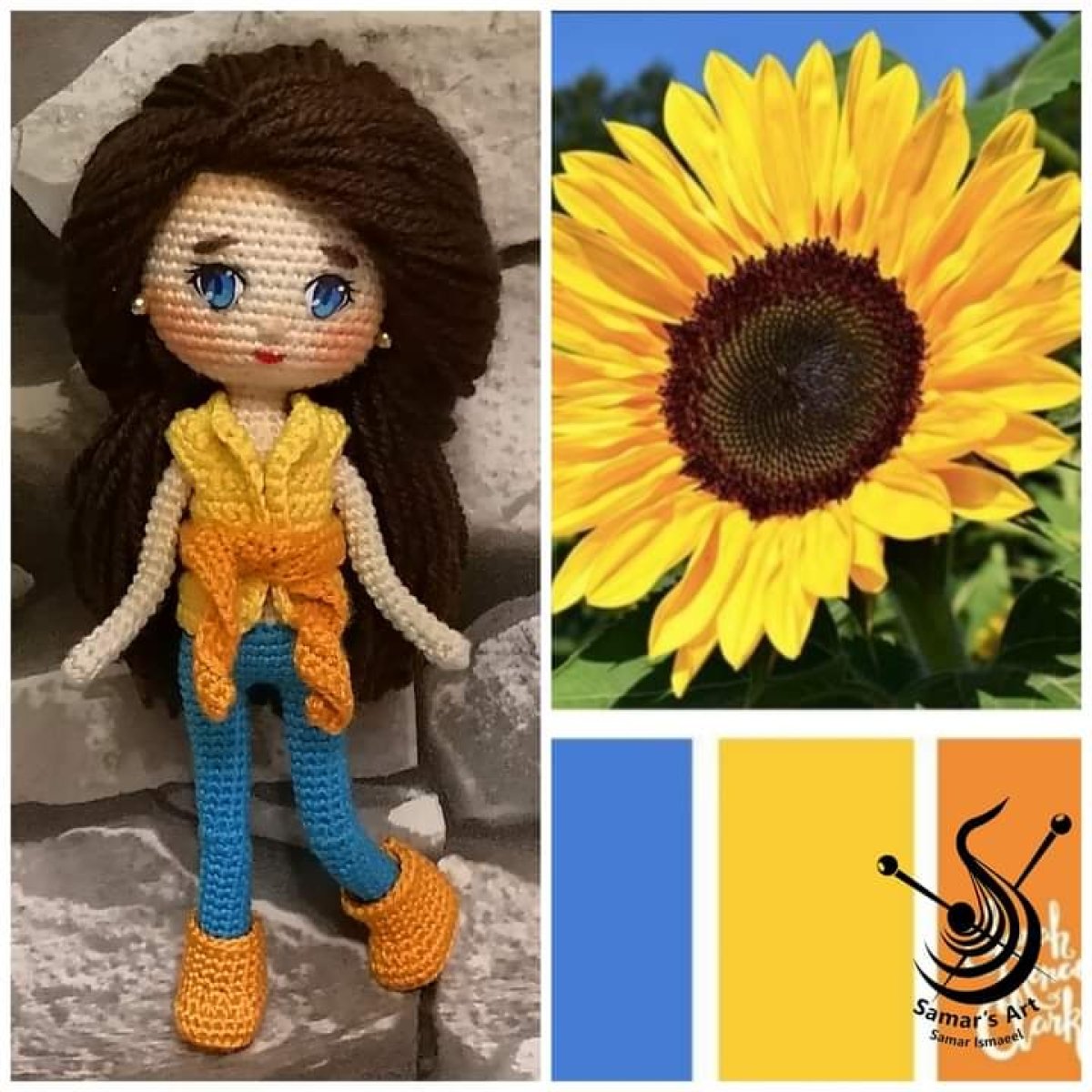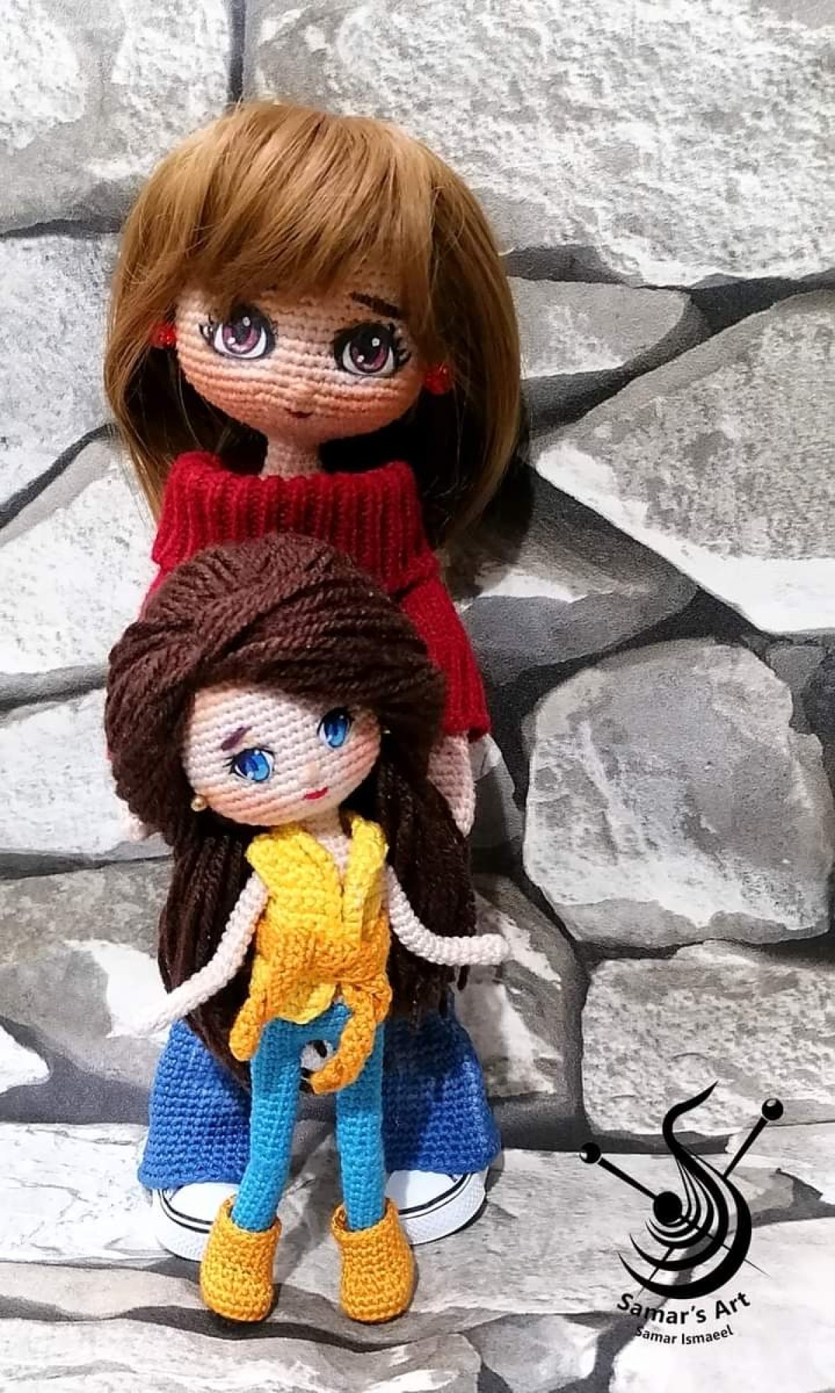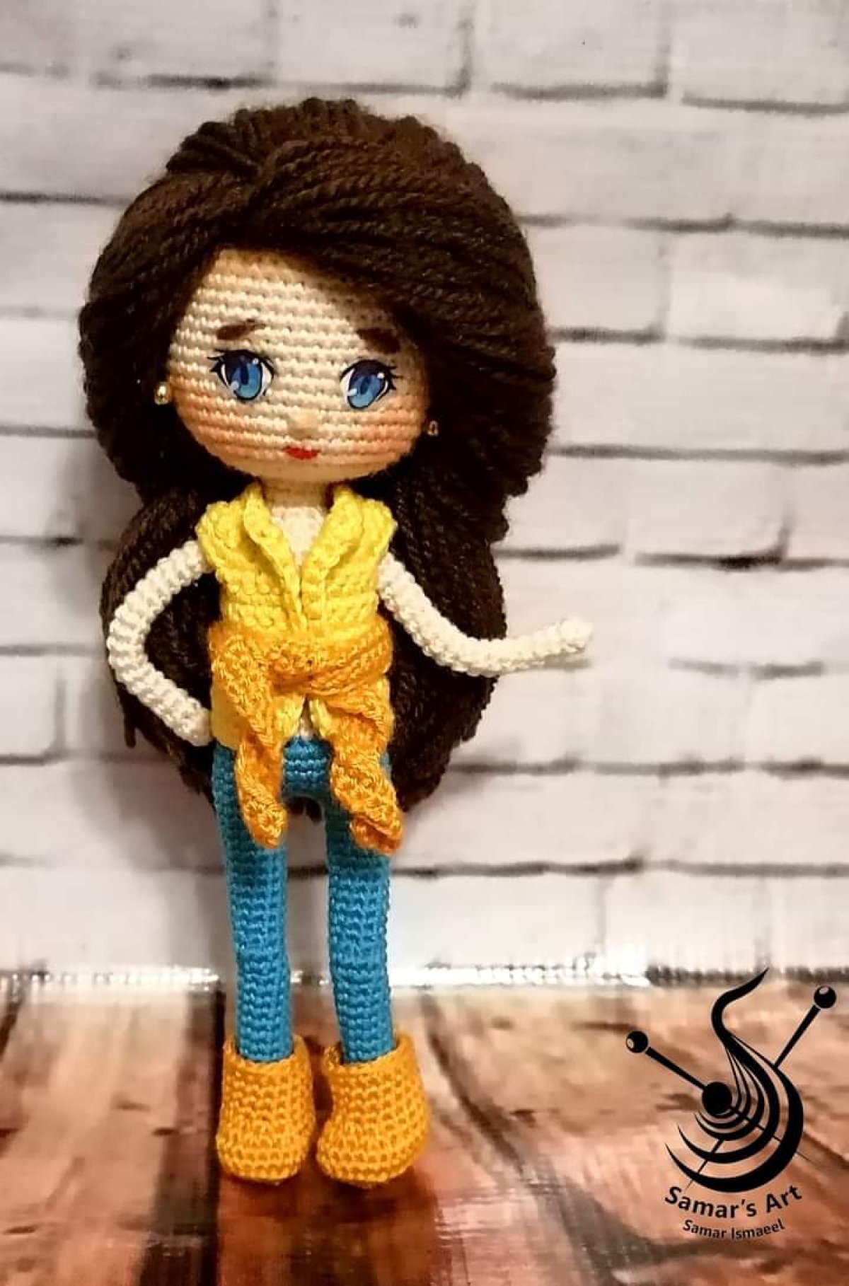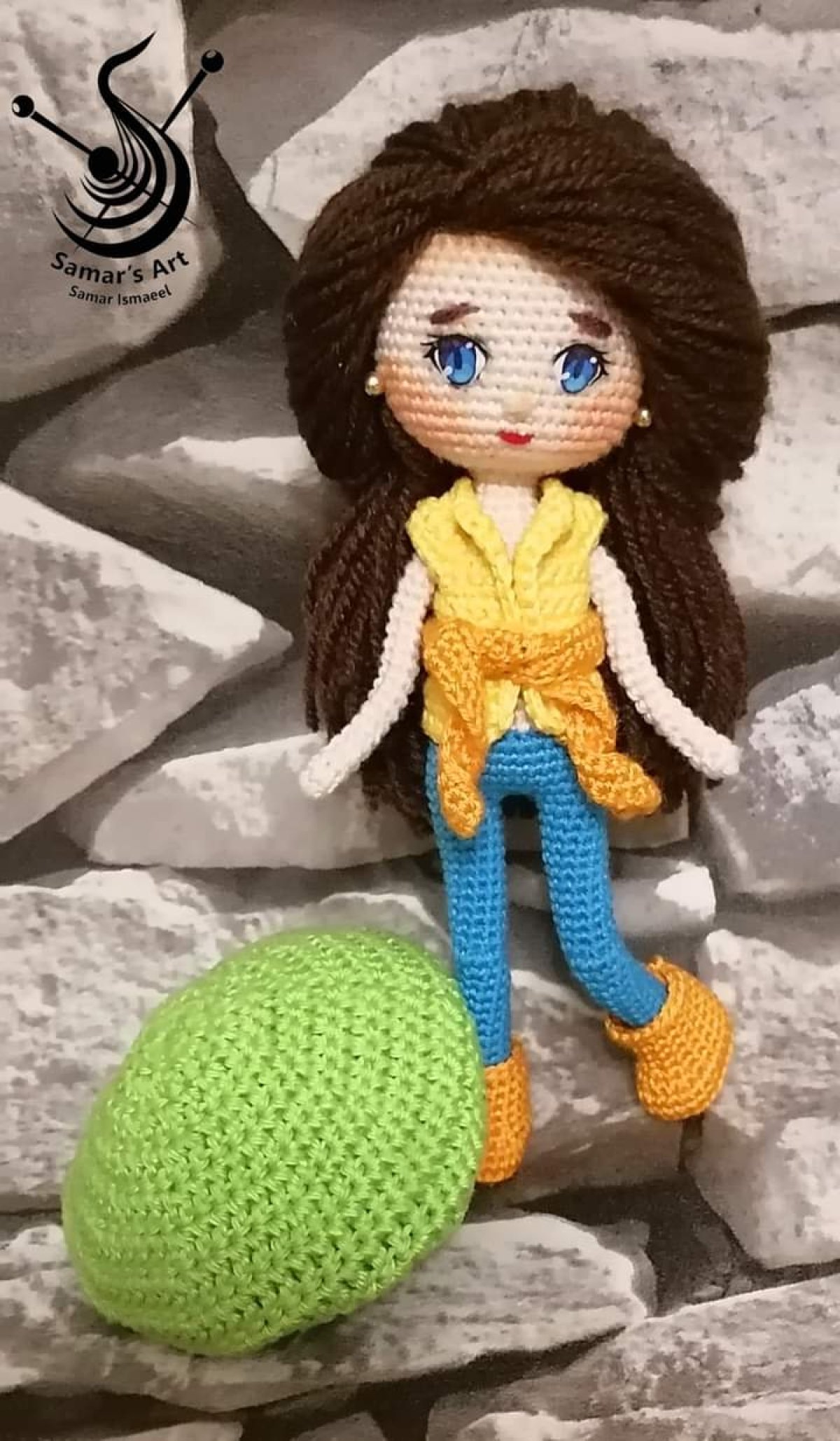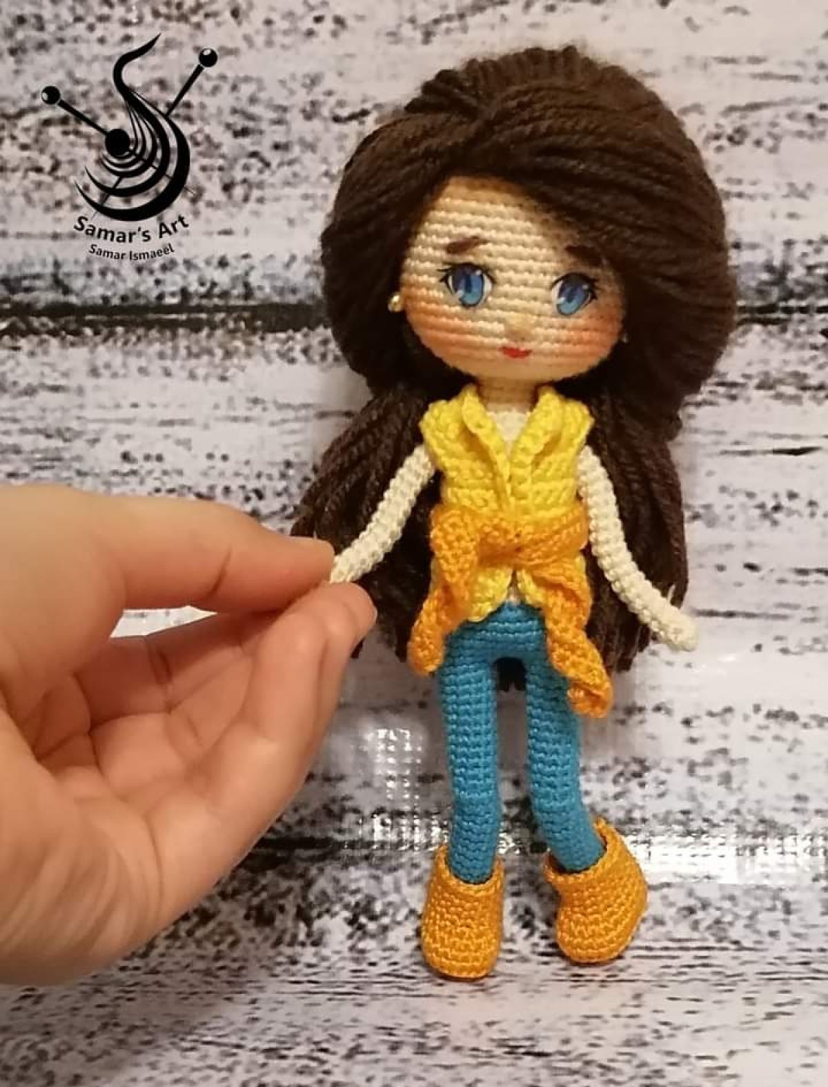 دمية مصنوعة من الكروشيه مقاس ٢٠ سم لها شعر من الخيوط الصوف ومدعمة بسلك من الداخل لسهولة الحركة