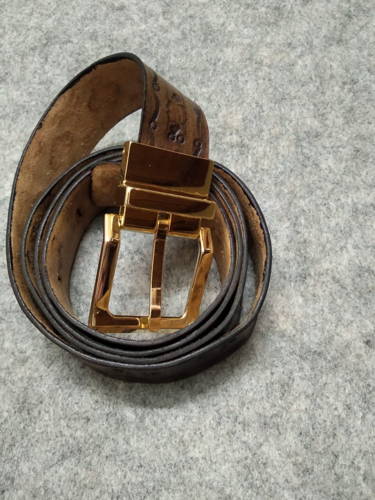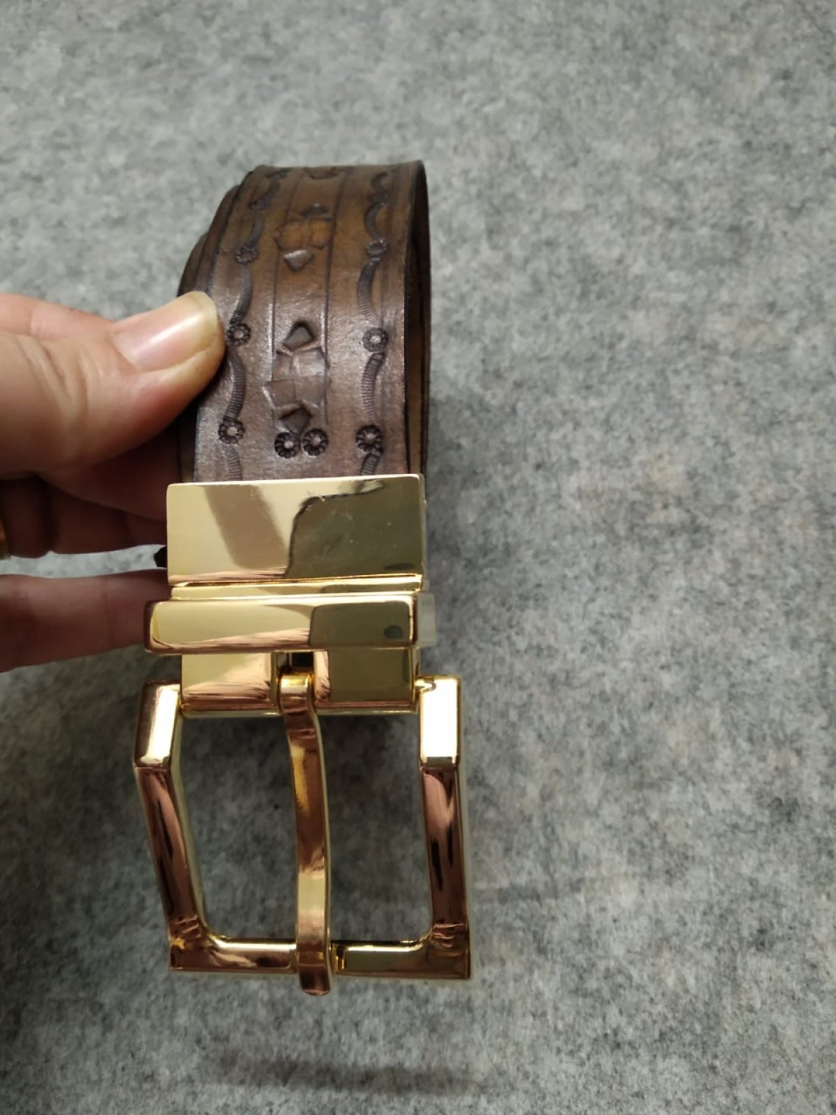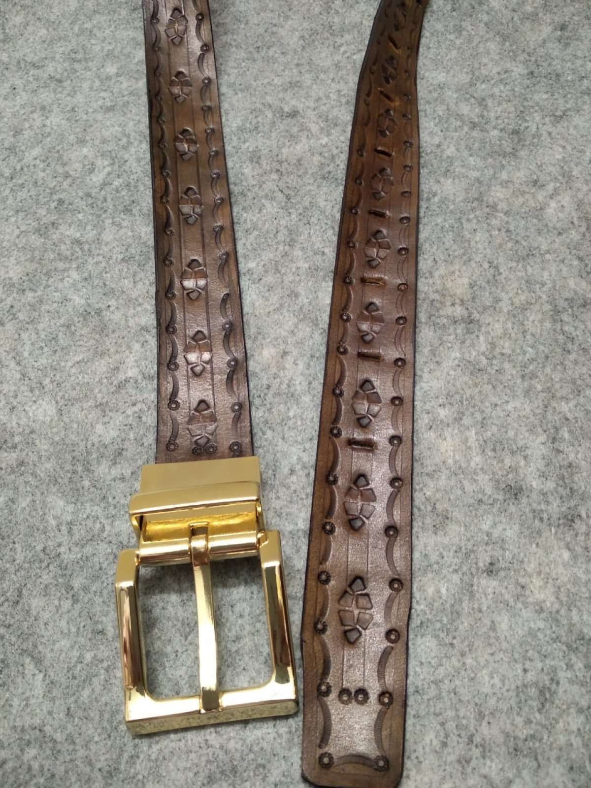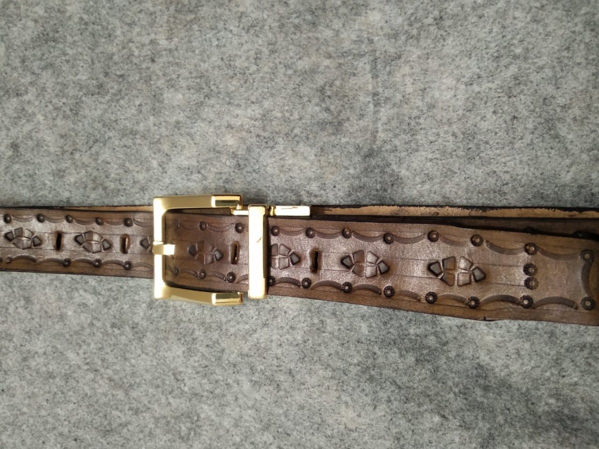 حزام جلد طبيعي (اصلي) نقوش بارزه (حفر ودق )يدوي طول 120سم*3.2سم عرض توكه معدن محمله متاح فضي ودهبي