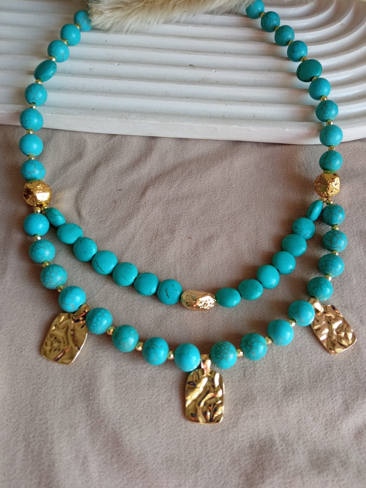 كوليه فيروز مع دلايات ستانلس ستيل و فواصل دهب صيني