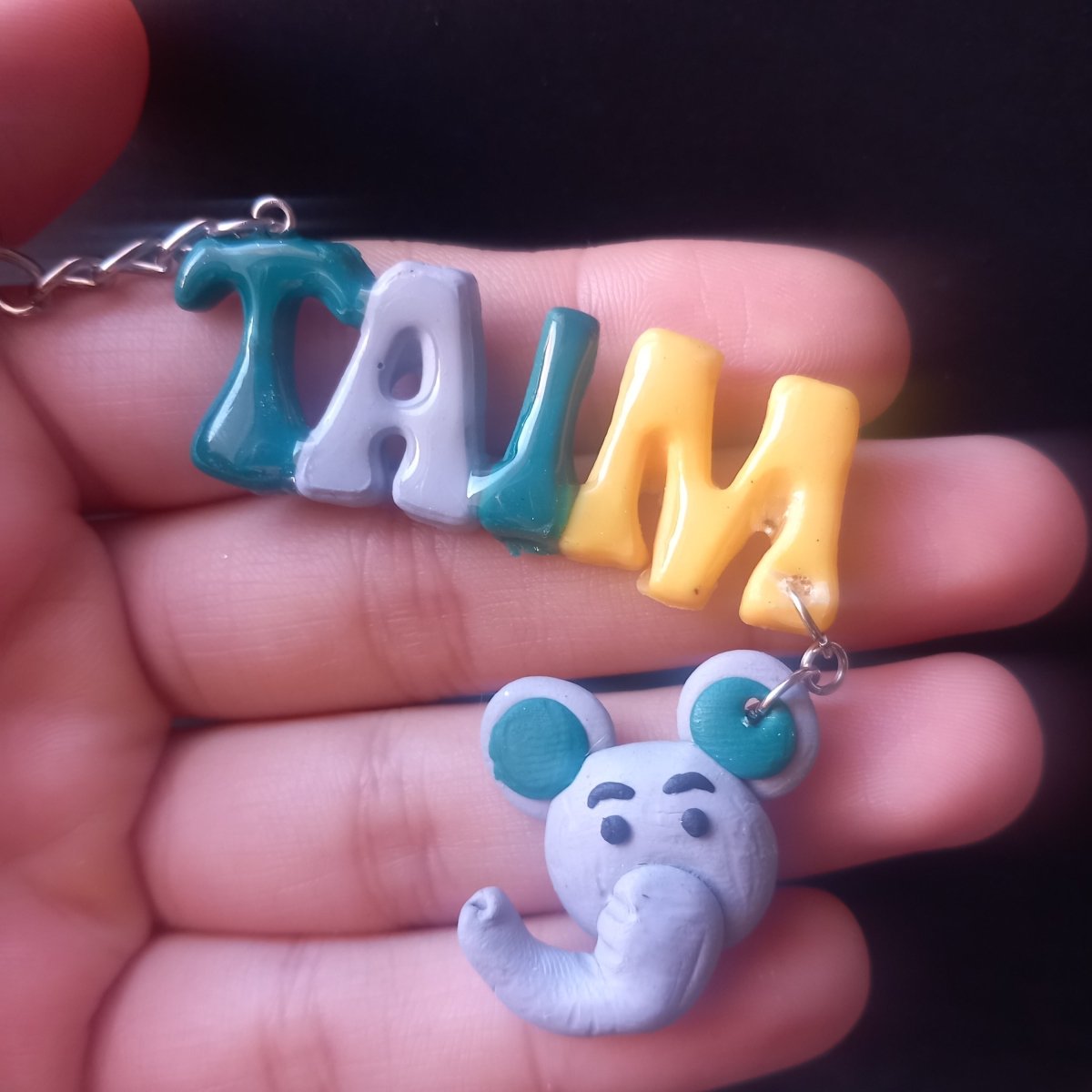 ميدالية بالاسم "تصميم فيل" مصنوعة من الصلصال الحراري ومضاف إليه طبقة من الريزن للحماية وإضفاء مظهر لامع. "متاح التنفيذ بتصميم وألوان من اختيارك "
