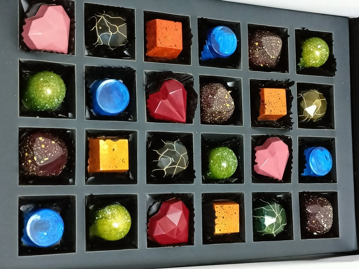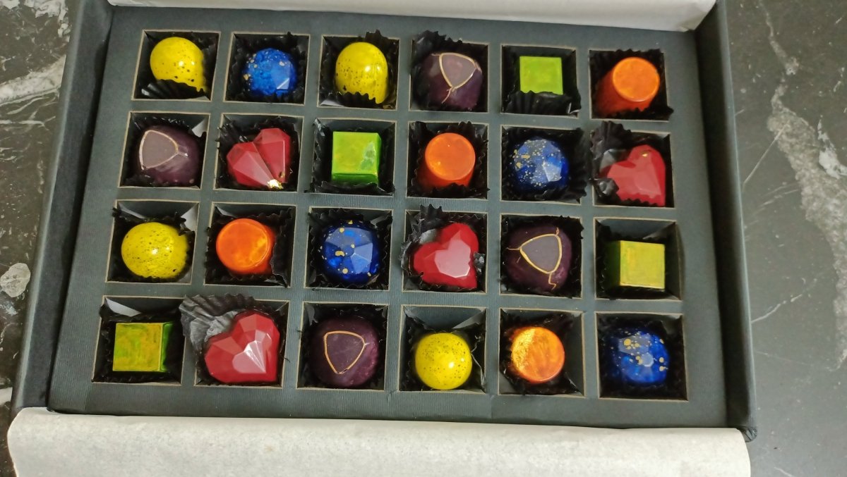 علبة شوكولاته بلجيكي ملونه بزبدة الكاكاو الطبيعيه العلبة تحتوي على ٦ حشوات مميزه كراميل مملح كريمة الشوكولاته كنافة بستاشيو كريمة بندق قهوه شوكولاته بيضا مع لوز مكرمل