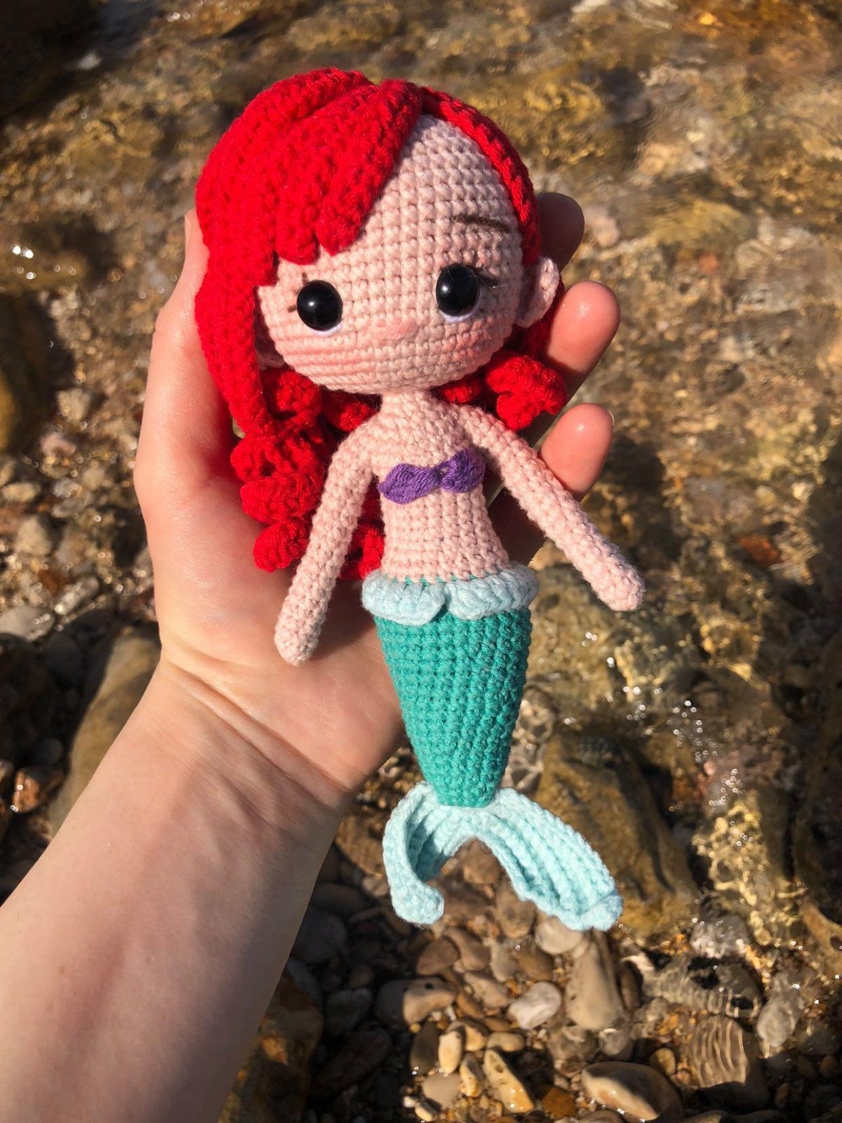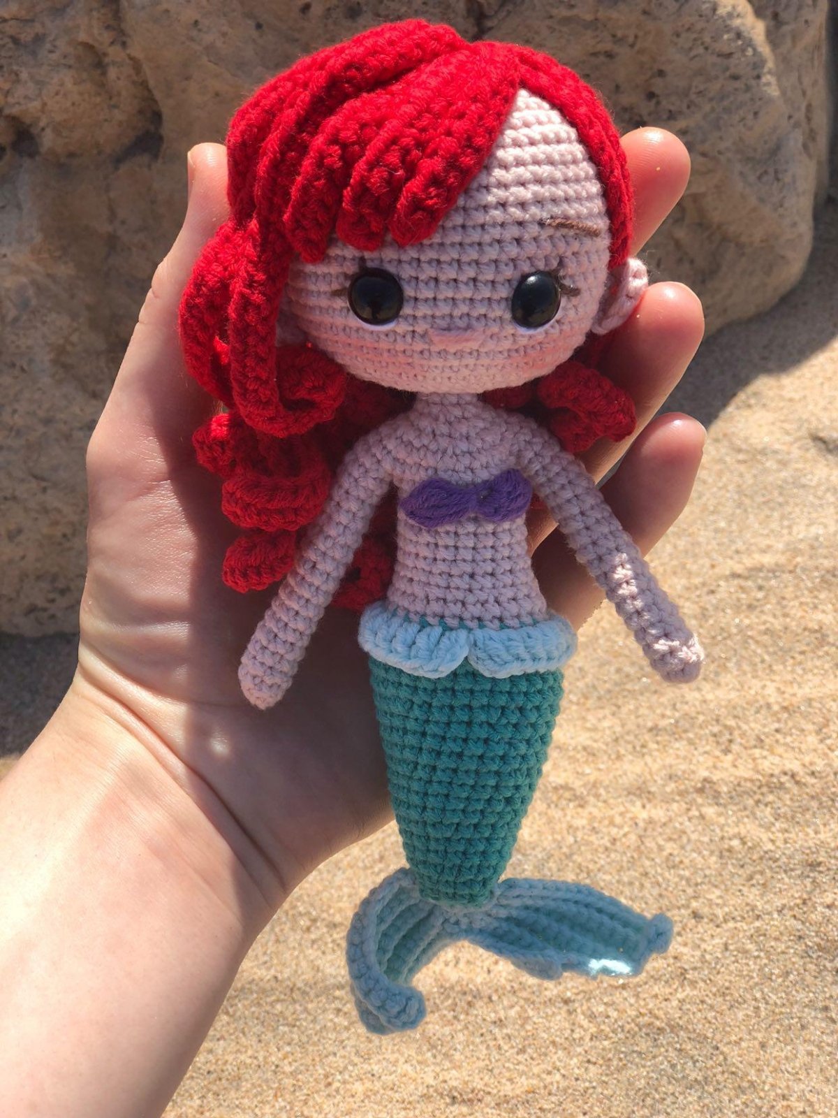 "شخصية أريل من ديزني: هذه الشخصية المصنوعة يدويًا بطول ٢٢ سم من خيط أليز كوتون جولد، ومدعمة بسلك معدني لثبات وقوة أكبر. مثالية كتحفة تزيين أو هدية فريدة لمحبي شخصية أريل من عالم ديزني. مصنوعة بدقة واهتمام بأدق التفاصيل."