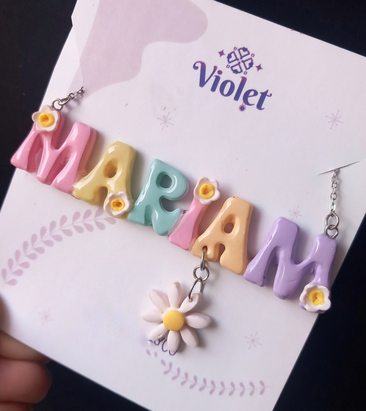 سلسلة بالاسم (تصميم وردة) مصنوعة من الصلصال الحراري ومزينه بوردة الربيع البيضاء. مطليه بطبقة من الريزن من الجهتين للحماية وإضفاء مظهر لامع.مع أجزاء من المعدن مصنوعة من الاستانلس ستيل غير قابلة للصدأ ولا تسبب حساسية. الطول (٢٢سم) "متاح تنفيذ بأي ألوان تحبوها ومع عناصر من اختياركم "