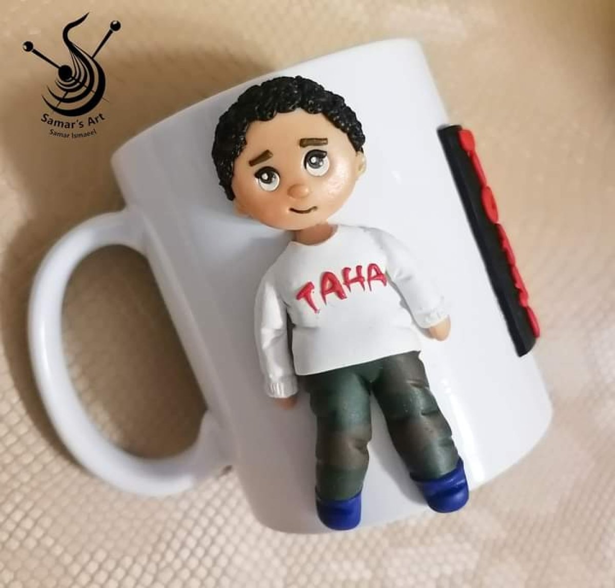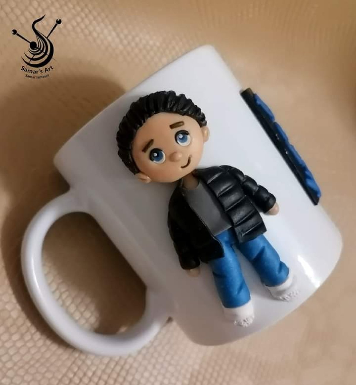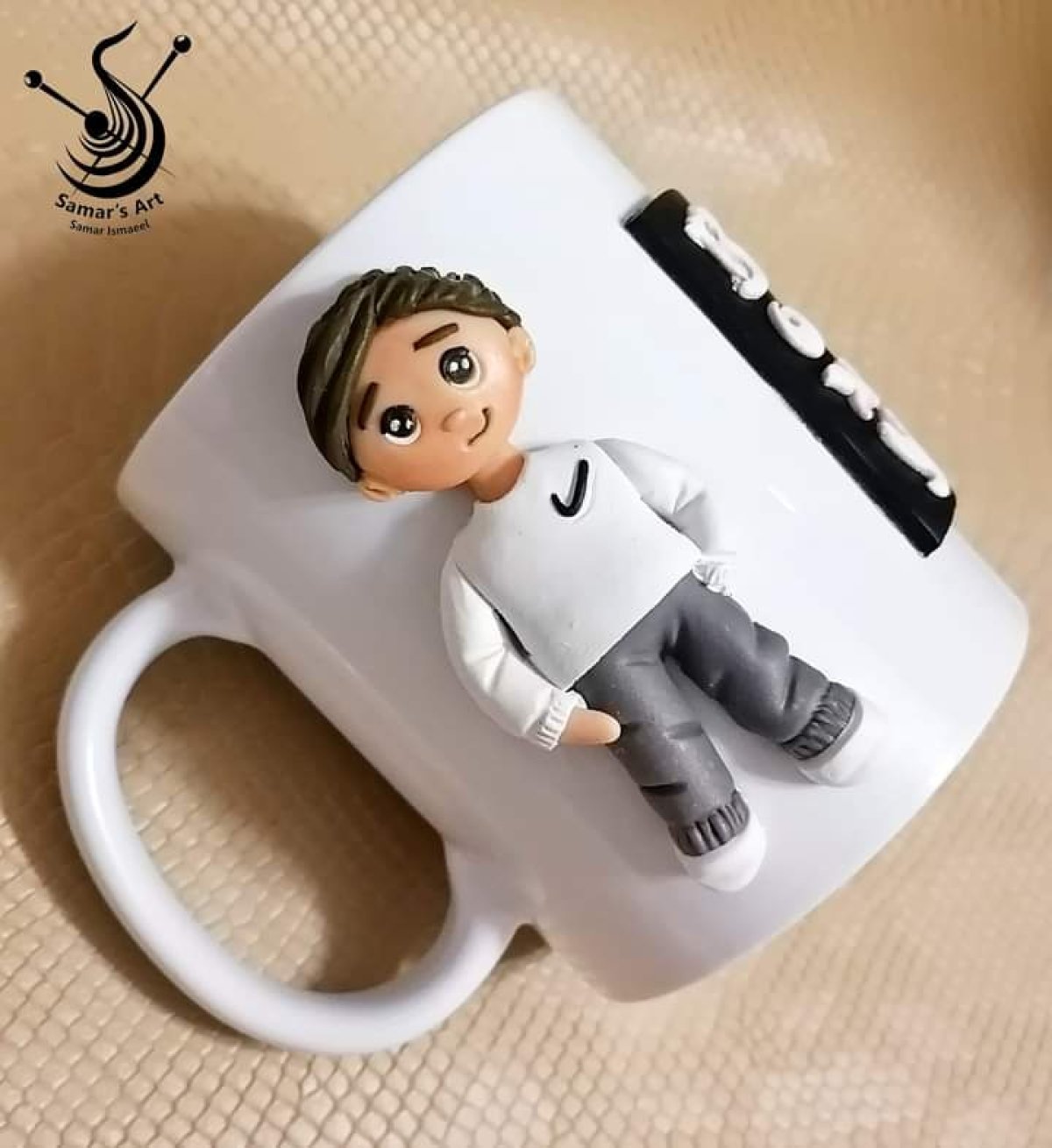 مج مزين بالصلصال الحراري ومتاح كتابة الاسم عليه وقابل للغسيل بالماء البارد ولا يدخل غسالة الأطباق ولا الميكروييف