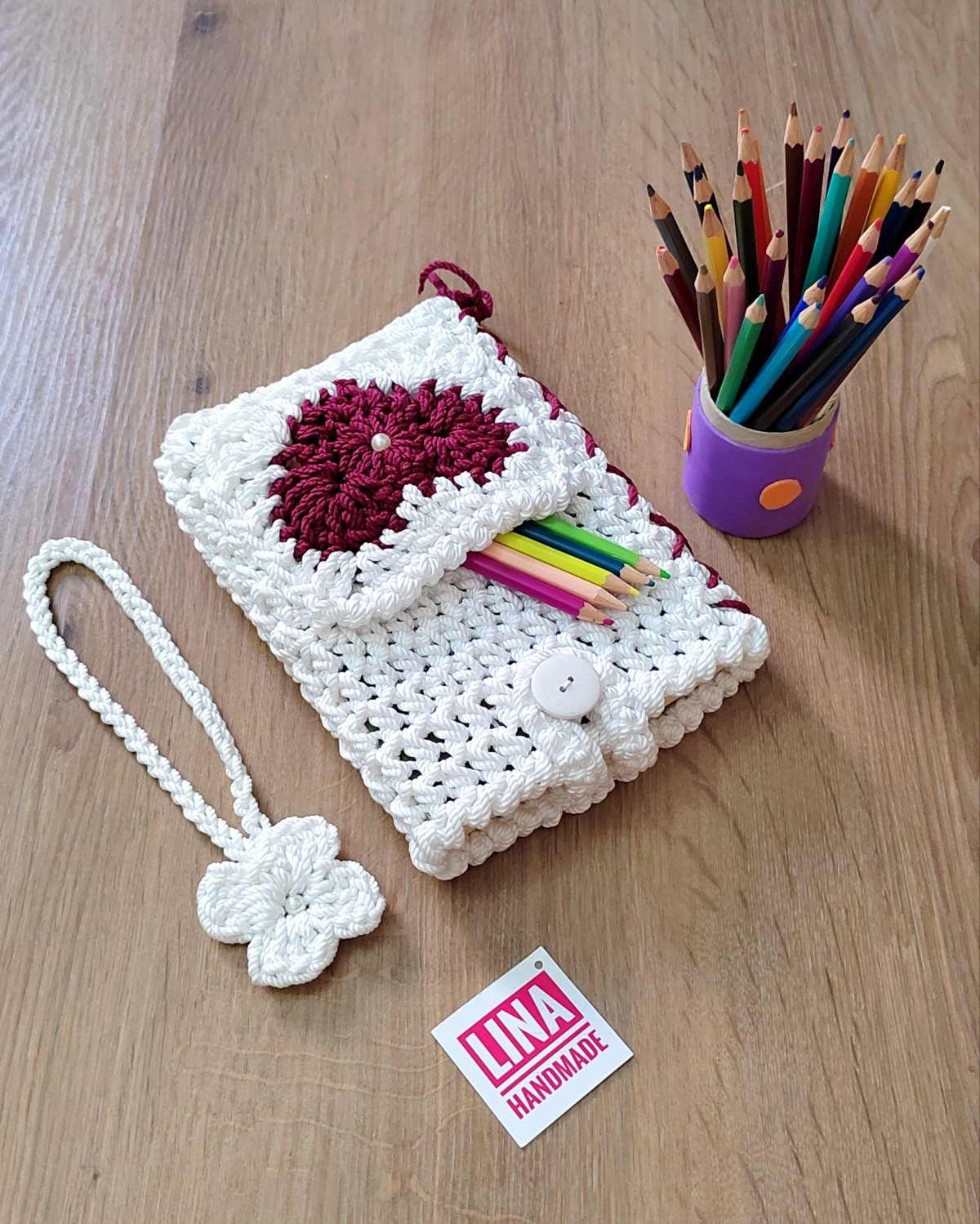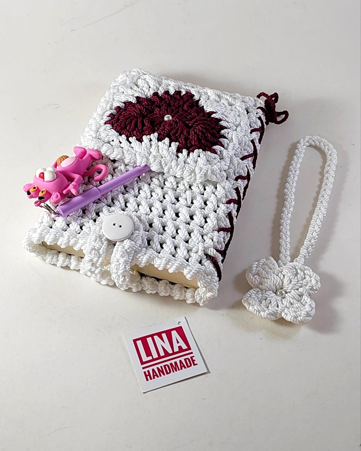 غلاف كتاب كروشيه مشغول يدويا بخيط المكرمية المصري. الخامة: الياف صناعية المقاس: 20x15 السمك الجانبي : 3 سم متاح تنفيذه بالطلب بالوان ومقاسات مختلفة