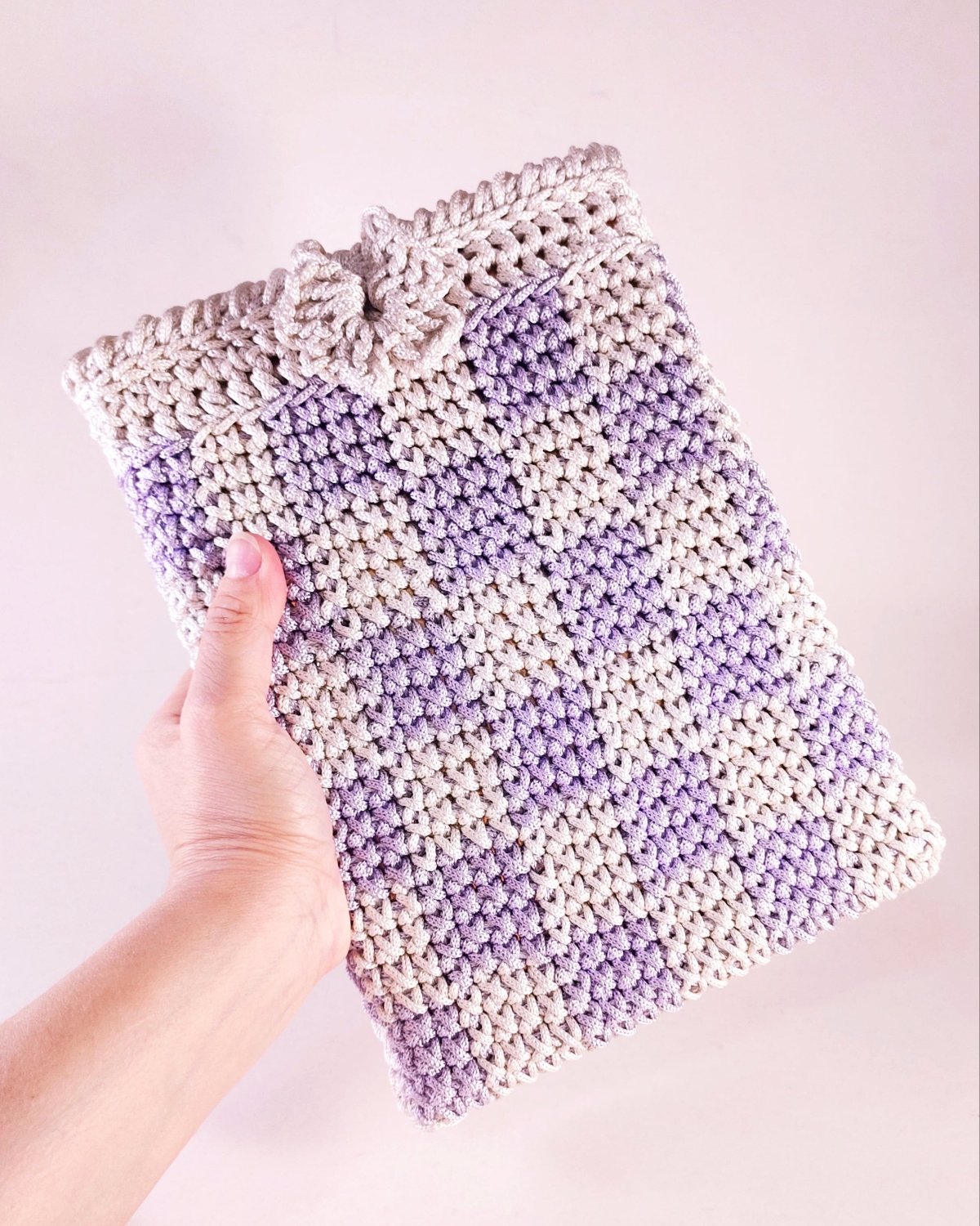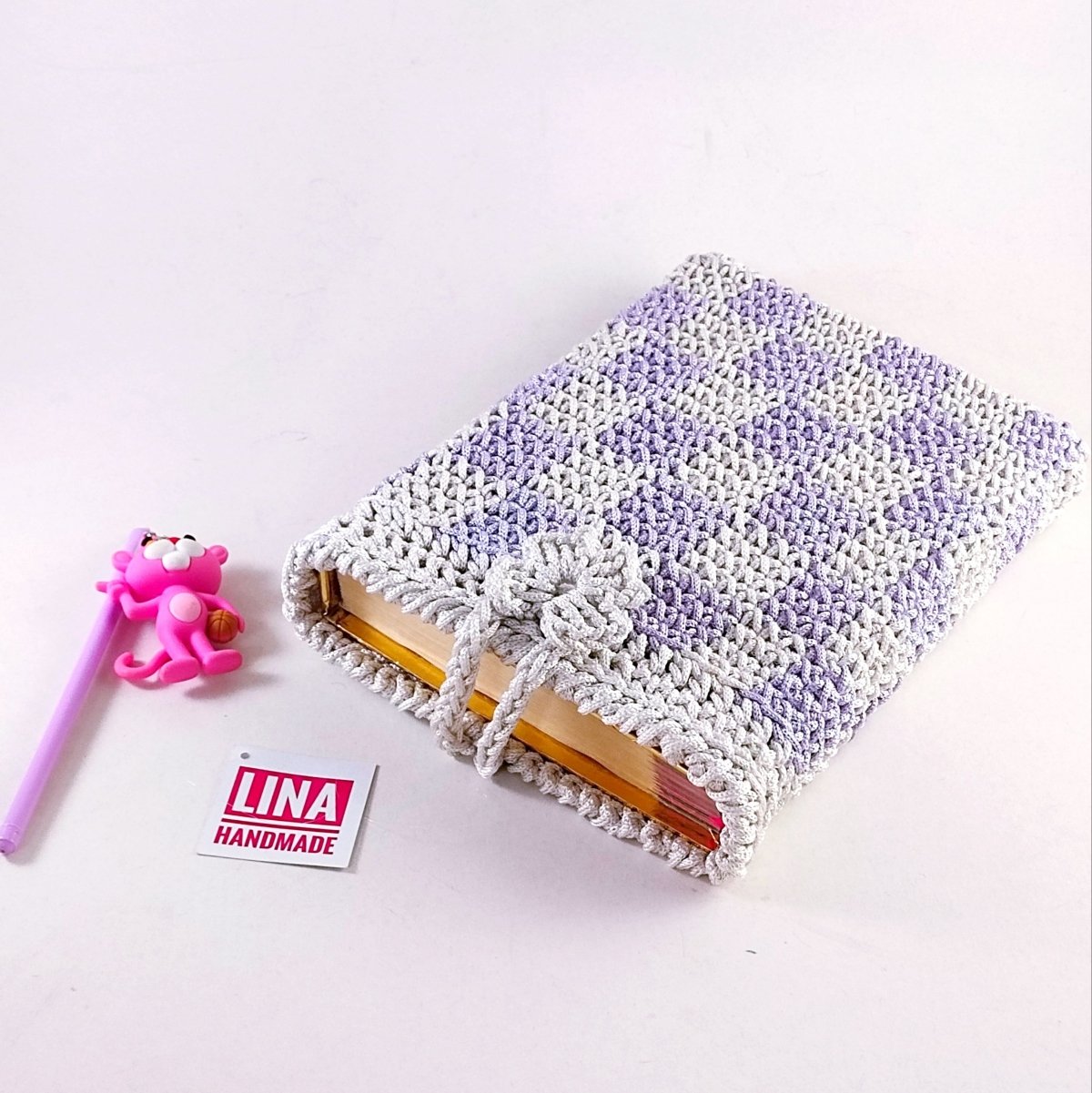 غلاف كتاب كروشيه مشغول يدويا بخيط المكرمية المصري. الخامة: الياف صناعية المقاس: 20x15 السمك الجانبي : 3 سم متاح تنفيذه بالطلب بالوان ومقاسات مختلفة