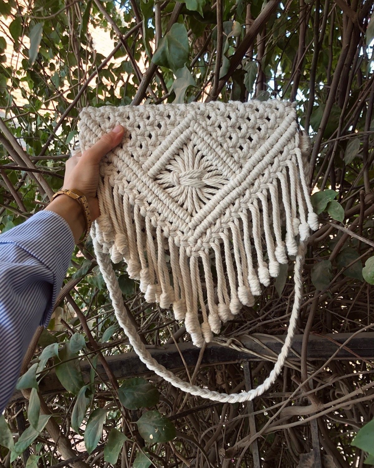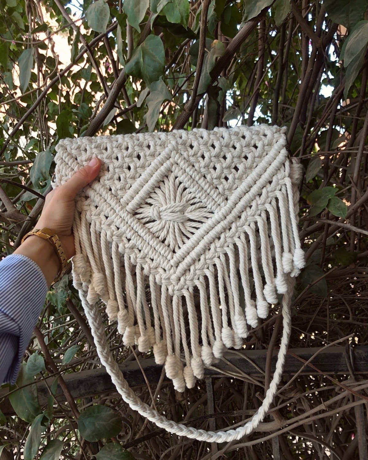 شنطة مكرميه مصنوعه يدويا، باعلي جودة ، قطن ١٠٠٪؜ مع حزام ١٠٠سم