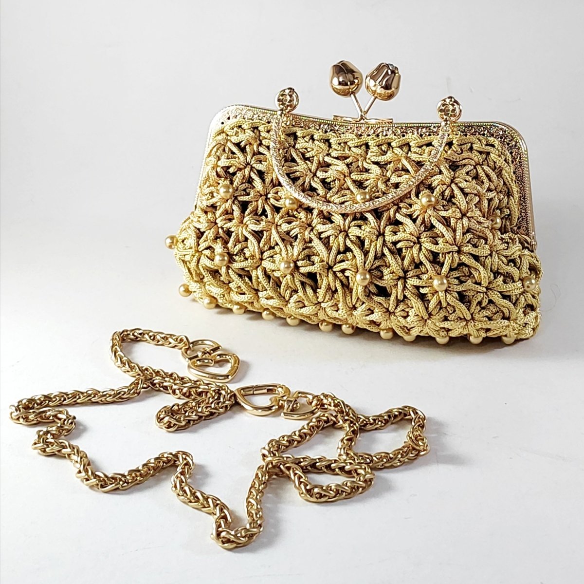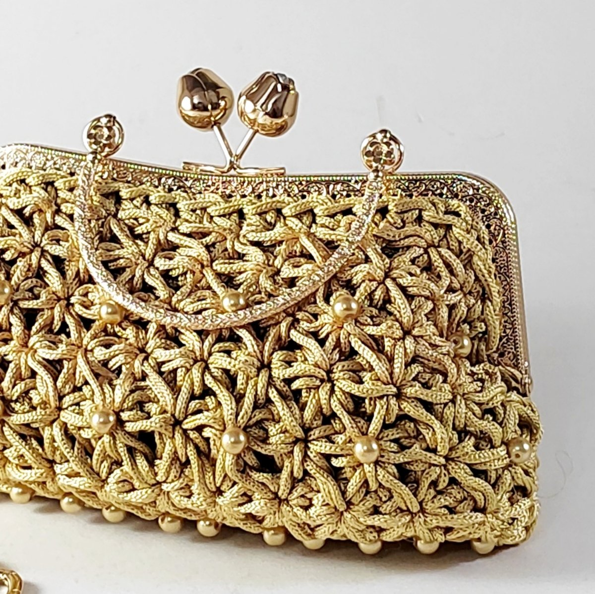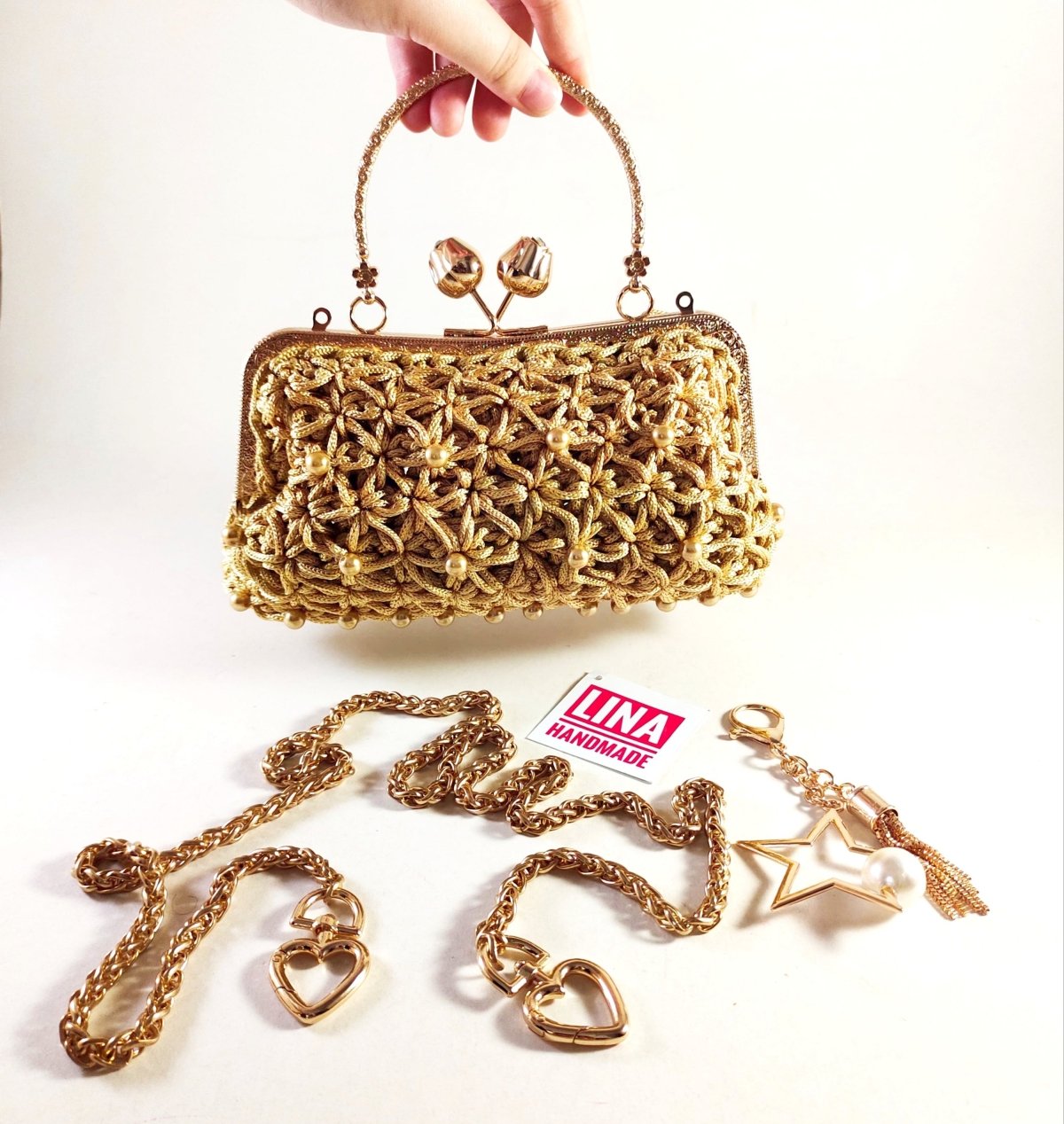 "شنطة كروشيه أنيقة مطرزة بحبات اللؤلؤ الذهبي، تتميز بأناقتها وسحرها! 🌸👜 تصميمها الرائع وتفاصيلها تجعلها قطعة مميزة ومثالية للحفلات. ✨ مع هذه الشنطة، ستلفتين الأنظار وسيلاحظك الجميع. كوني مميزة وأنيقة! متاح تنفيذها بالطلب بالوان مختلفة لترضي ذوقك. ❤️